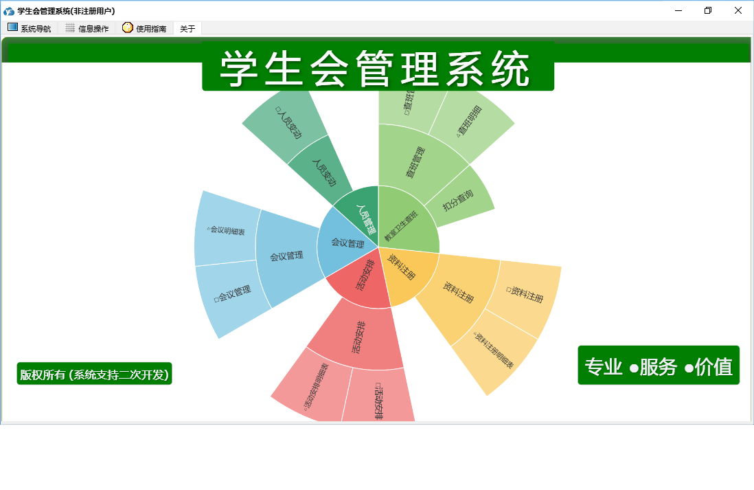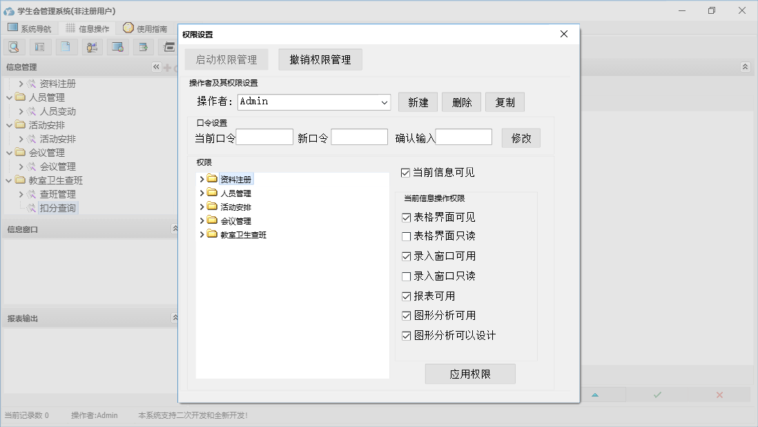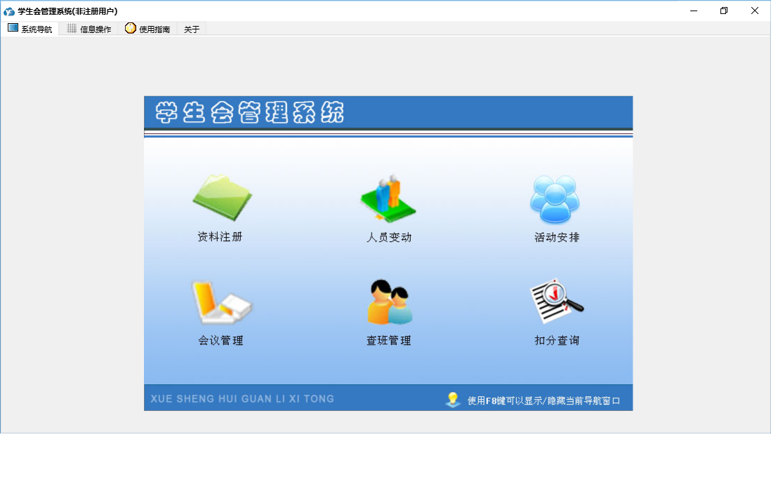 学生会管理系统包含以下功能:面板、会议管理、资料注册、人员变动、日志、关于、权限设置、活动安排、查班管理等