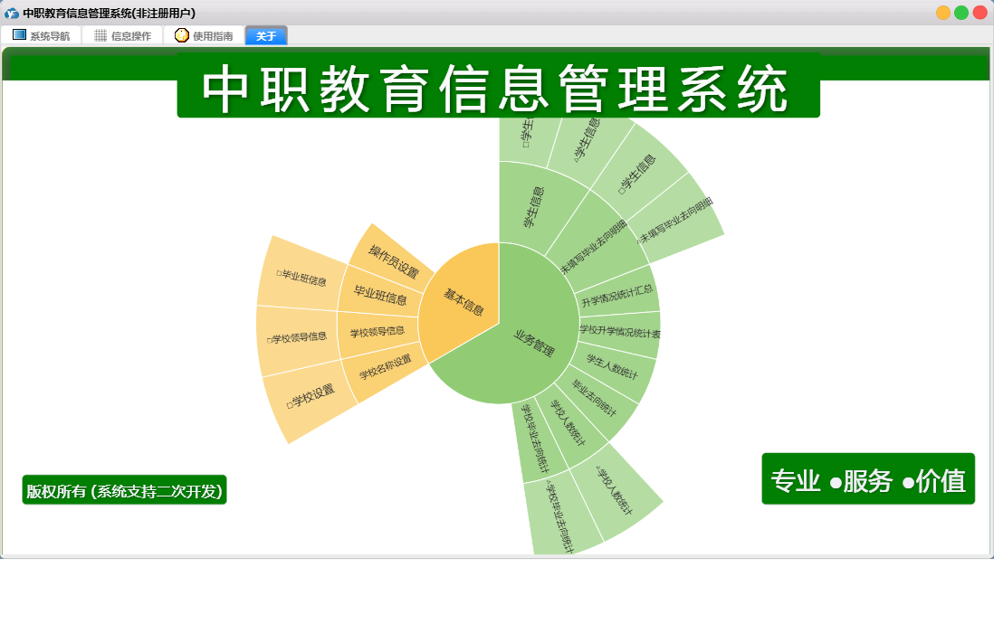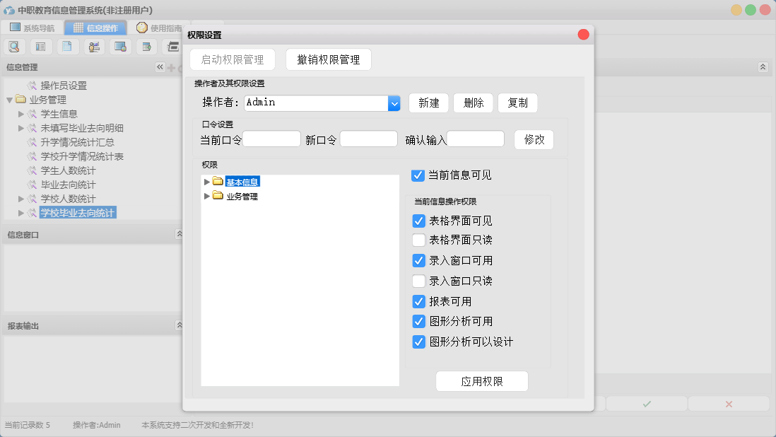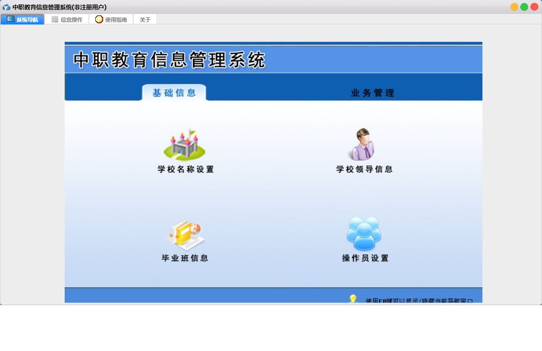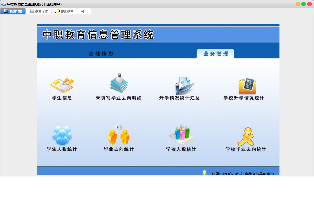 中职教育信息管理系统包含以下功能:学校领导信息、学校名称设置、毕业班信息、学生信息、日志、关于、权限设置、基本信息、未填写毕业去向明细、业务管理等
