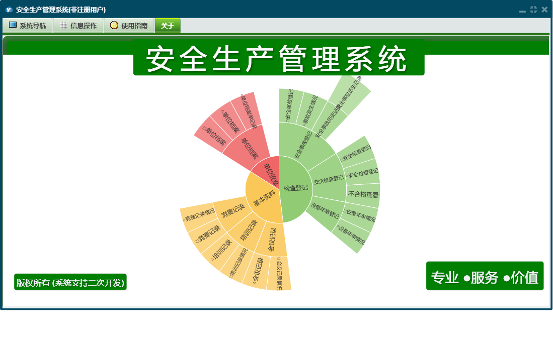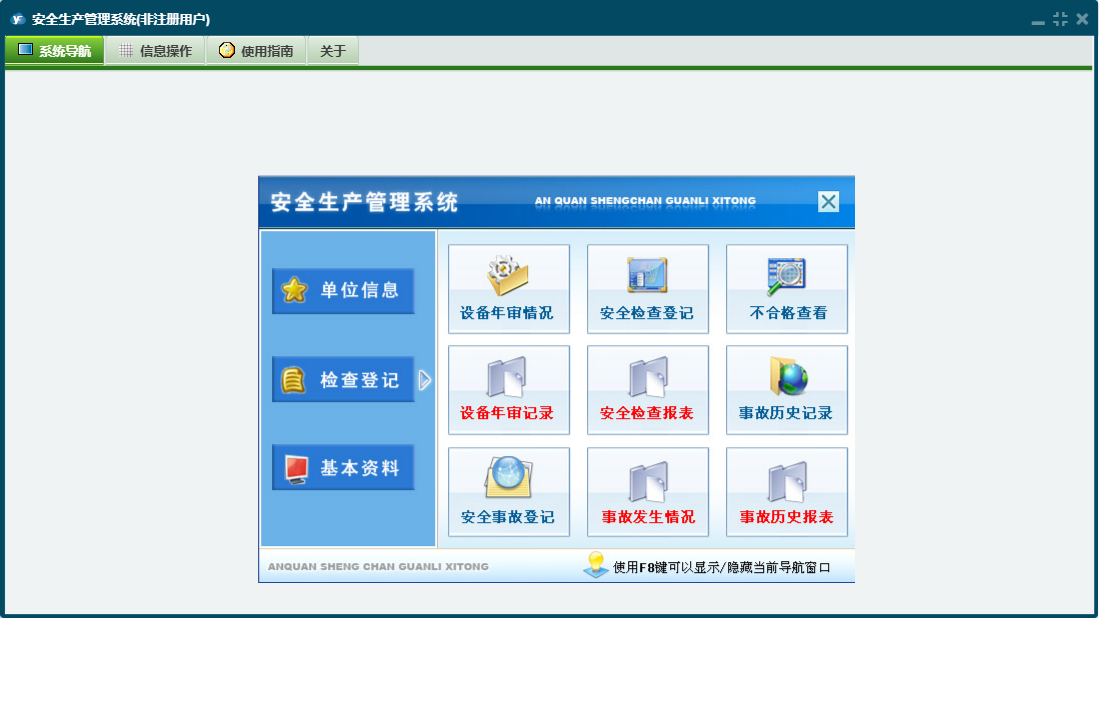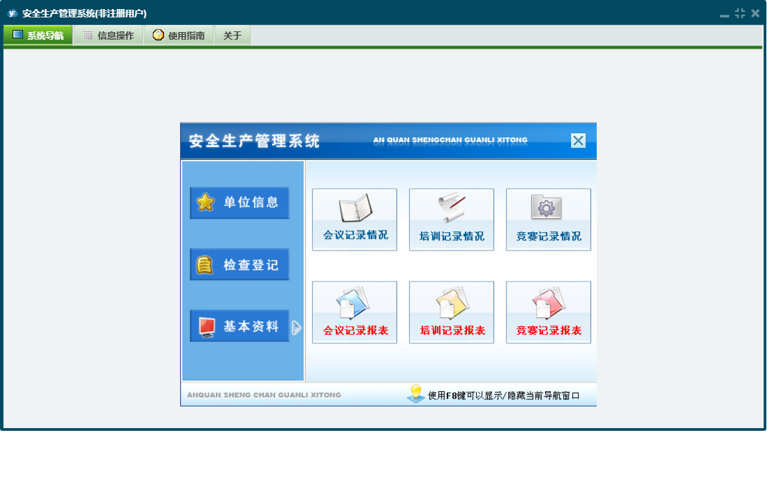 安全生产管理系统包含以下功能:培训记录、安全事故登记、检查登记、单位信息、基本资料、单位档案、会议记录、日志、设备年审登记、关于、权限设置、竞赛记录、安全检查登记等