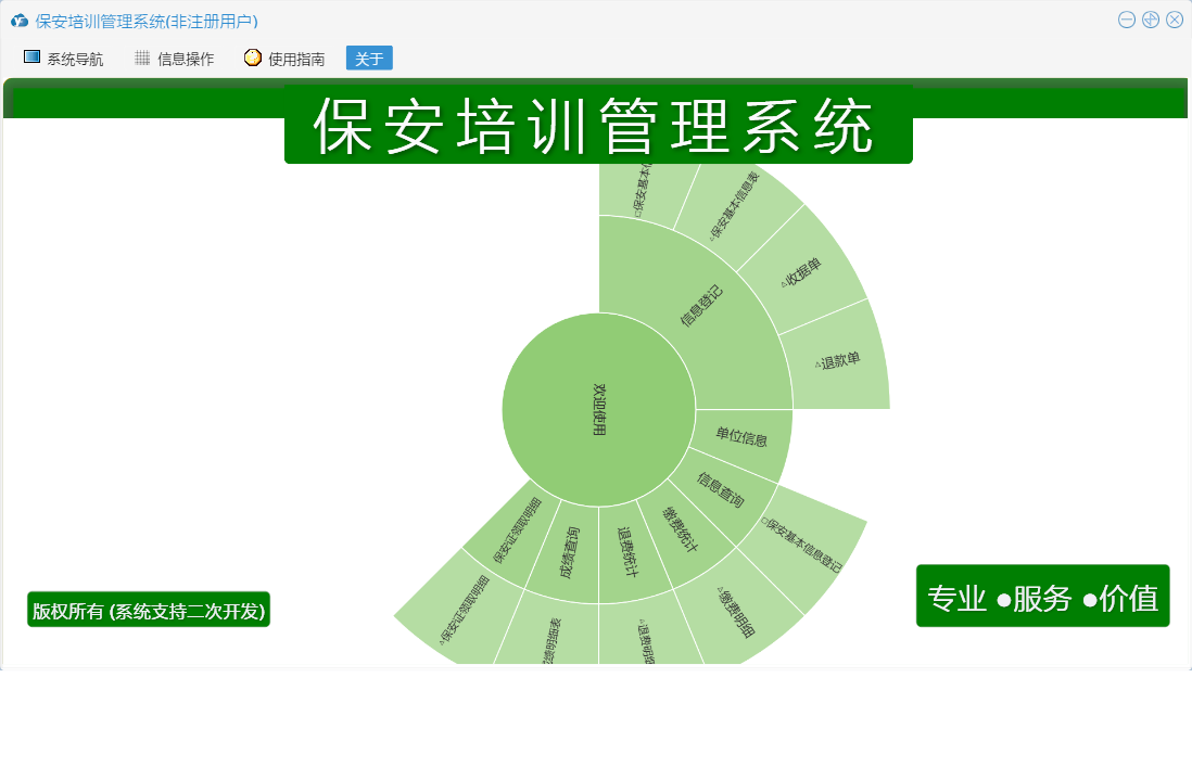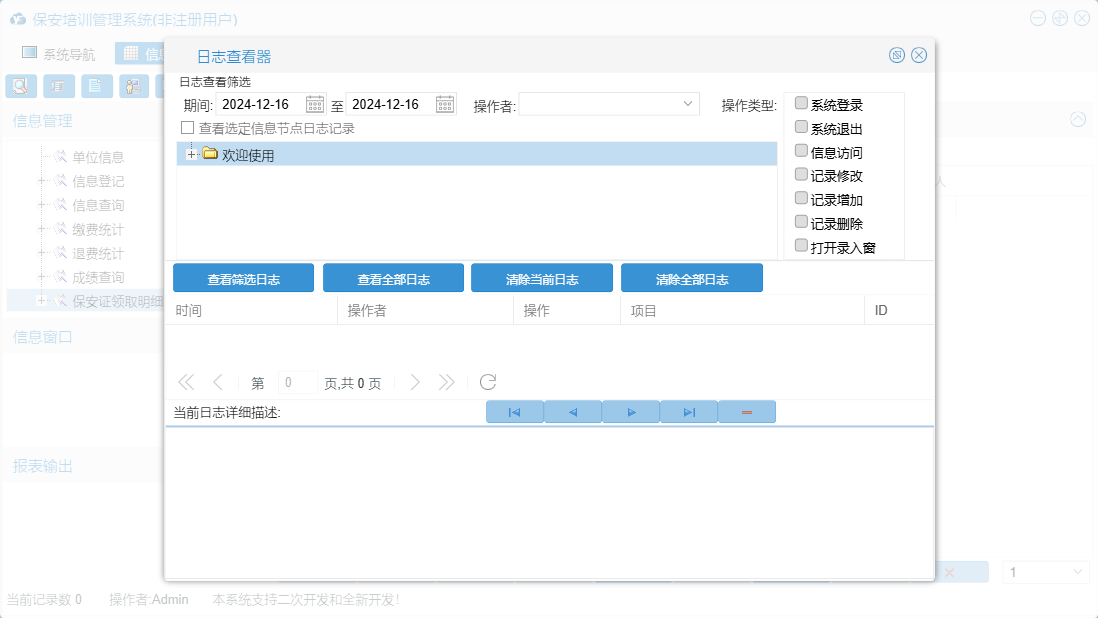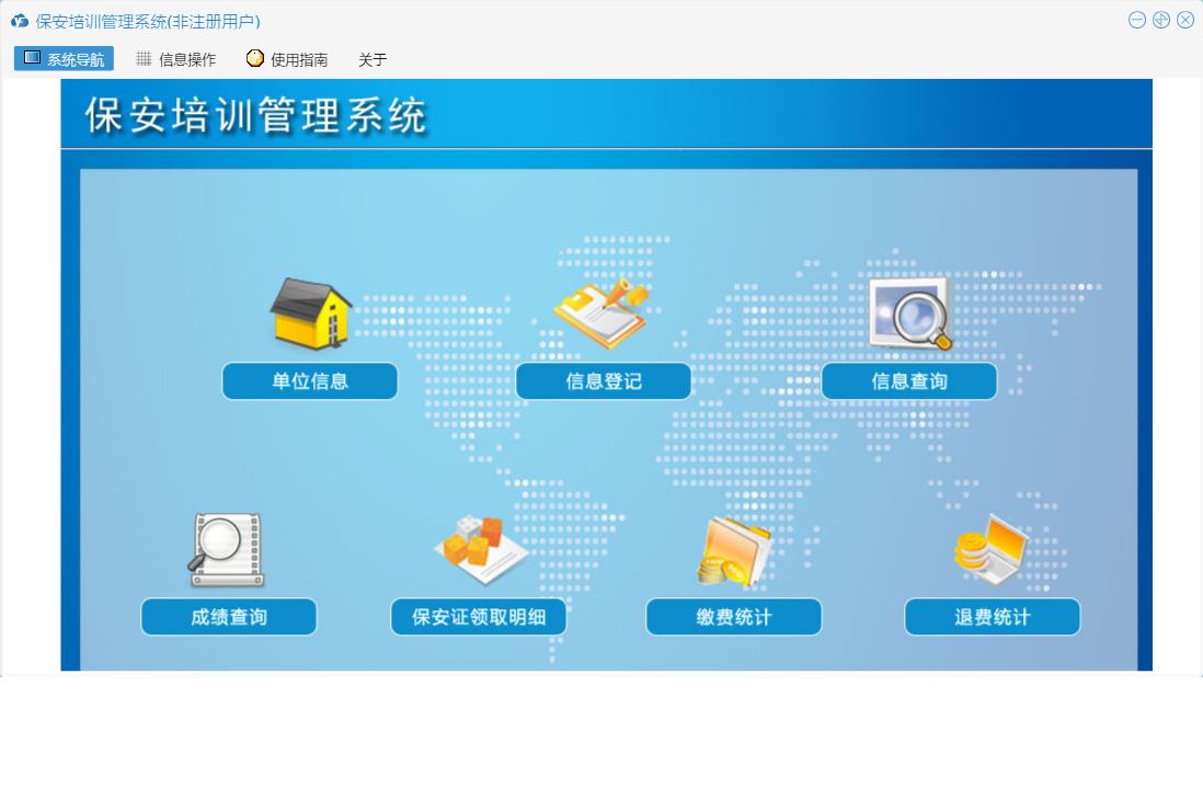 保安培训管理系统包含以下功能:信息登记、面板、日志、关于、权限设置、信息查询等