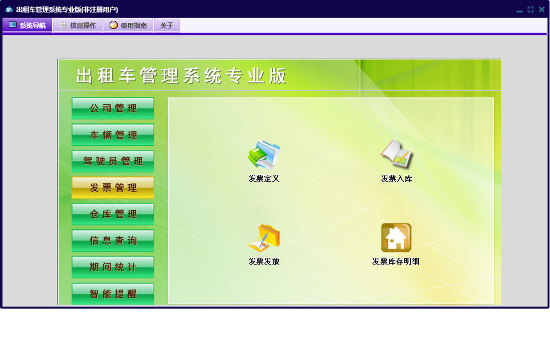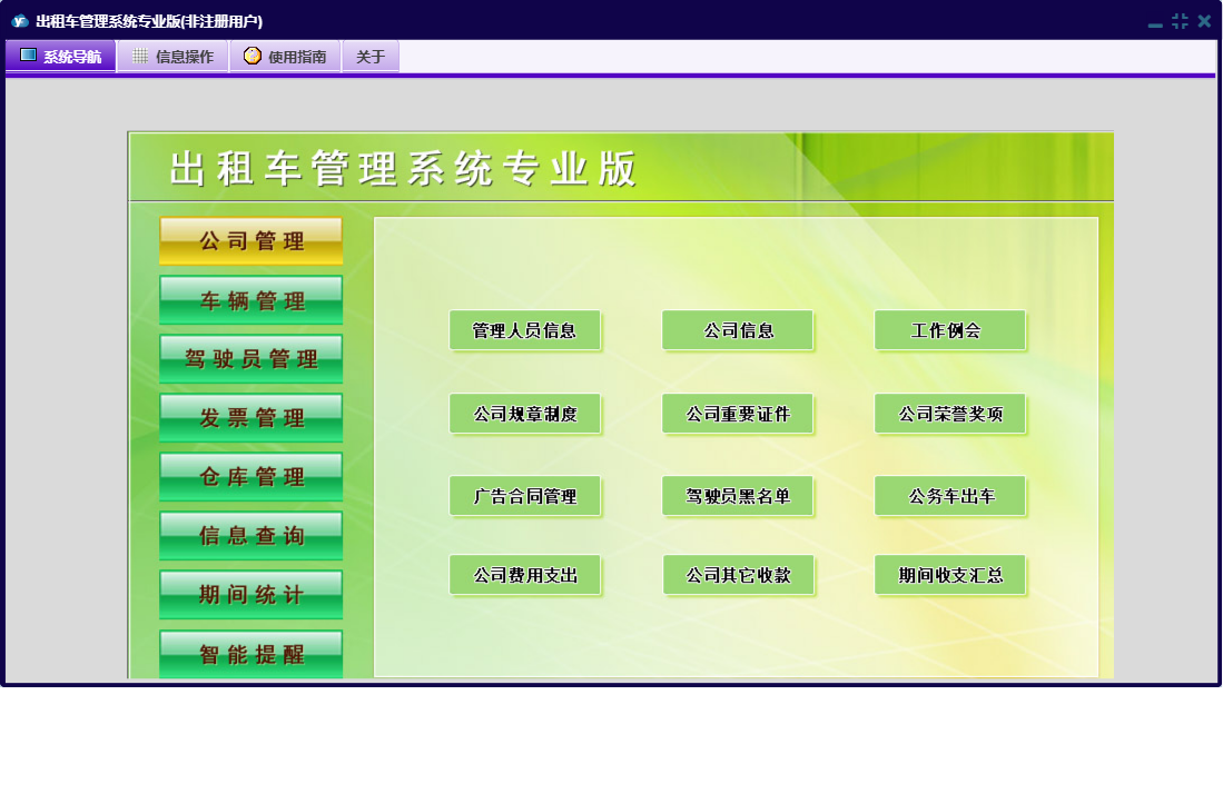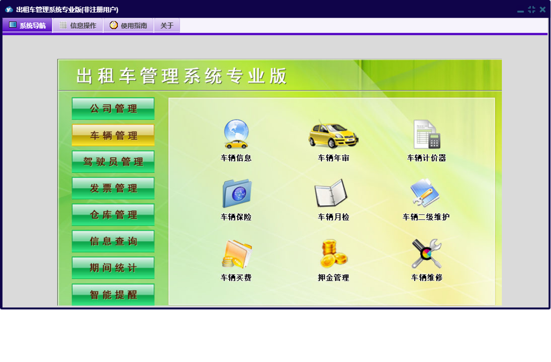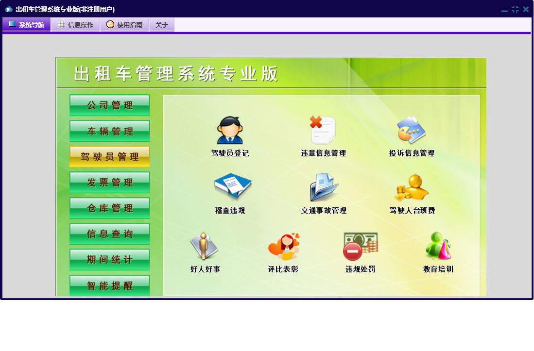出租车管理系统专业版包含以下功能:好人好事、评比表彰、公司荣誉奖项、驾驶员登记、工作例会、发票管理、车辆买费、投诉信息管理、车辆管理、教育培训、公司费用支出、车辆二级维护、驾驶人台班费、驾驶员黑名单、违规处罚、车辆月检、广告合同管理、商品信息、公司信息、权限设置、发票定义、车辆年审、信息查询、商品出库、公司管理、押金管理、发票入库、商品入库、智能提醒、公务车出车、仓库管理、关于、稽查违规、交通事故管理、公司重要证件、发票发放、管理人员信息、车辆信息、车辆计价器、期间统计、违章信息管理、公司规章制度、日志、车辆维修、驾驶员管理、车辆保险、公司其它收款等