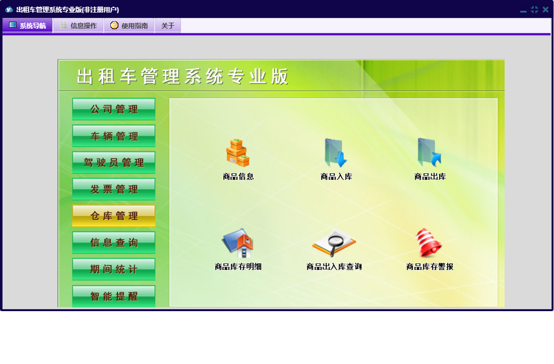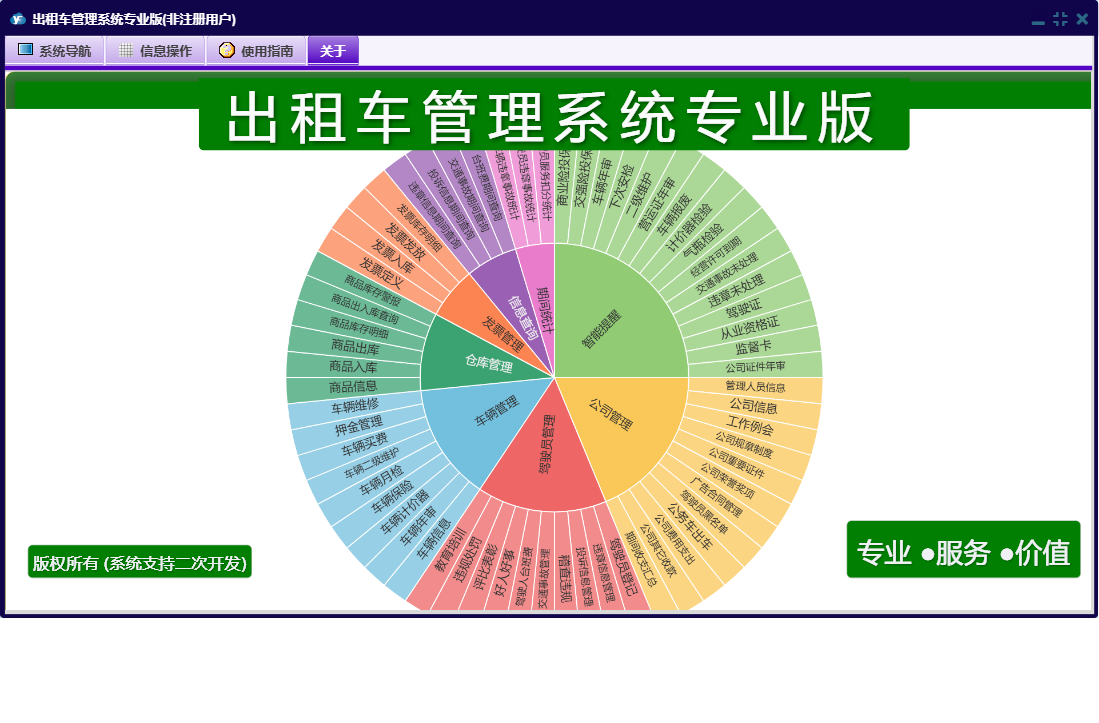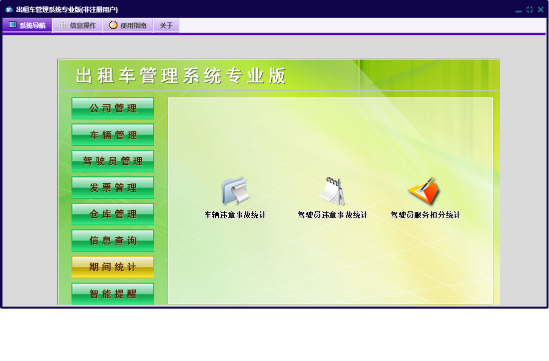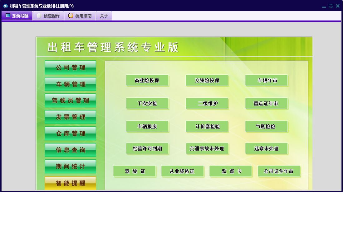 出租车管理系统专业版包含以下功能:好人好事、评比表彰、公司荣誉奖项、驾驶员登记、工作例会、发票管理、车辆买费、投诉信息管理、车辆管理、教育培训、公司费用支出、车辆二级维护、驾驶人台班费、驾驶员黑名单、违规处罚、车辆月检、广告合同管理、商品信息、公司信息、权限设置、发票定义、车辆年审、信息查询、商品出库、公司管理、押金管理、发票入库、商品入库、智能提醒、公务车出车、仓库管理、关于、稽查违规、交通事故管理、公司重要证件、发票发放、管理人员信息、车辆信息、车辆计价器、期间统计、违章信息管理、公司规章制度、日志、车辆维修、驾驶员管理、车辆保险、公司其它收款等