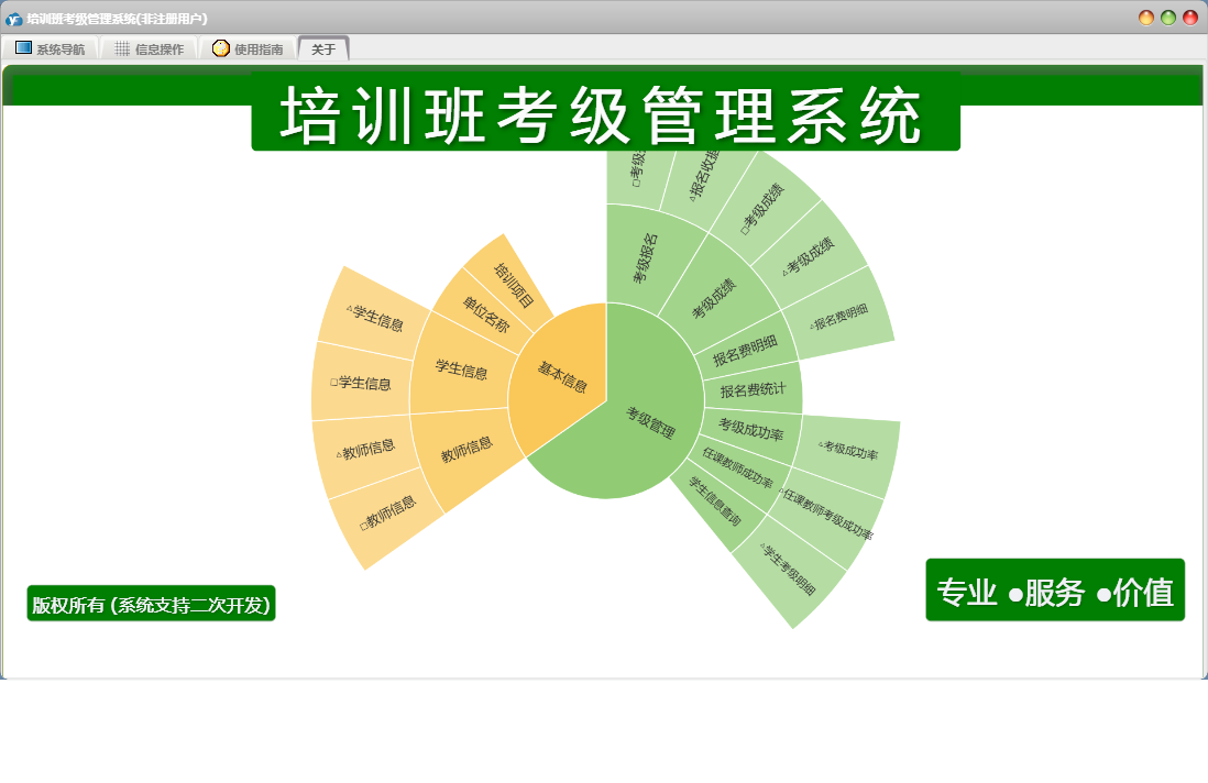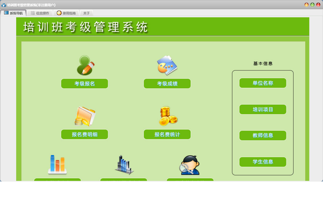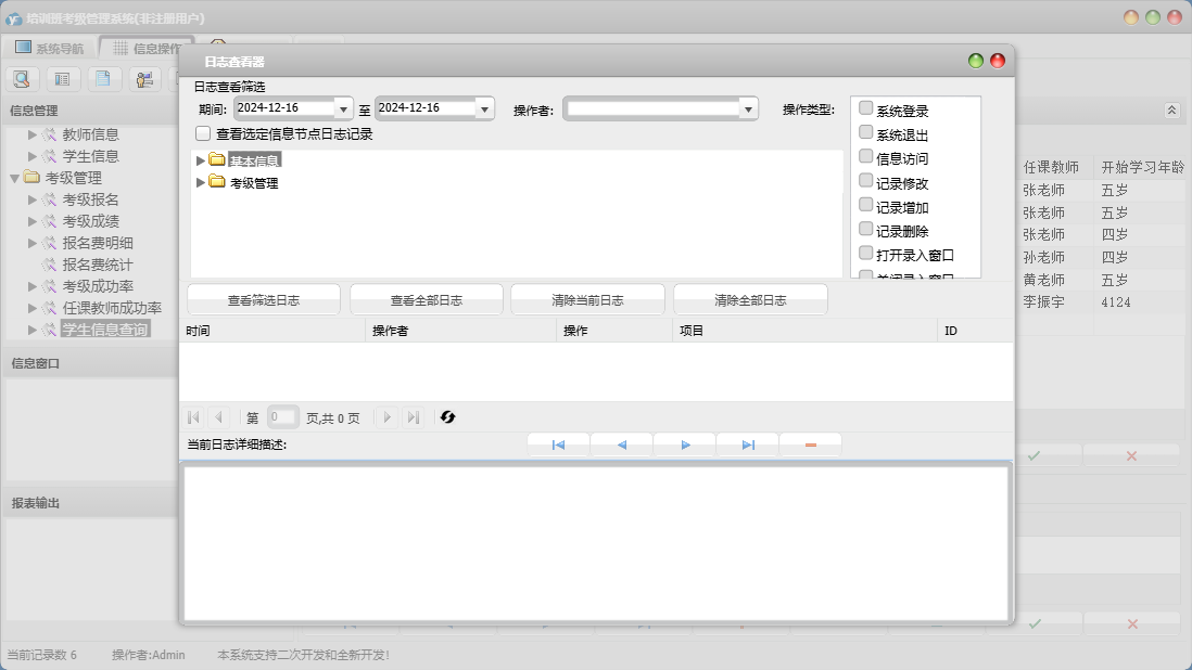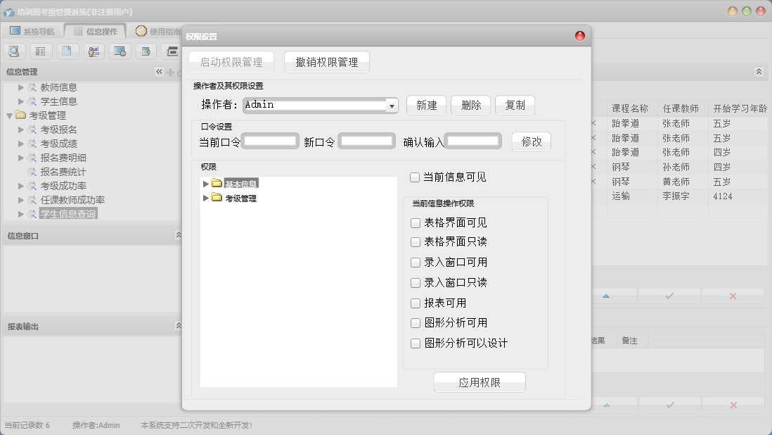 培训班考级管理系统包含以下功能:面板、考级报名、教师信息、学生信息、日志、关于、权限设置、考级成绩等