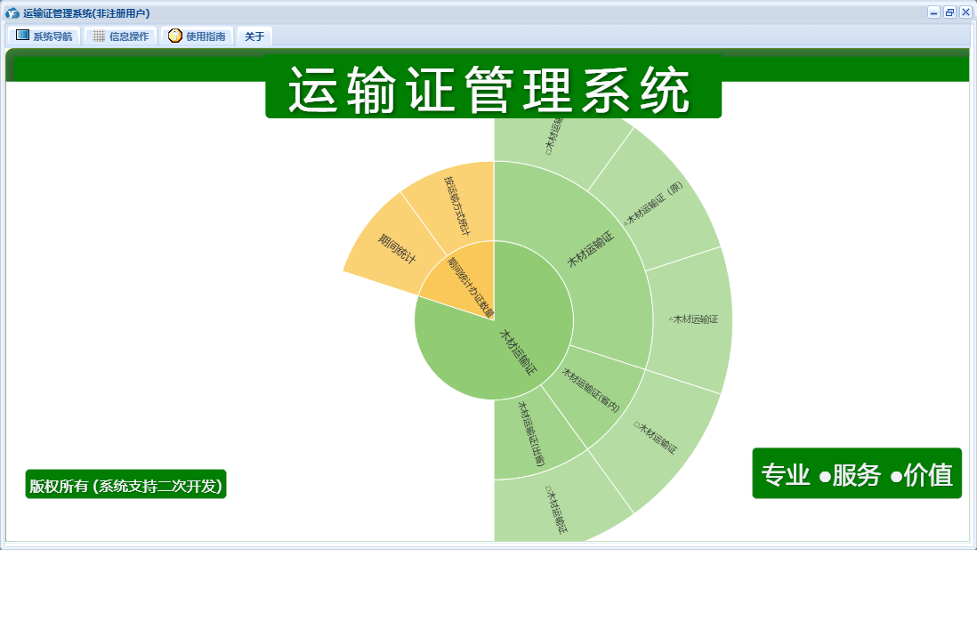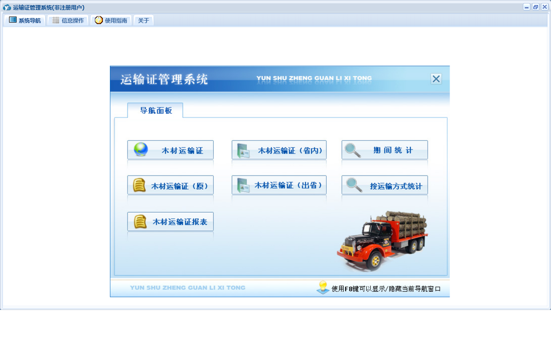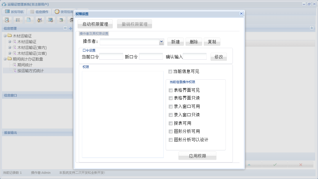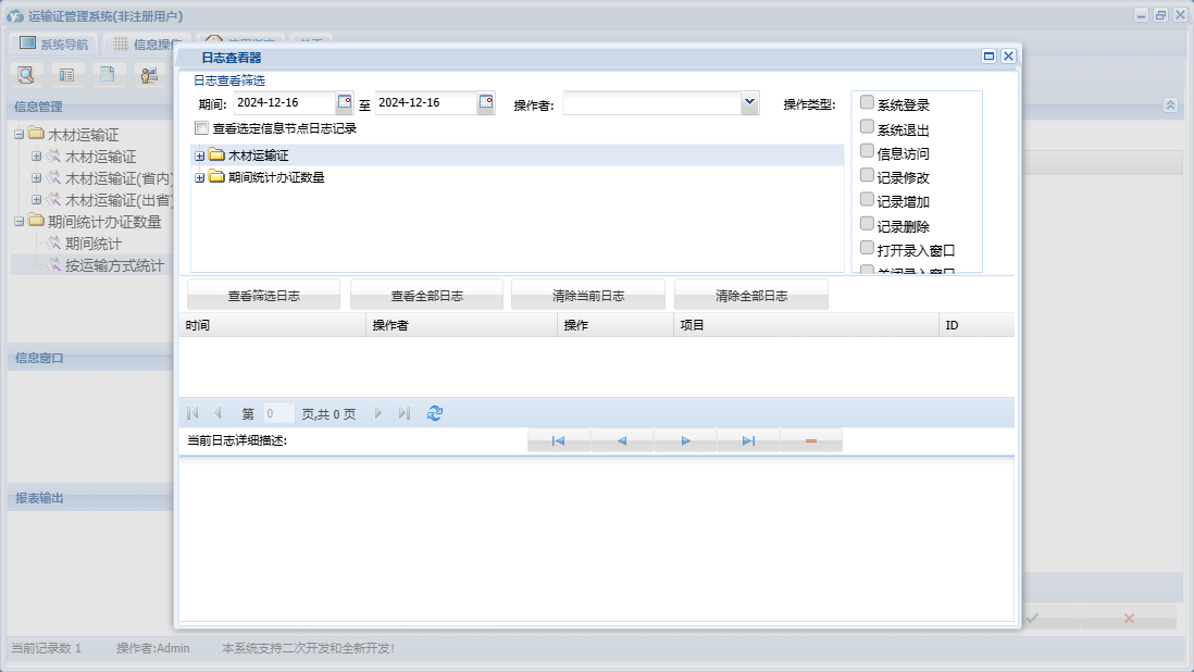 运输证管理系统包含以下功能:导航面板、木材运输证、木材运输证(出省)、日志、关于、权限设置、木材运输证(省内)等