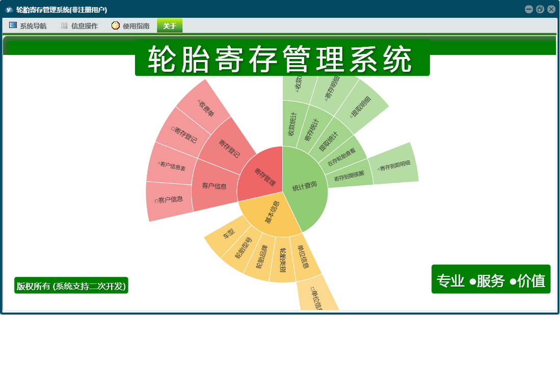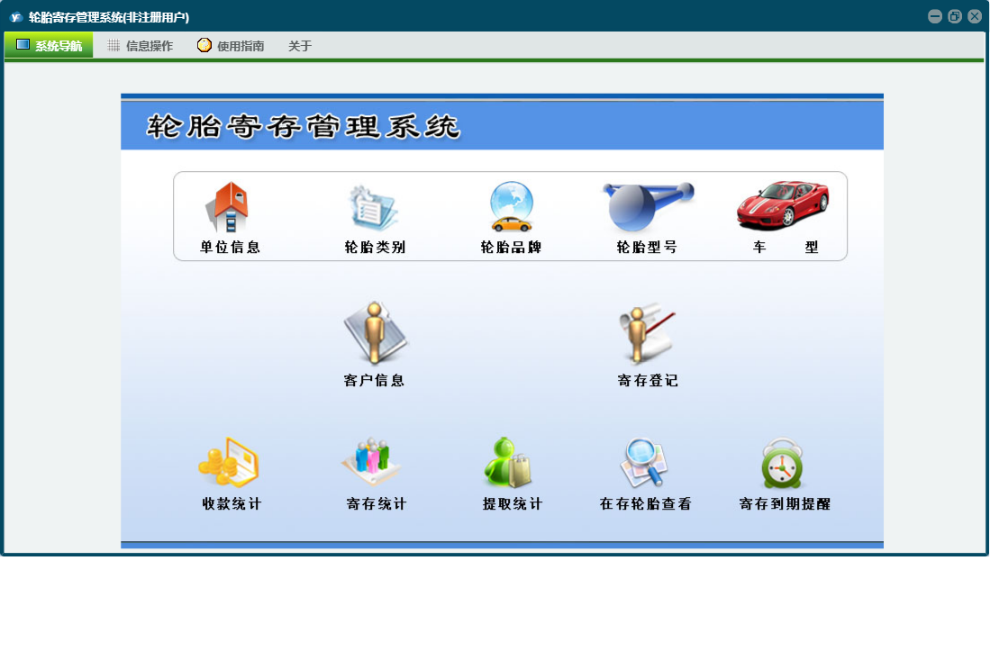 轮胎寄存管理系统包含以下功能:面板、寄存登记、日志、关于、权限设置等