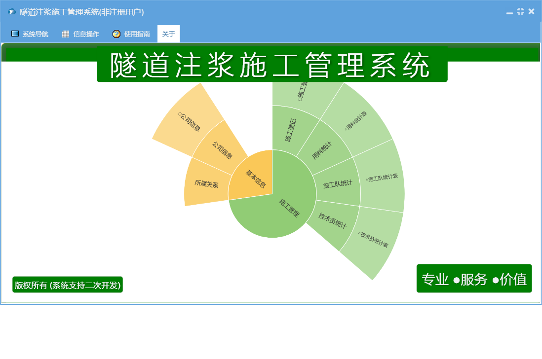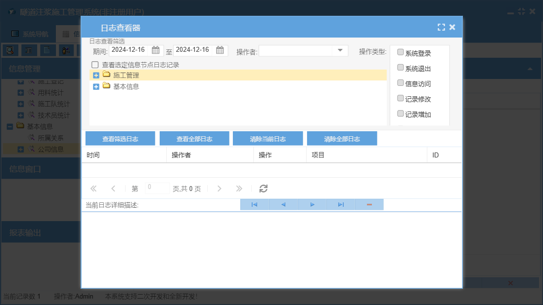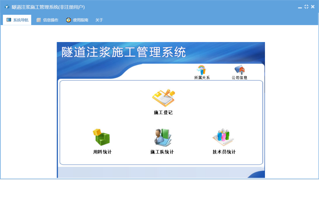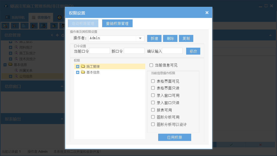 隧道注浆施工管理系统包含以下功能:施工管理、公司信息、日志、关于、权限设置、施工登记等