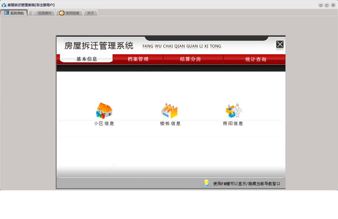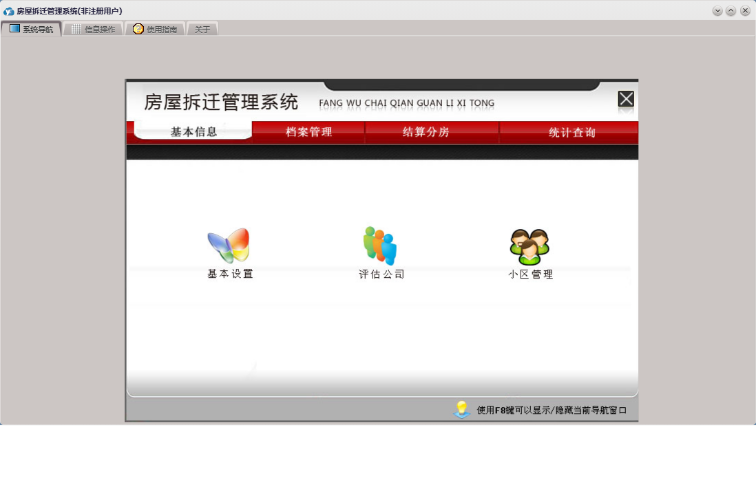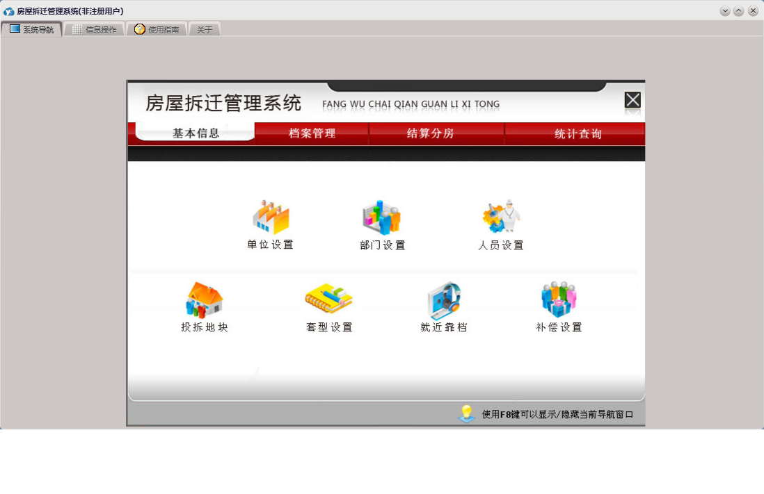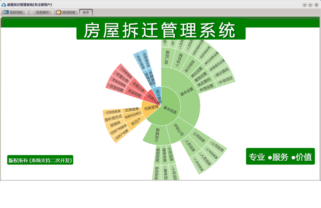 房屋拆迁管理系统包含以下功能:拆迁户、档案管理、房间信息、基本信息 基本设置、部门设置、单位设置、公司信息、安置分房、资金结算、权限设置、统计查询、拆迁地块、就近靠档、小区信息、结算分房、套型设置、关于、基本信息、补偿设置、楼栋信息、基本信息 小区管理、基本信息 评估公司、日志、人员设置、人员信息等