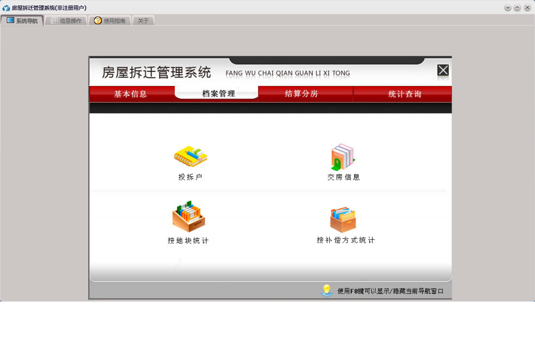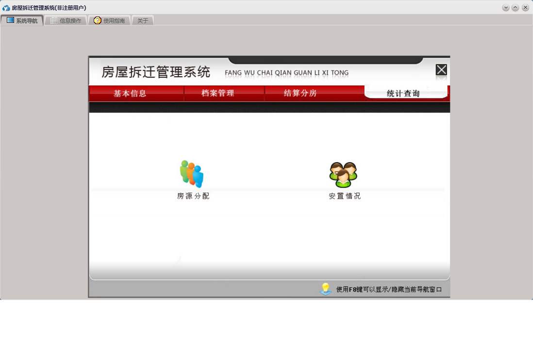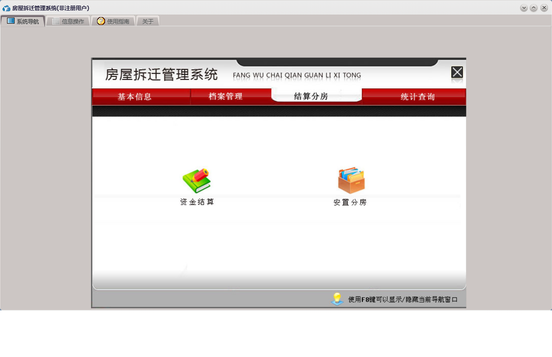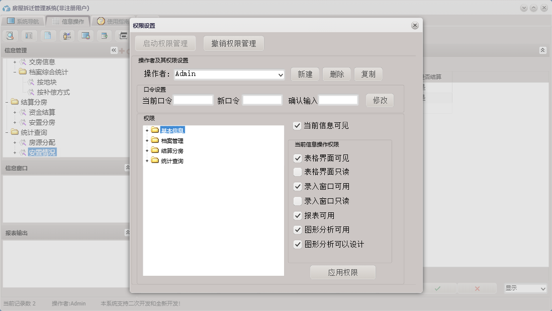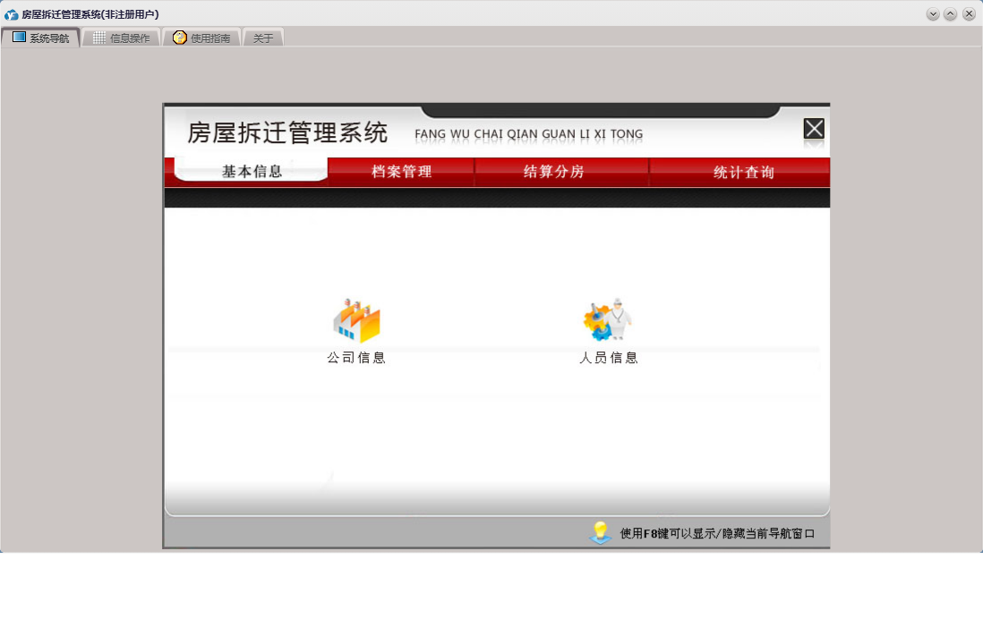 房屋拆迁管理系统包含以下功能:拆迁户、档案管理、房间信息、基本信息 基本设置、部门设置、单位设置、公司信息、安置分房、资金结算、权限设置、统计查询、拆迁地块、就近靠档、小区信息、结算分房、套型设置、关于、基本信息、补偿设置、楼栋信息、基本信息 小区管理、基本信息 评估公司、日志、人员设置、人员信息等