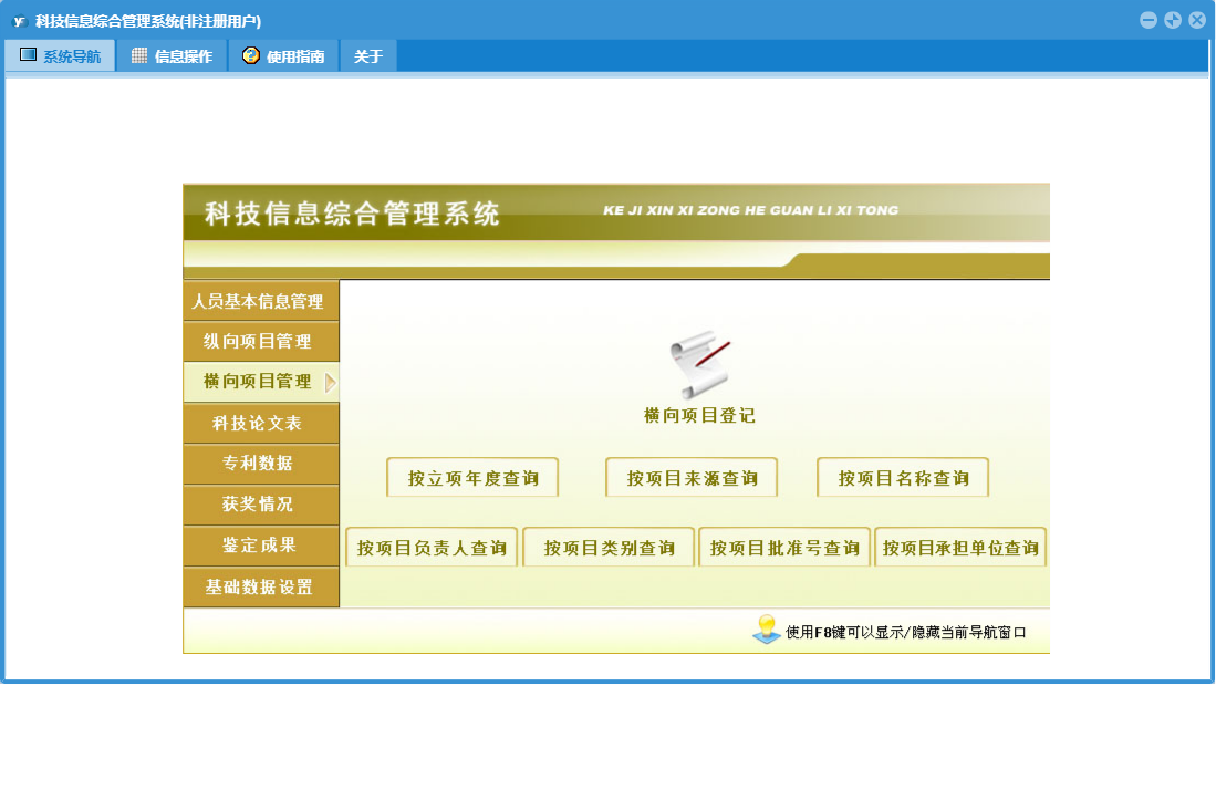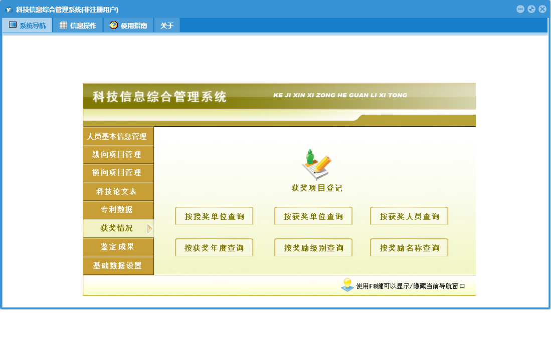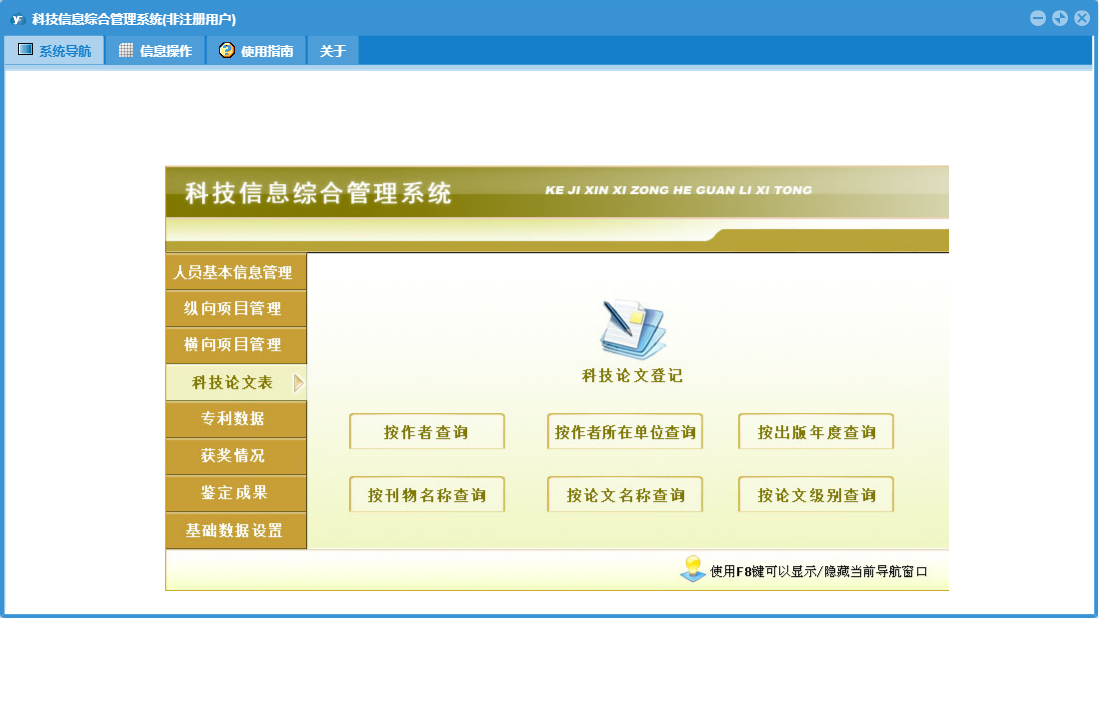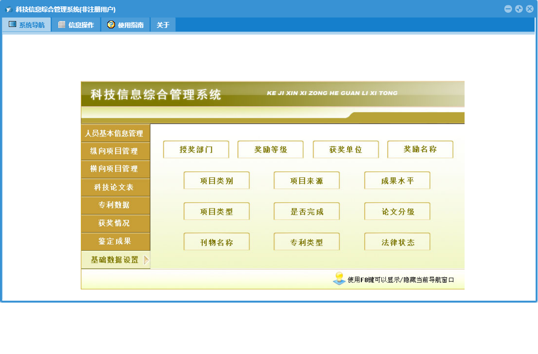 科技信息综合管理系统包含以下功能:按成果水平查询、成果水平、项目类型、按成果名称查询、按授奖单位查询、按获奖单位查询、授奖部门、奖励等级、横向项目登记、按论文级别查询、按项目负责人查询、按出版年度查询、按作者查询、按项目名称查询、按奖励名称查询、人员基本信息、科技论文登记、横向项目管理、按项目类别查询、专利数据登记、权限设置、按刊物名称查询、按申请时间查询、获奖单位、按法律状态查询、按项目来源查询、按专利类型查询、目前人员、按作者所在单位查询、按奖励级别查询、奖励名称、纵向项目登记、专利数据、是否完成、鉴定成果、鉴定成果登记、关于、获奖项目登记、纵向项目管理、基础数据设置、按证书编号查询、按专利名称查询、科技论文、按获奖人员查询、项目类别、获状情况、按论文名称查询、按完成单位查询、以往人员、日志、按鉴定机关查询、按鉴定年度、按项目承担单位查询、按发明人查询、按获奖年度查询、按立项年度查询、按项目批准号查询、项目来源等