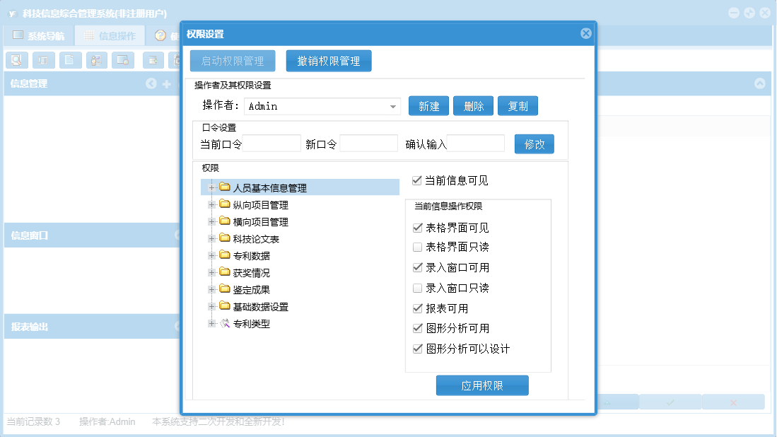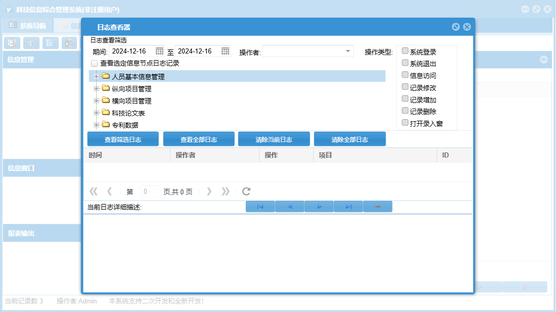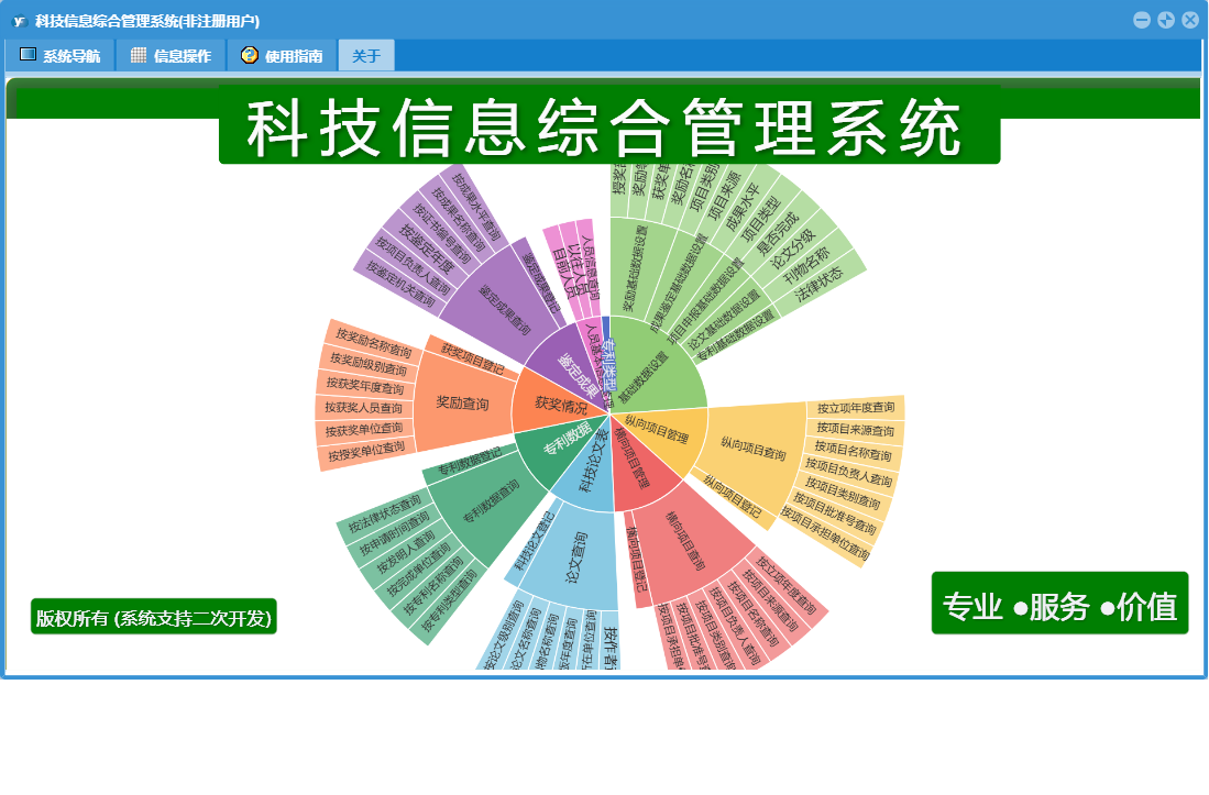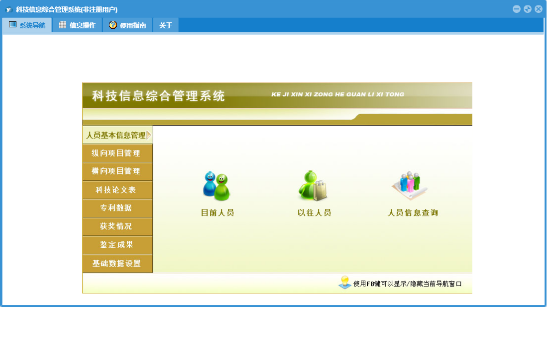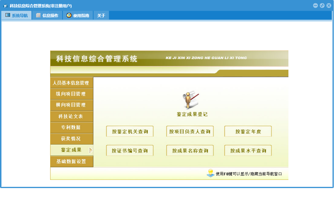 科技信息综合管理系统包含以下功能:按成果水平查询、成果水平、项目类型、按成果名称查询、按授奖单位查询、按获奖单位查询、授奖部门、奖励等级、横向项目登记、按论文级别查询、按项目负责人查询、按出版年度查询、按作者查询、按项目名称查询、按奖励名称查询、人员基本信息、科技论文登记、横向项目管理、按项目类别查询、专利数据登记、权限设置、按刊物名称查询、按申请时间查询、获奖单位、按法律状态查询、按项目来源查询、按专利类型查询、目前人员、按作者所在单位查询、按奖励级别查询、奖励名称、纵向项目登记、专利数据、是否完成、鉴定成果、鉴定成果登记、关于、获奖项目登记、纵向项目管理、基础数据设置、按证书编号查询、按专利名称查询、科技论文、按获奖人员查询、项目类别、获状情况、按论文名称查询、按完成单位查询、以往人员、日志、按鉴定机关查询、按鉴定年度、按项目承担单位查询、按发明人查询、按获奖年度查询、按立项年度查询、按项目批准号查询、项目来源等