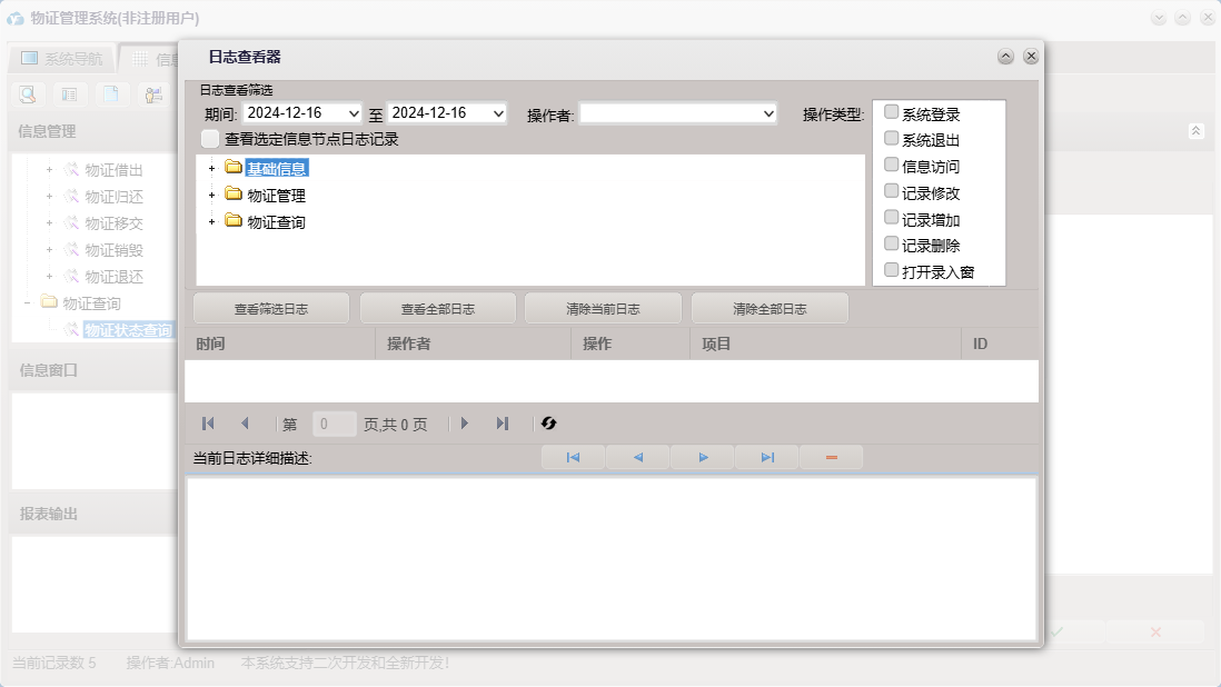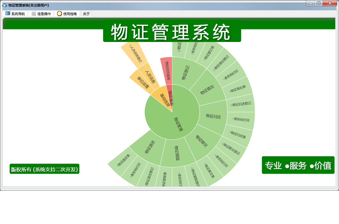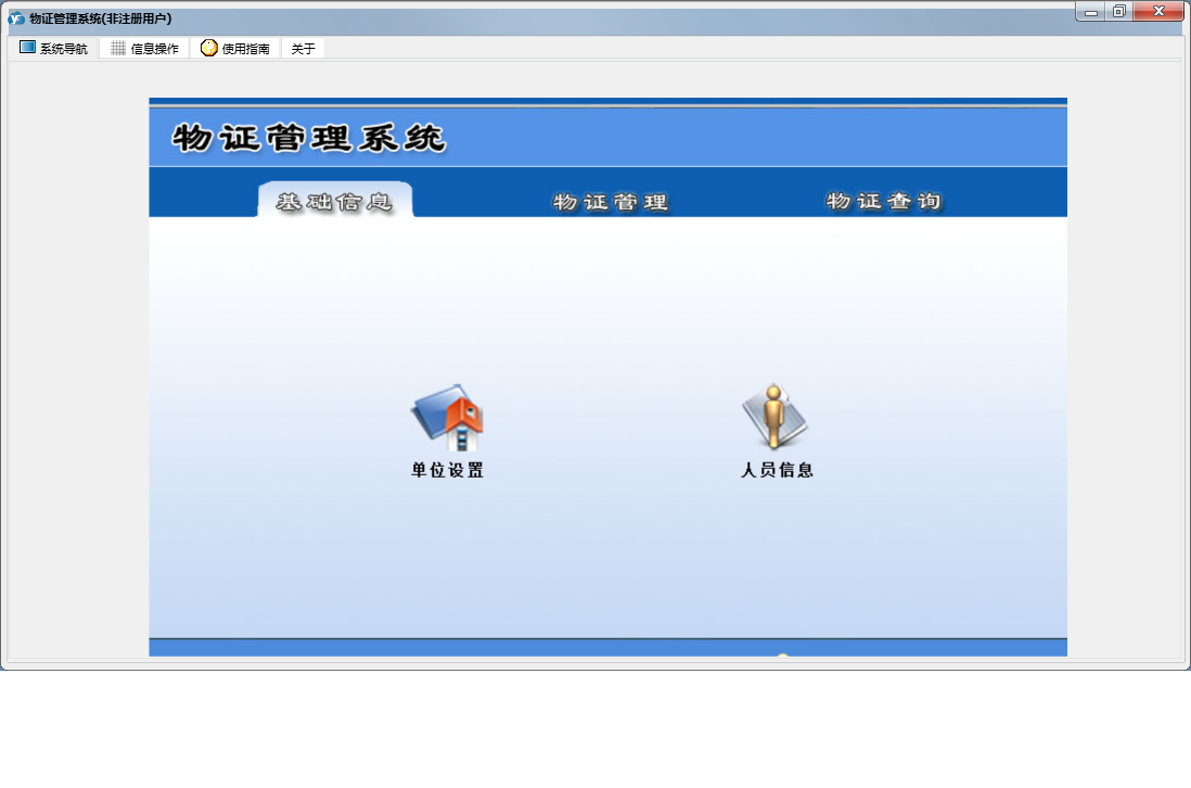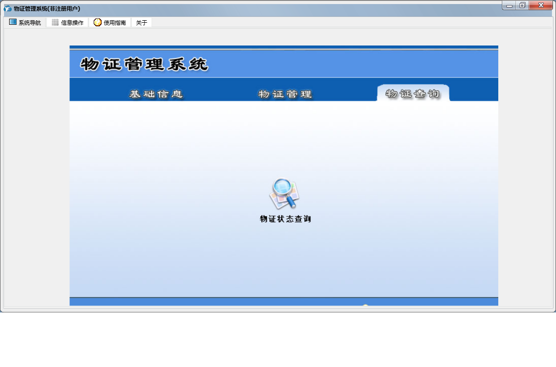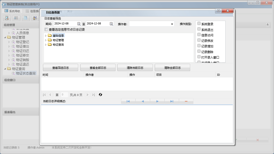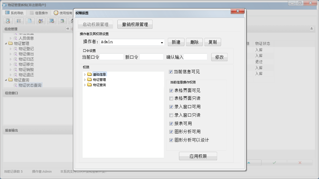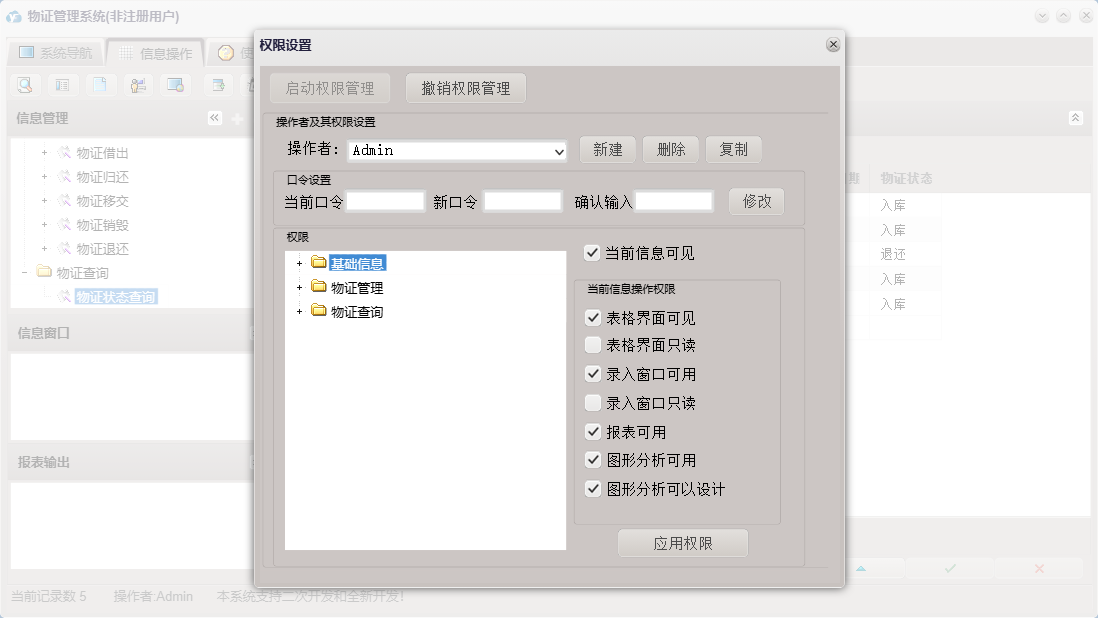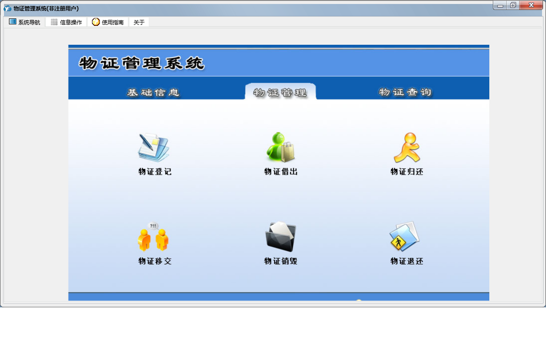 物证管理系统包含以下功能:物证移交、权限设置窗口 (1)、基础信息、物证查询、物证登记、日志、物证归还、物证借出、关于、物证管理、权限设置、日志窗口 (1)、物证退还、人员信息、物证销毁等