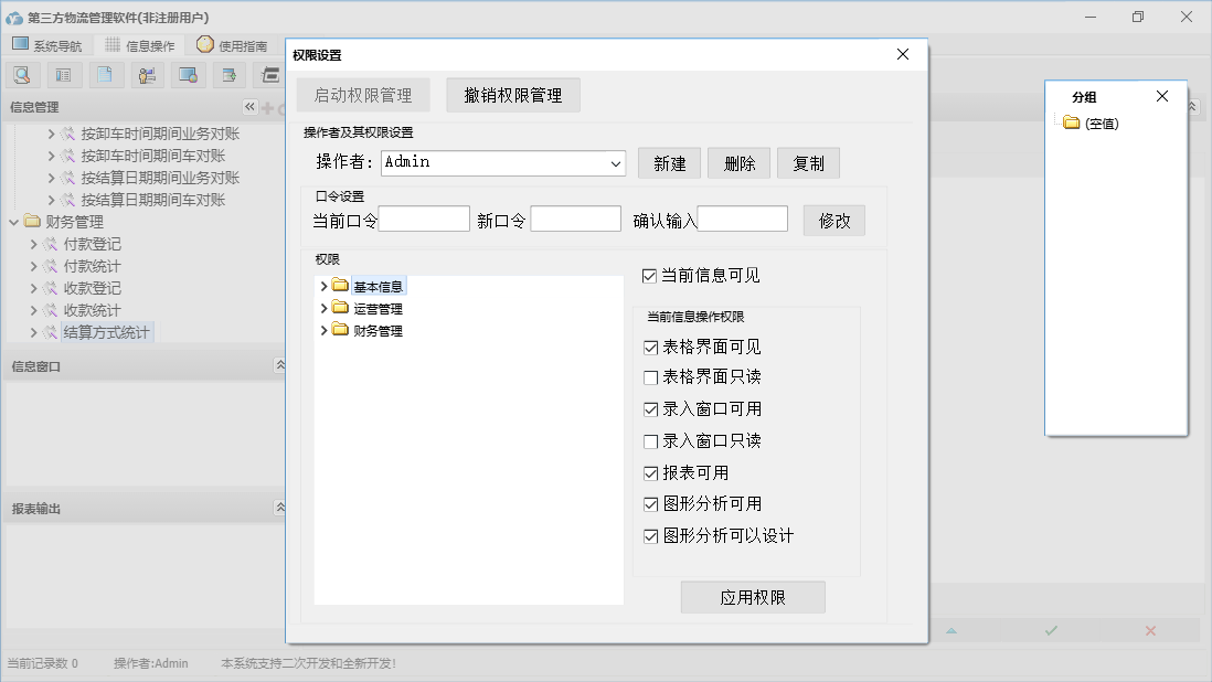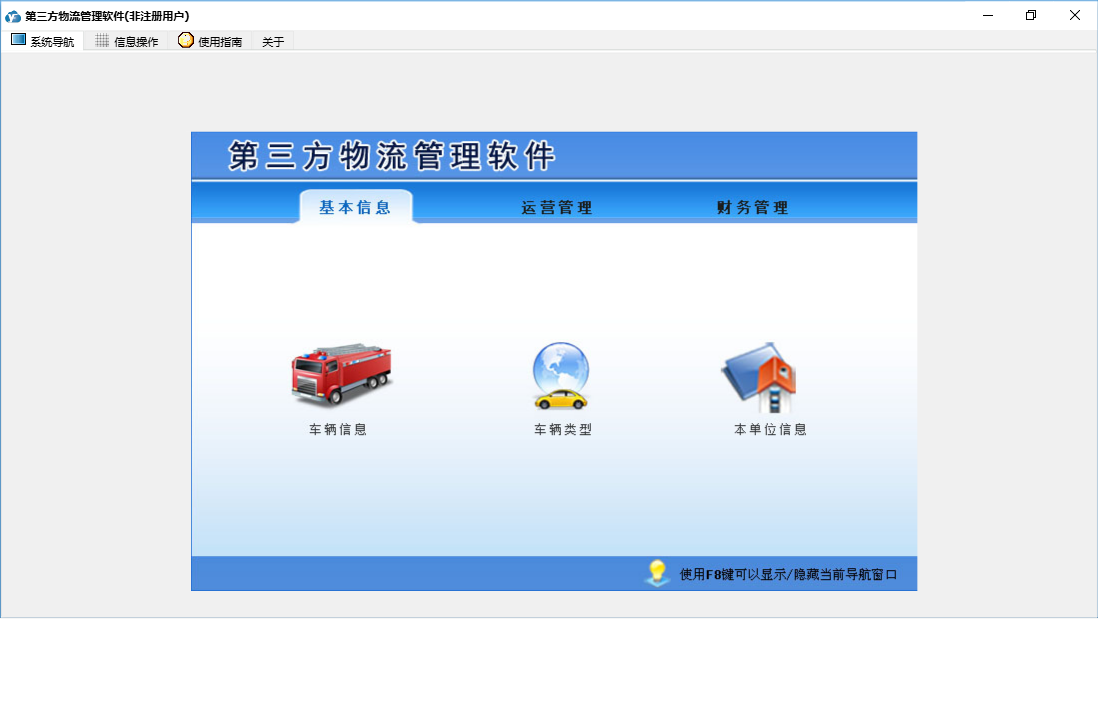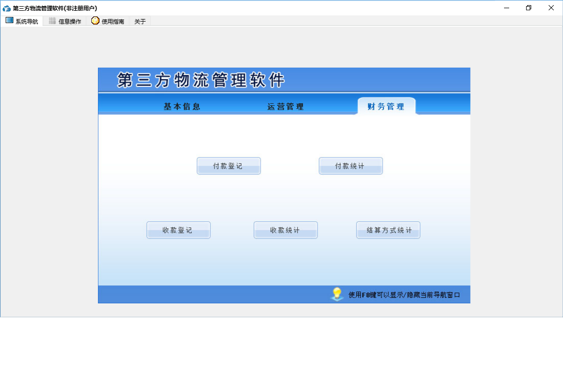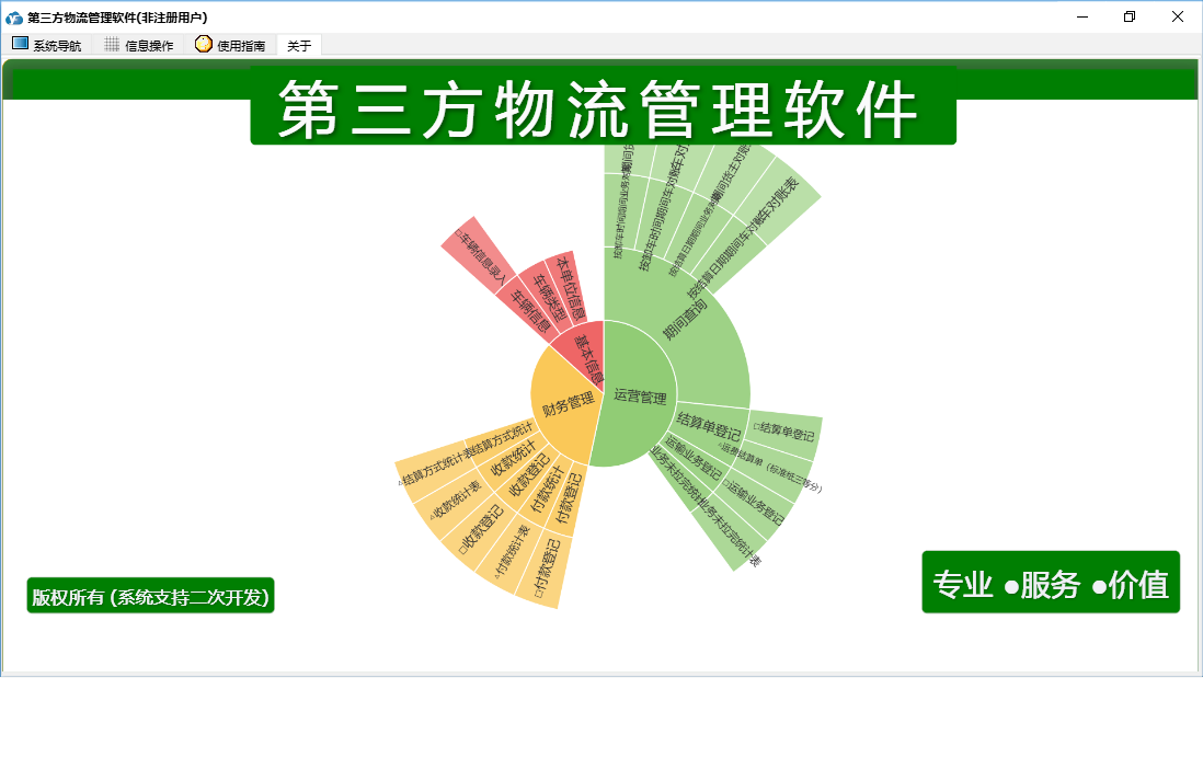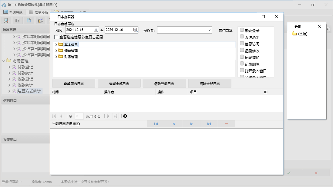 第三方物流管理软件包含以下功能:结算单登记、运营管理、付款登记、日志、运输业务登记、关于、权限设置、基本信息、收款登记、财务管理、车辆信息等
