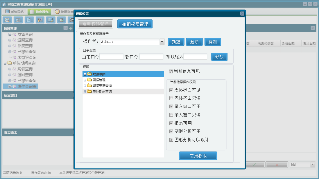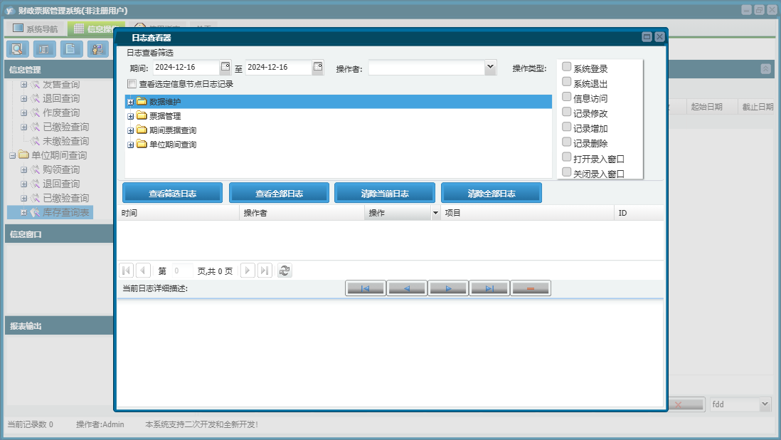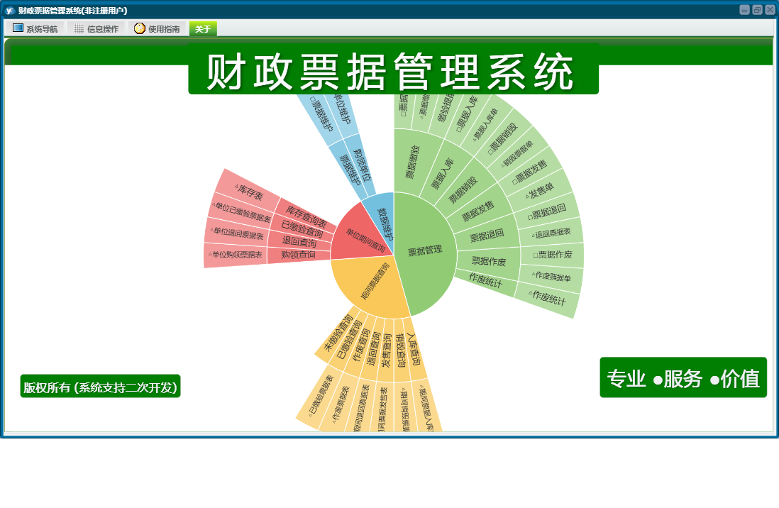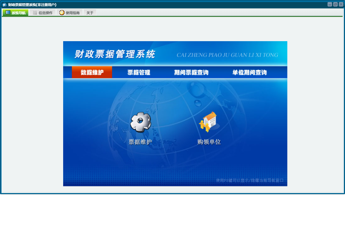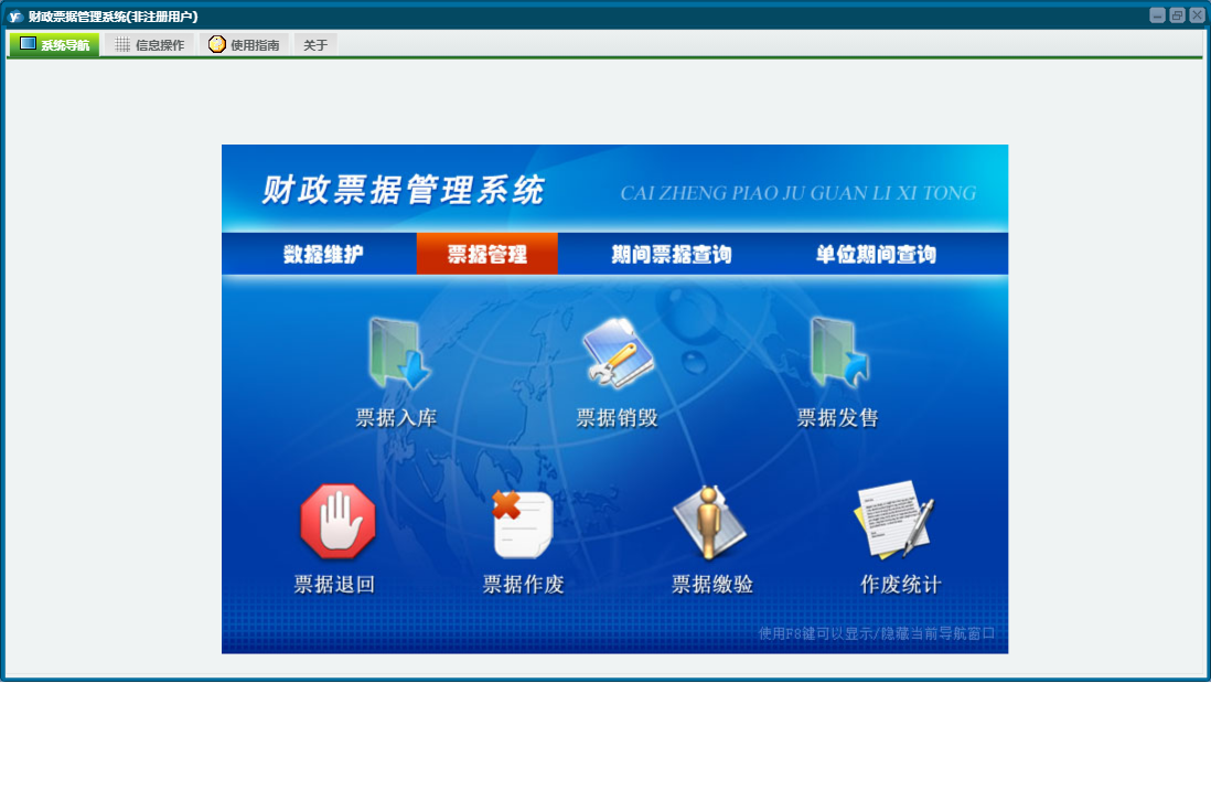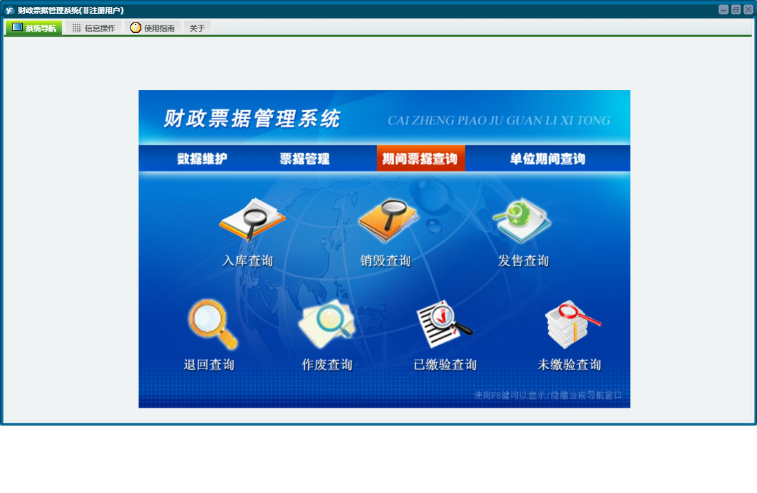 财政票据管理系统包含以下功能:单位期间查询、票据维护、购领单位、票据发售、票据销毁、期间票据查询、票据入库、日志、票据缴验、关于、权限设置、票据管理、数据维护、票据作废、票据退回等