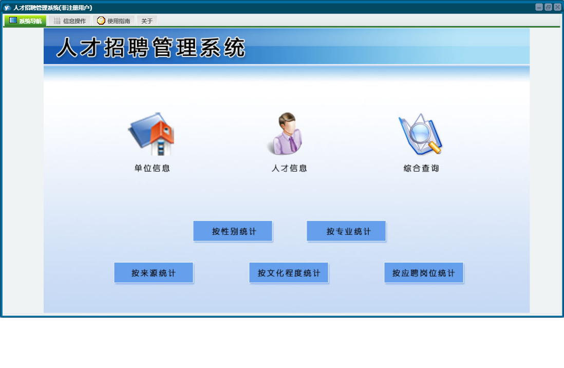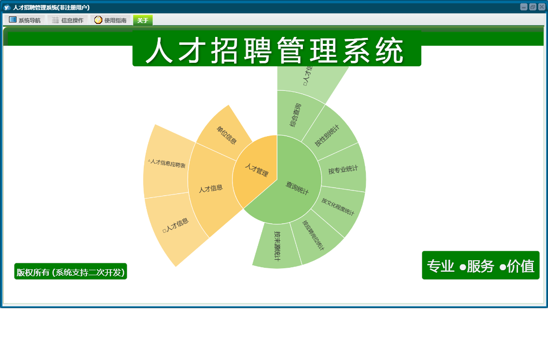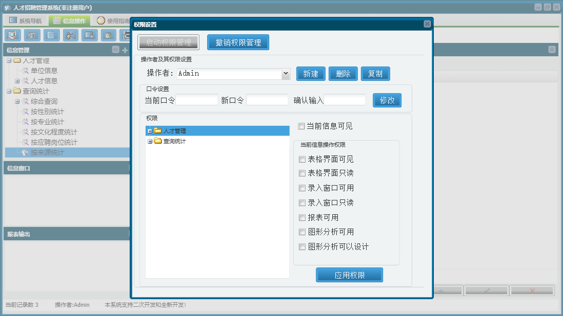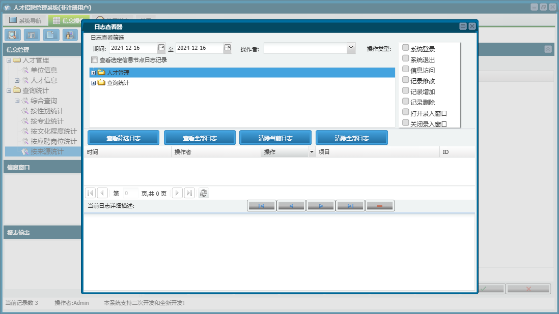 人才招聘管理系统包含以下功能:日志、关于、权限设置、人才信息、综合查询、人才管理等
