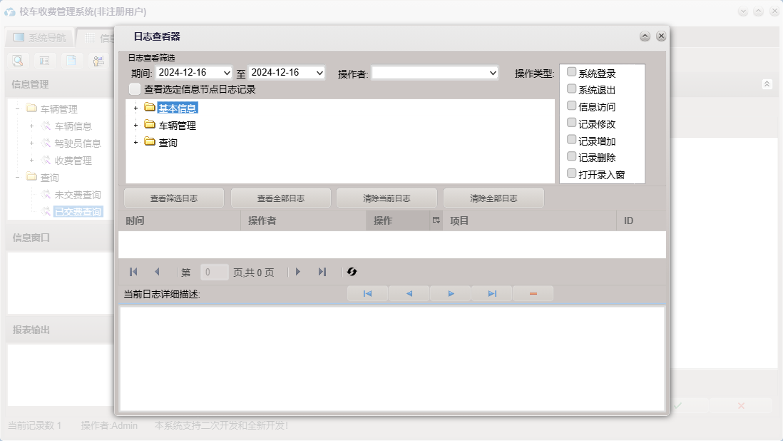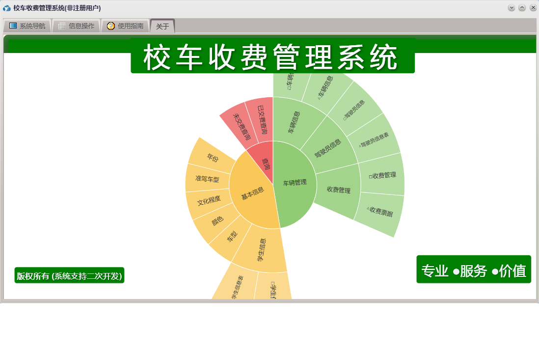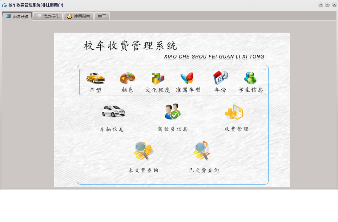 校车收费管理系统包含以下功能:学生信息、日志、关于、权限设置、驾驶员信息、主面板、车辆信息、收费管理等
