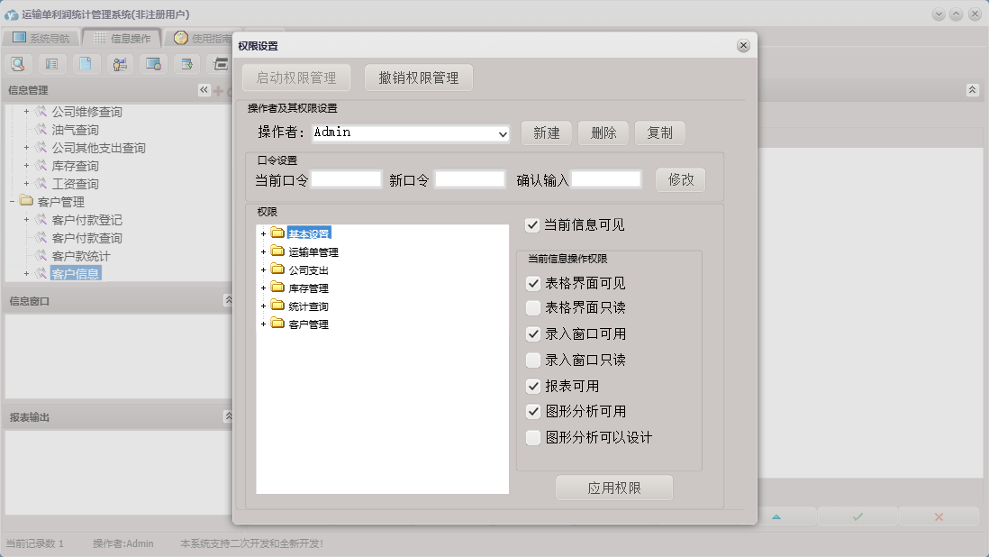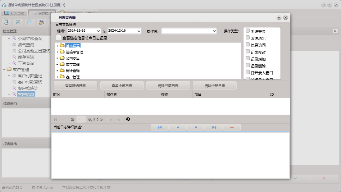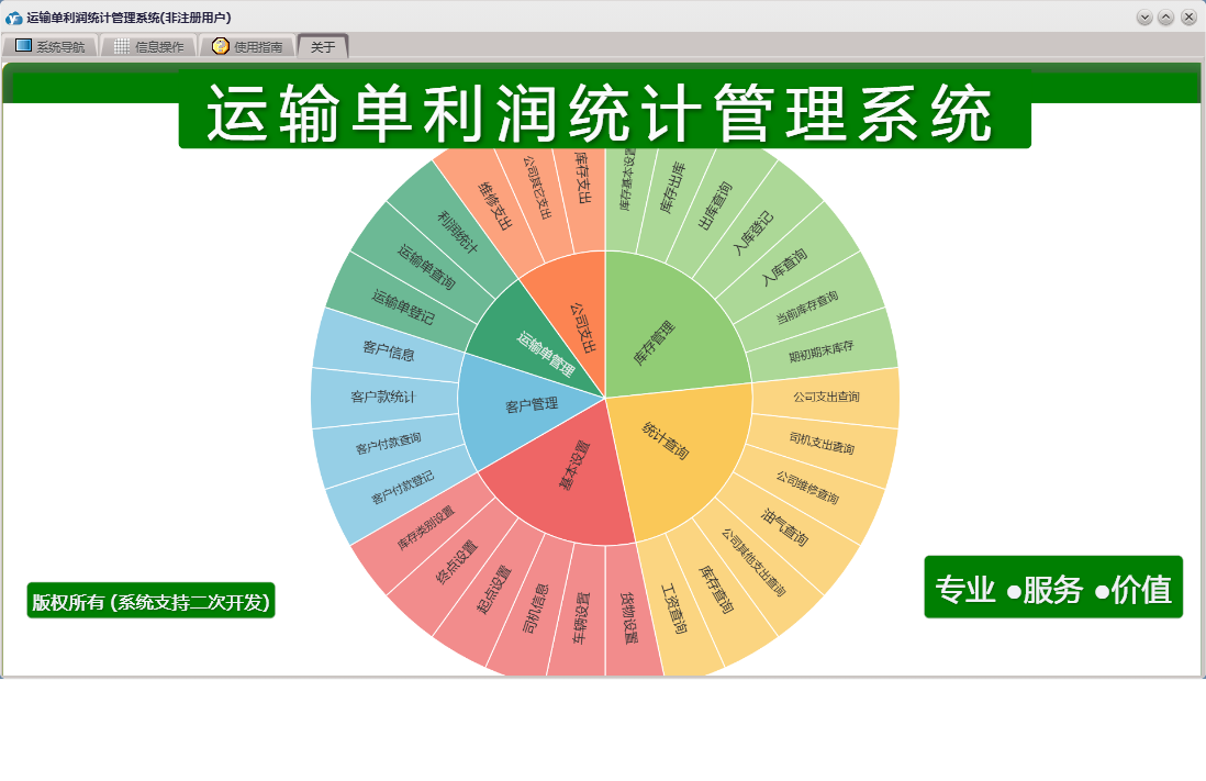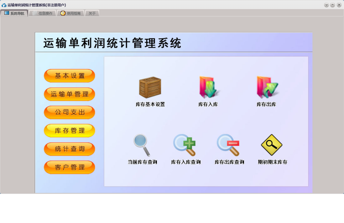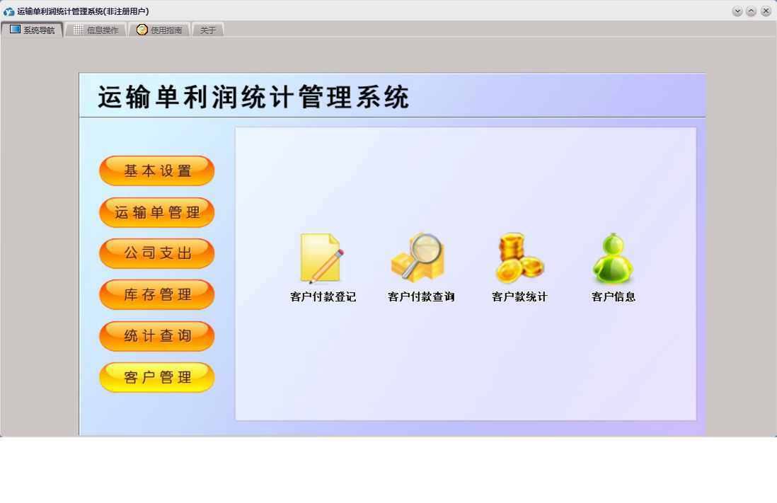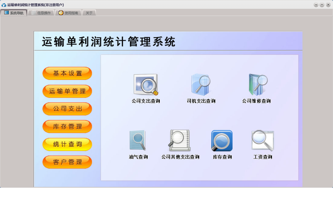 运输单利润统计管理系统包含以下功能:维修支出、基本设置、终点设置、起点设置、入库登记、库存基本设置、客户管理、权限设置、统计查询、客户付款登记、货物设置、车辆设置、库存管理、关于、运输单管理、客户信息、司机信息、运输单登记、日志、公司支出、公司其它支出、库存出库等
