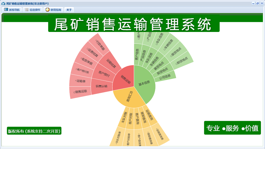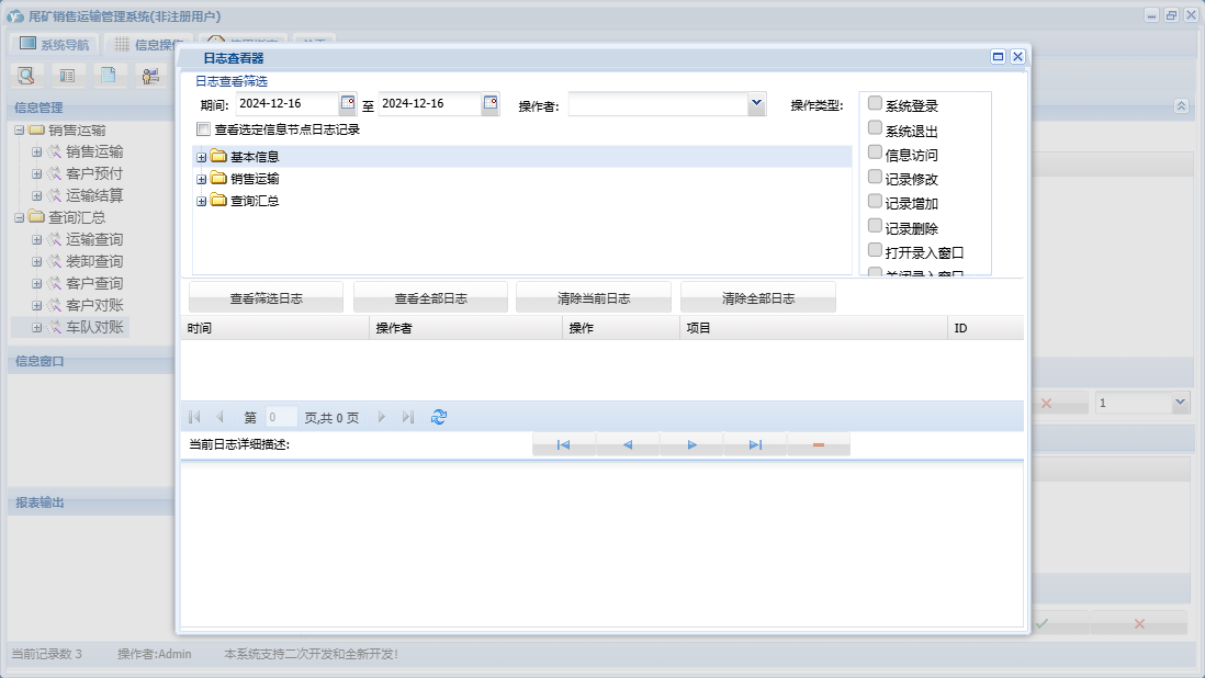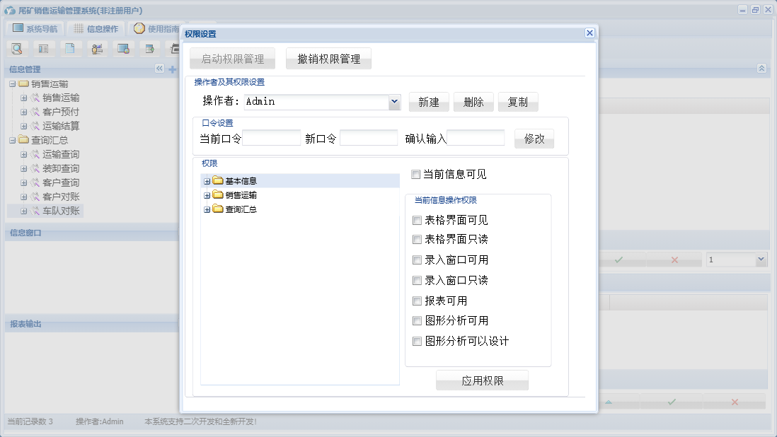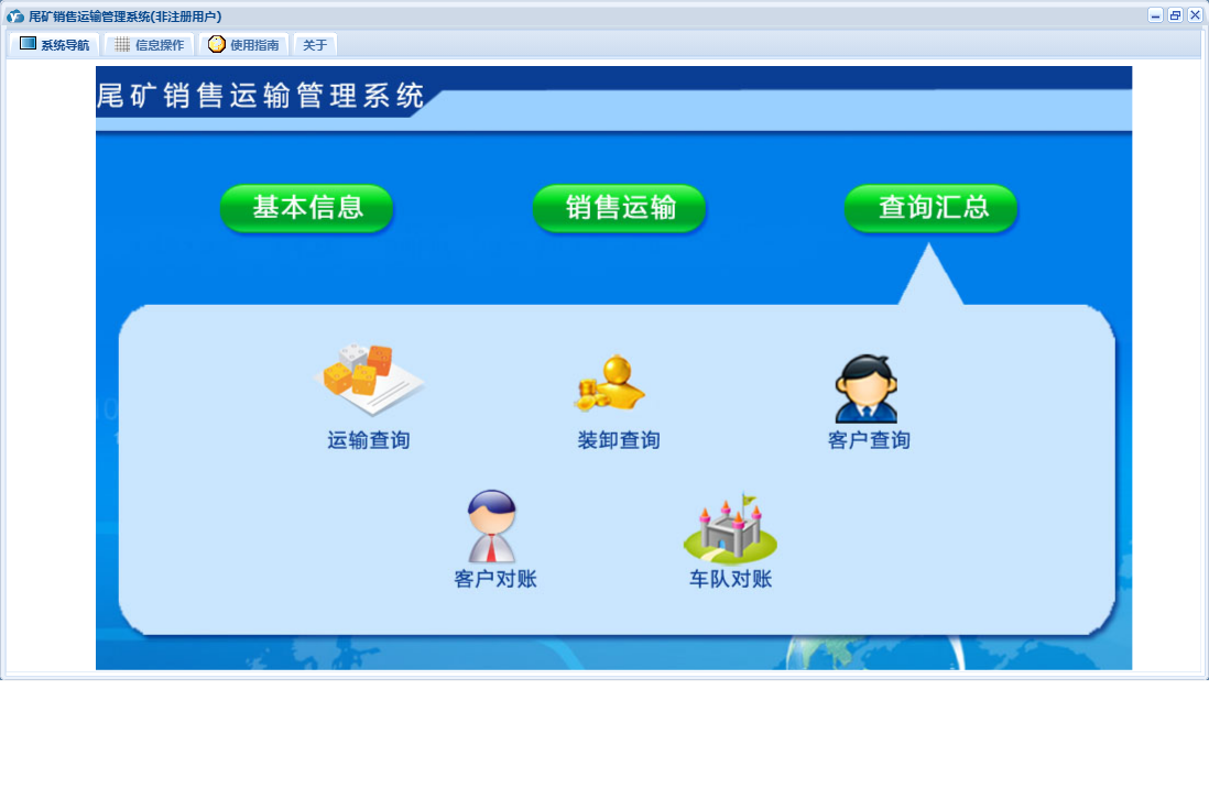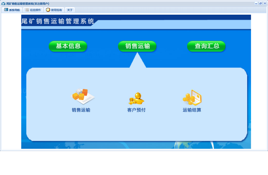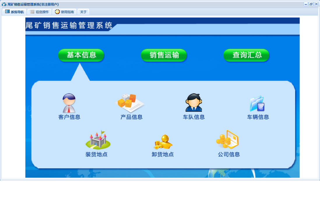 尾矿销售运输管理系统包含以下功能:销售运输、客户预付、车队信息、卸货地点、装货地点、日志、查询汇总、运输结算、关于、基本信息、权限设置、产品信息、客户信息、车辆信息等