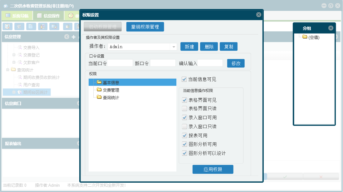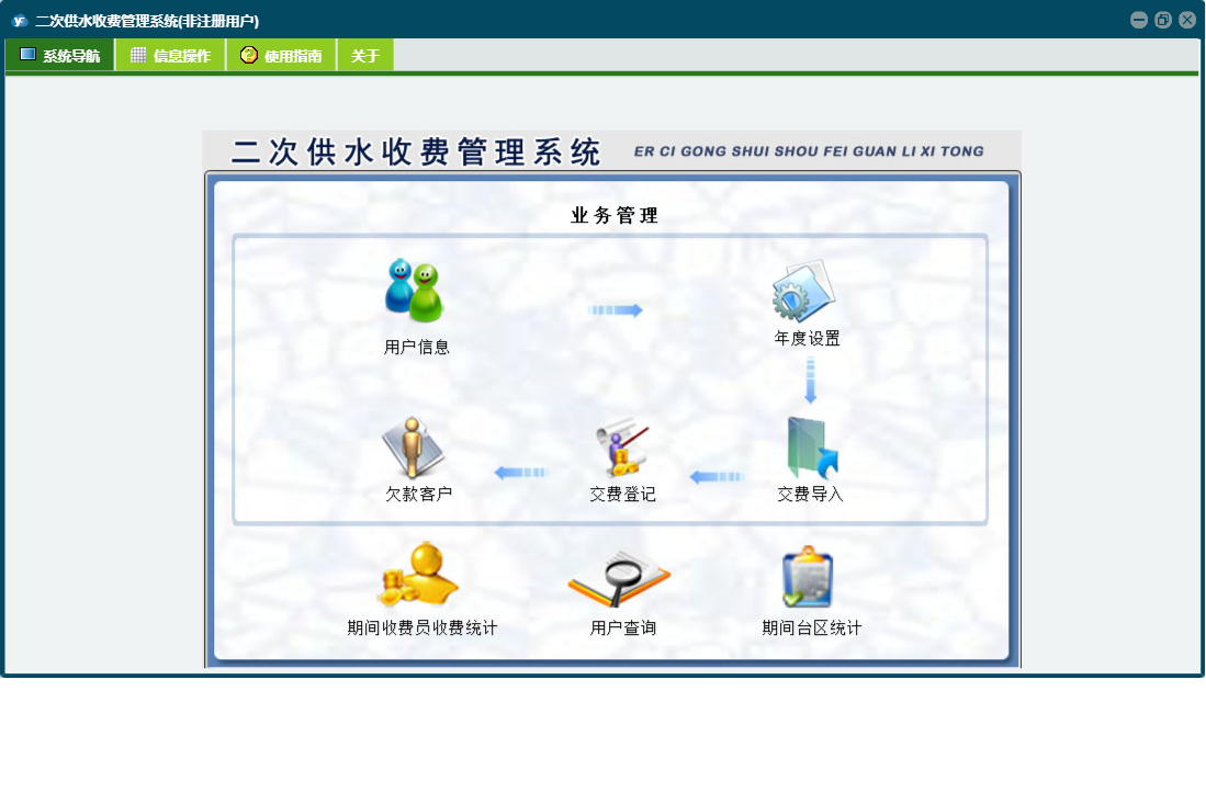 二次供水收费管理系统包含以下功能:用户信息、面板、日志、交费登记、关于、权限设置、欠款客户等
