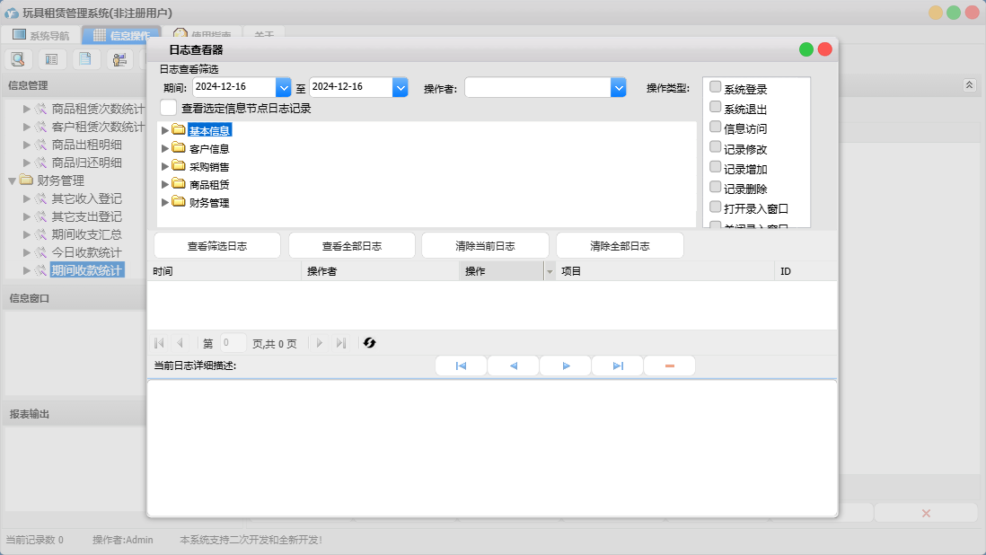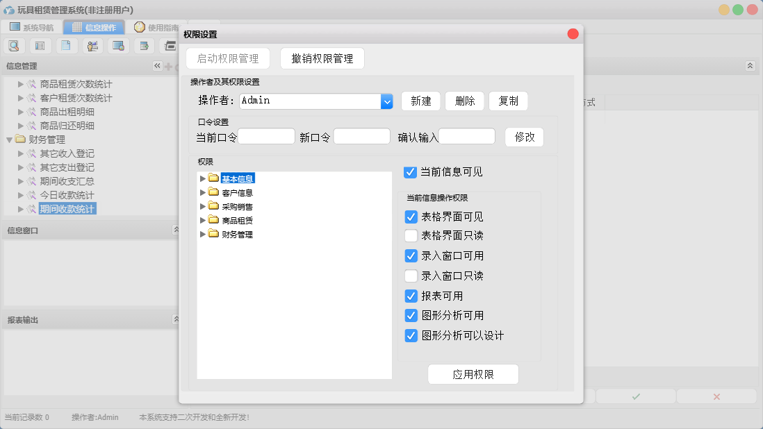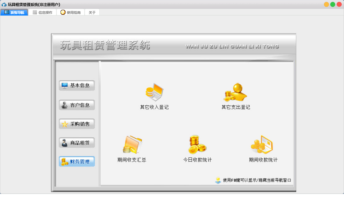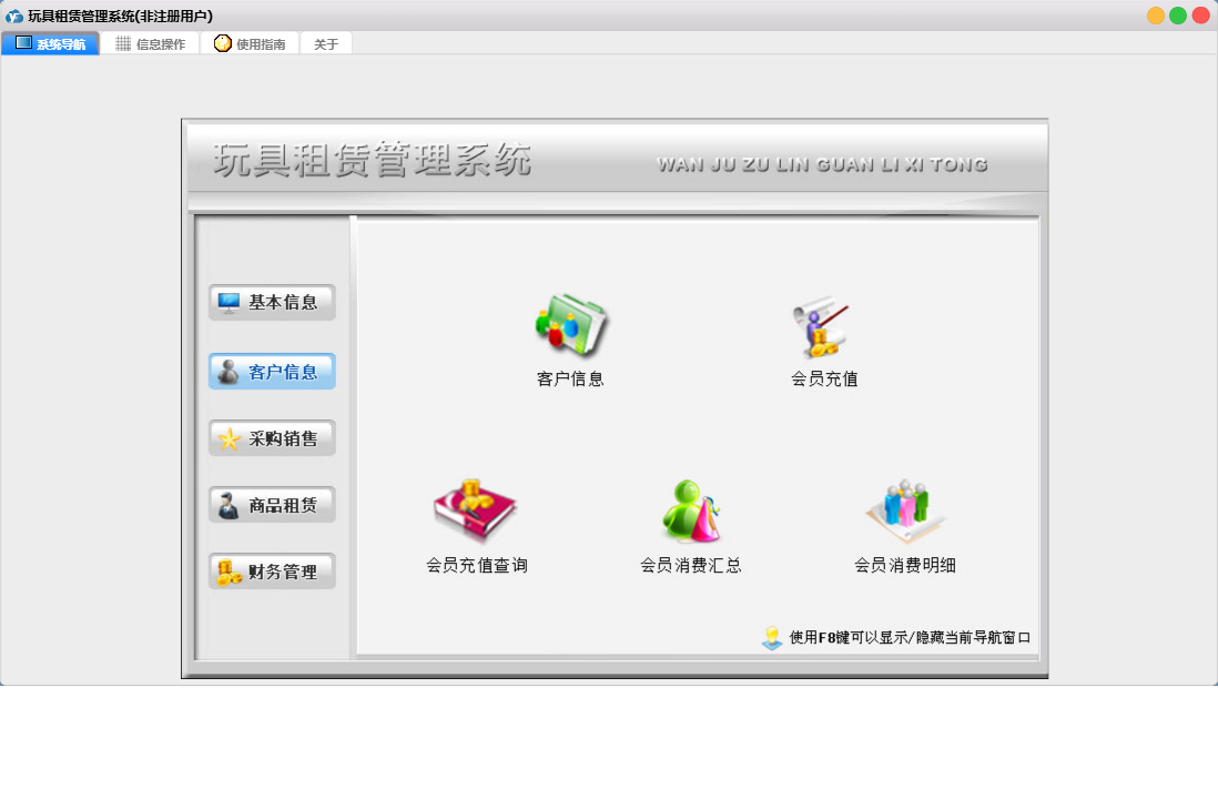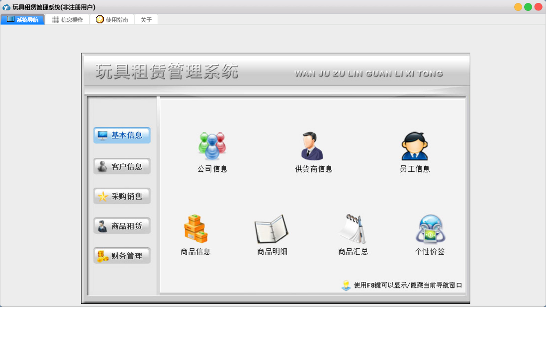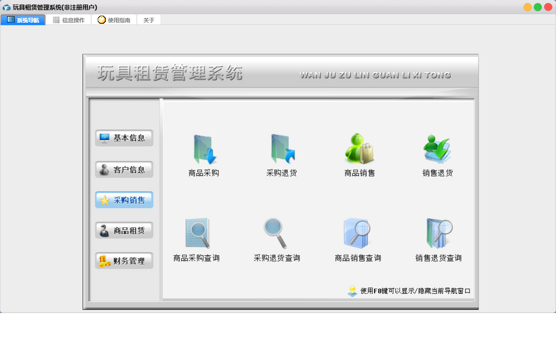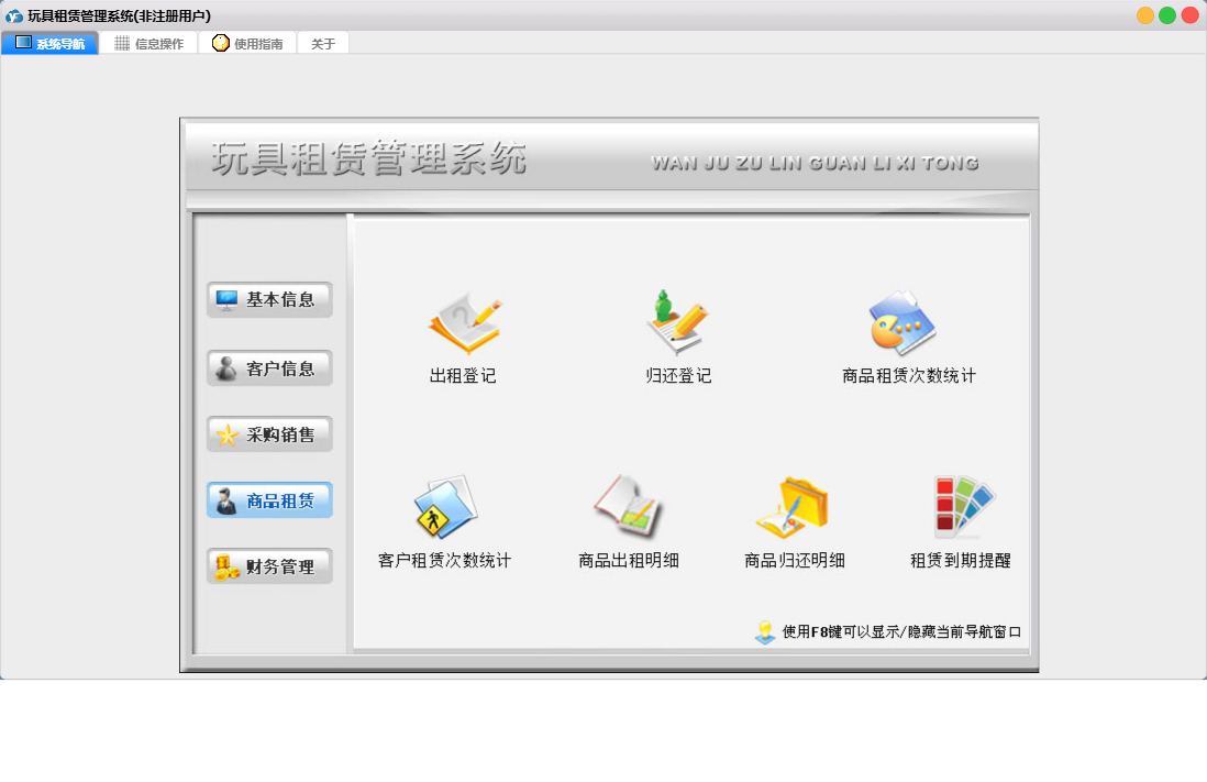 玩具租赁管理系统包含以下功能:采购销售、财务管理、归还登记、个性价签、商品信息、公司信息、销售退货、权限设置、会员充值、出租登记、其它收入登记、采购退货、其它支出登记、关于、基本信息、商品采购、客户信息、商品租赁、商品销售、员工信息、供货商信息、日志等