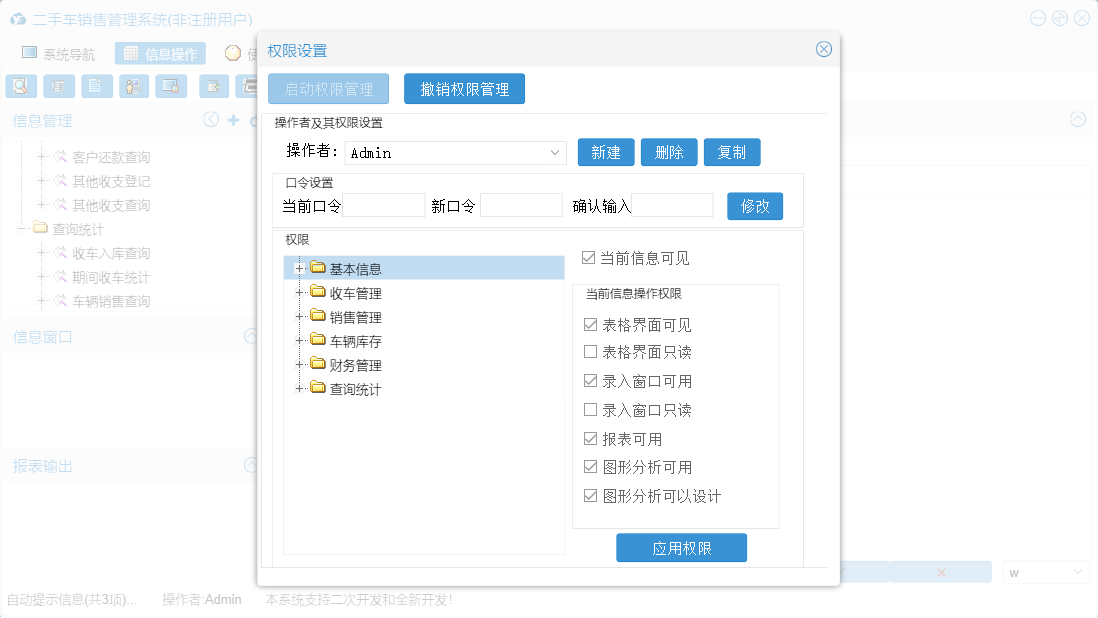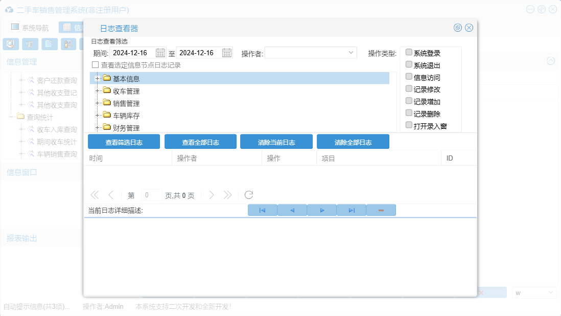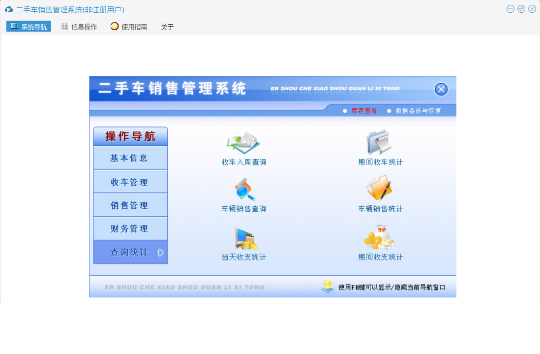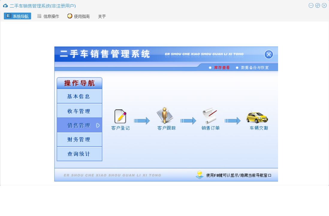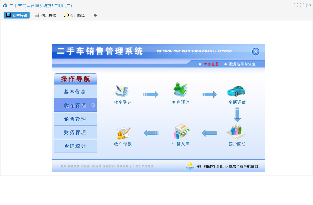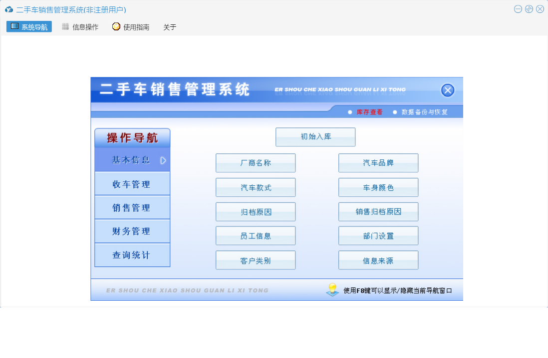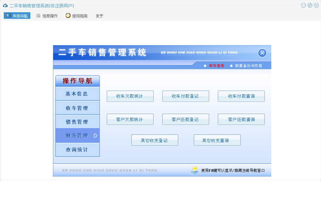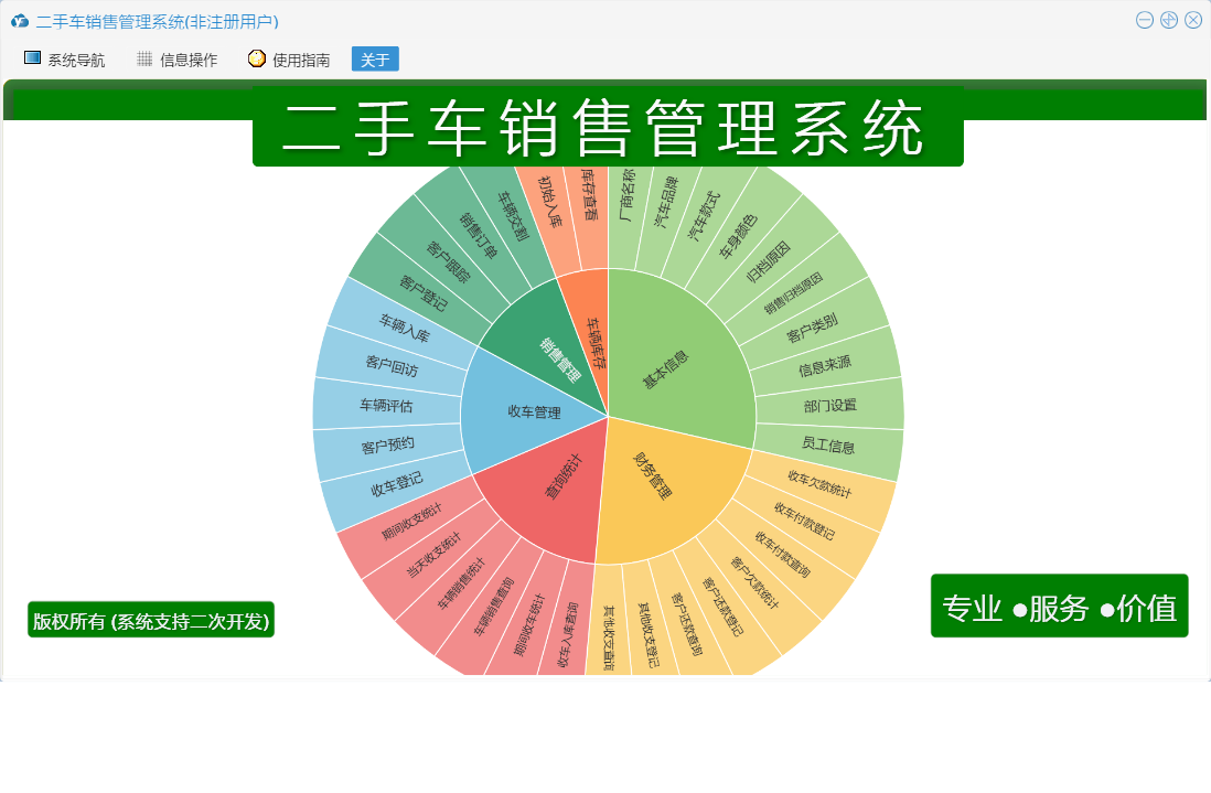 二手车销售管理系统包含以下功能:期间收车统计、厂商名称、销售管理、查询统计、收车欠款统计、其他收支登记、销售归档原因、收车管理、车辆交割、财务管理、其他收支查询、车辆销售查询、车辆入库、收车付款登记、部门设置、客户预约、期间收支统计、当天收支统计、客户欠款统计、客户跟踪、销售订单、车身颜色、权限设置、汽车品牌、库存查看、汽车款式、归档原因、收车付款查询、关于、基本信息、车辆评估、客户登记、初始入库、客户类别、客户还款登记、员工信息、收车登记、收车入库查询、客户还款查询、日志、客户回访、信息来源、车辆销售统计等