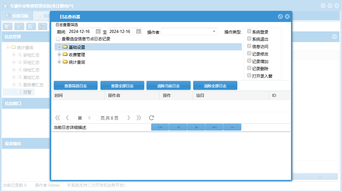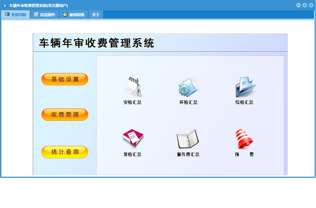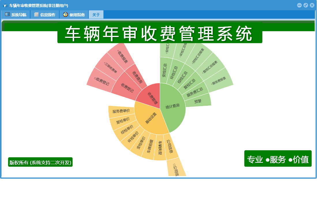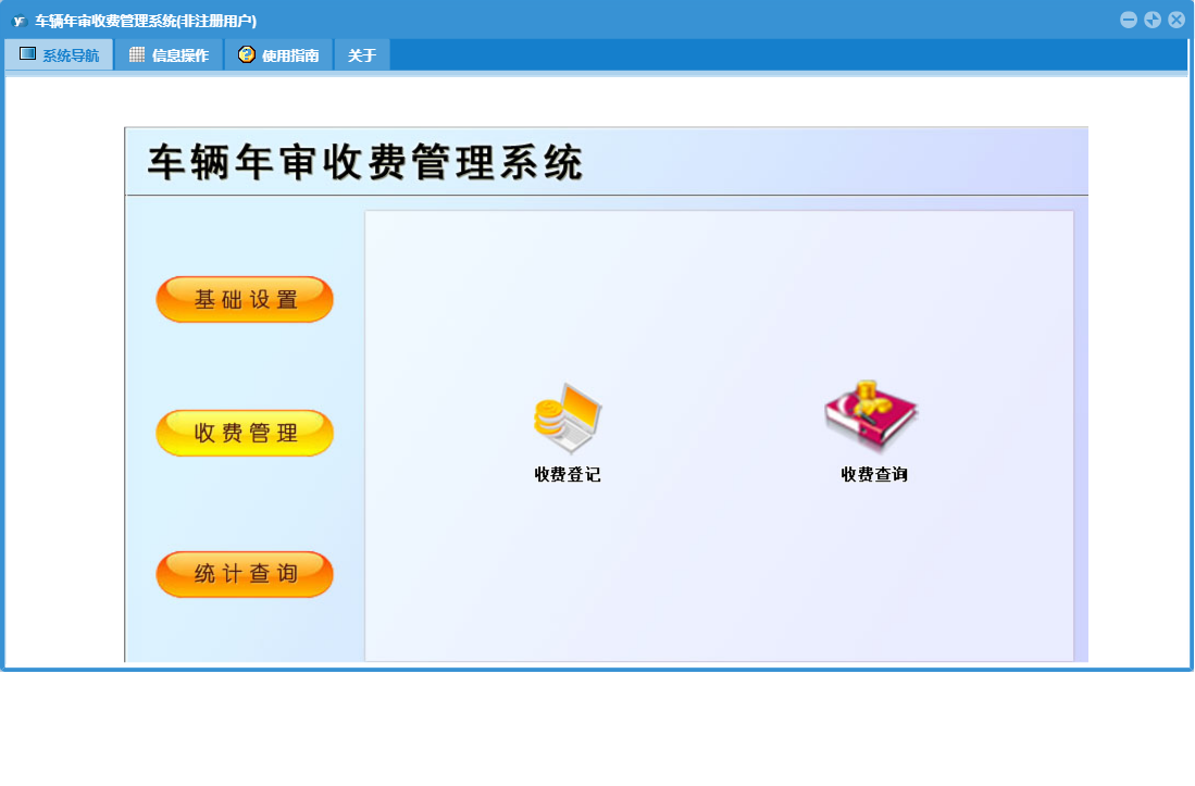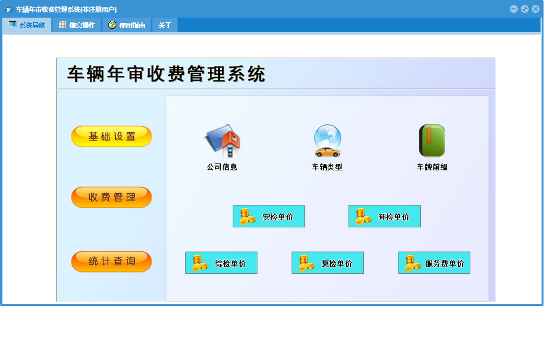 车辆年审收费管理系统包含以下功能:基础设置、公司信息、日志、关于、权限设置、统计查询、收费登记、收费管理等
