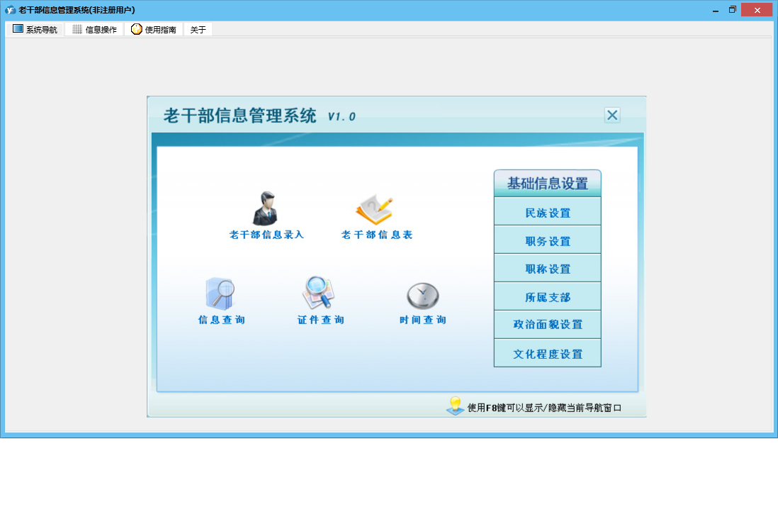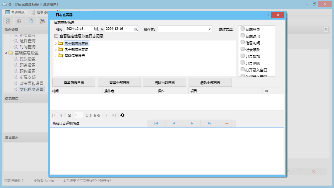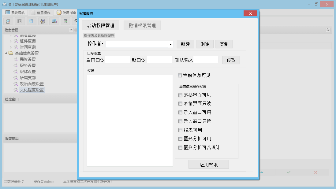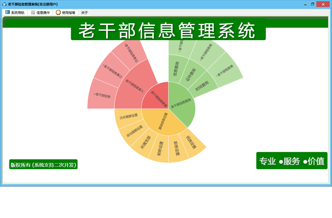老干部信息管理系统包含以下功能:老干部信息、日志、关于、权限设置、老干部信息录入等
