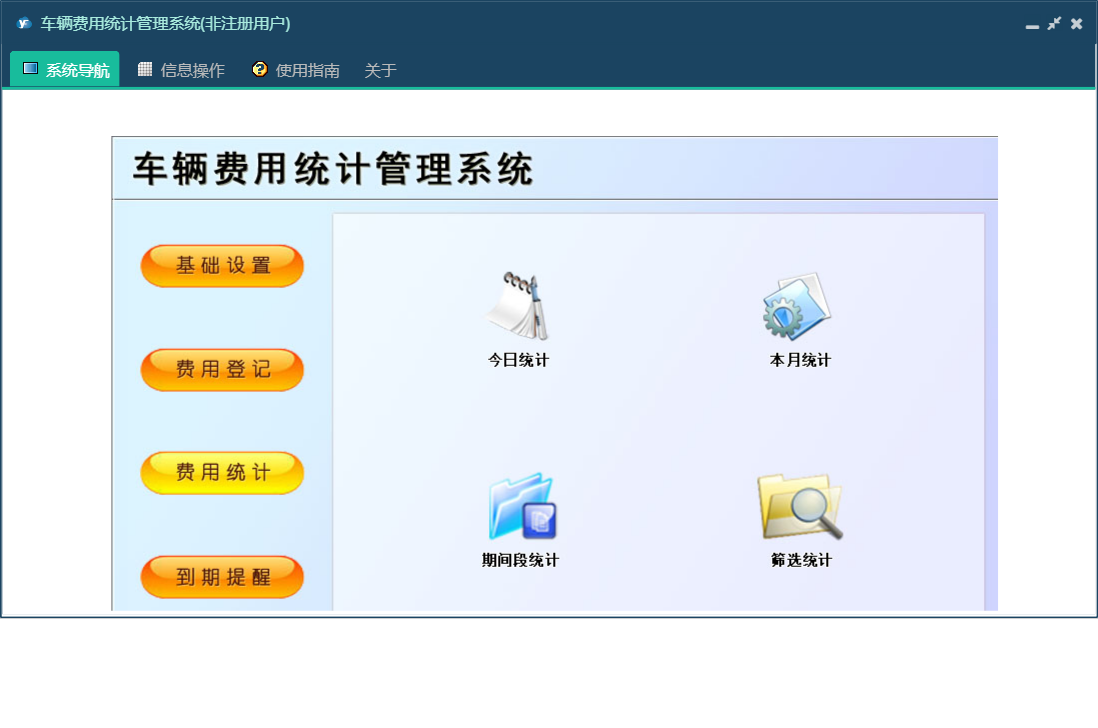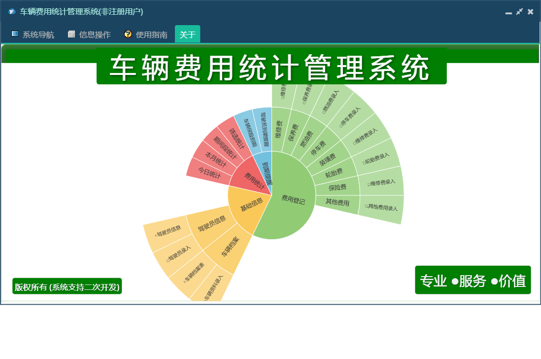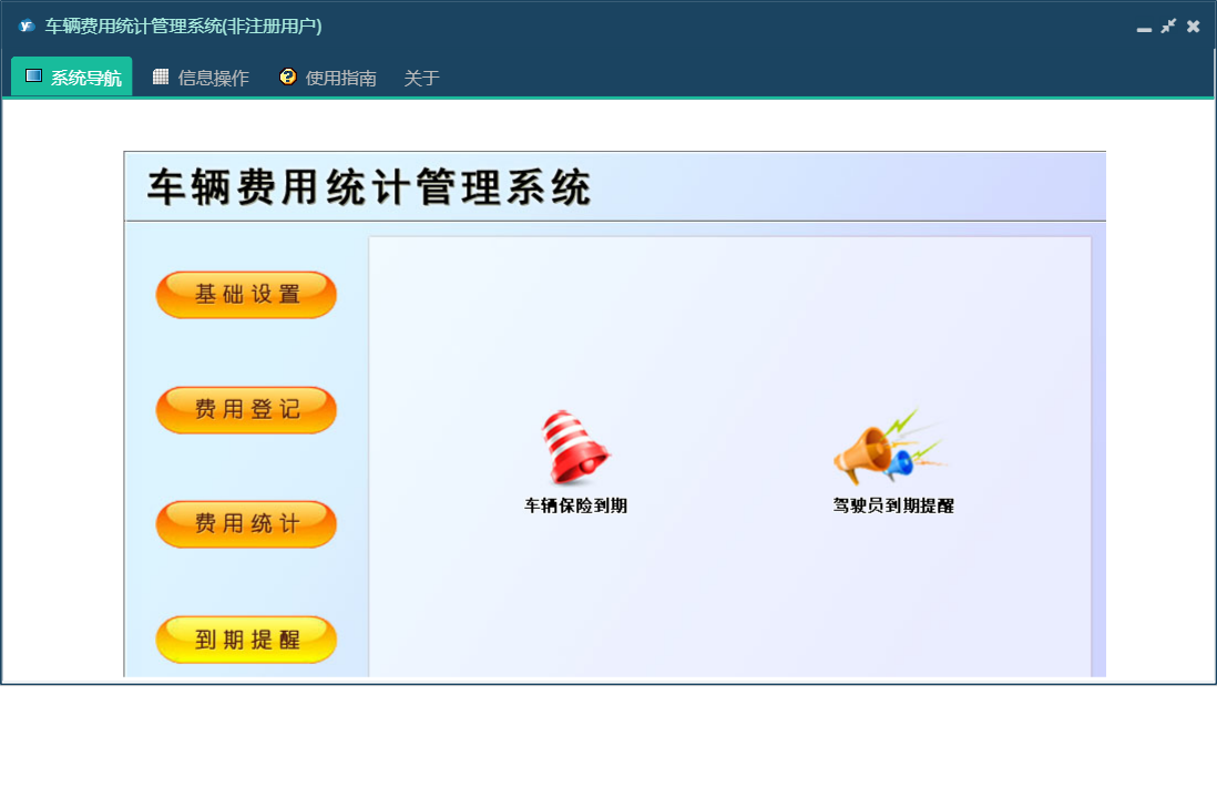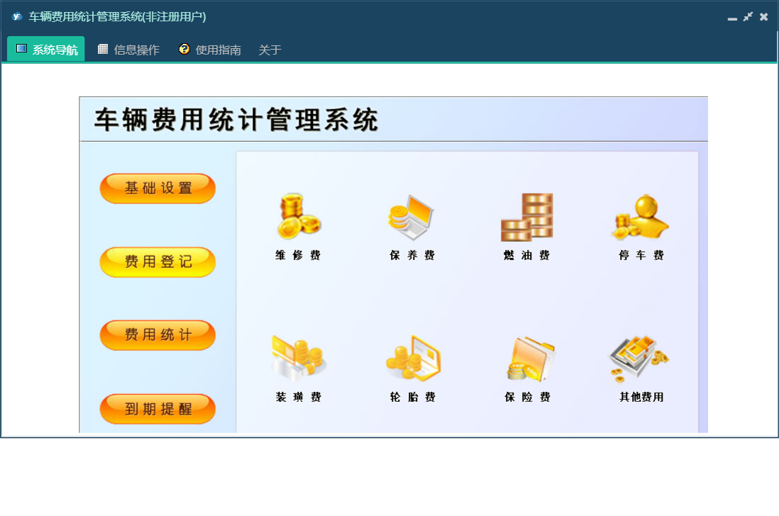 车辆费用统计管理系统包含以下功能:保养费、费用统计、基础信息、装璜费、其他费用、驾驶员信息、车辆档案、保险费、费用登记、日志、关于、权限设置、到期提醒、燃油费、停车费、维修费、轮胎费等