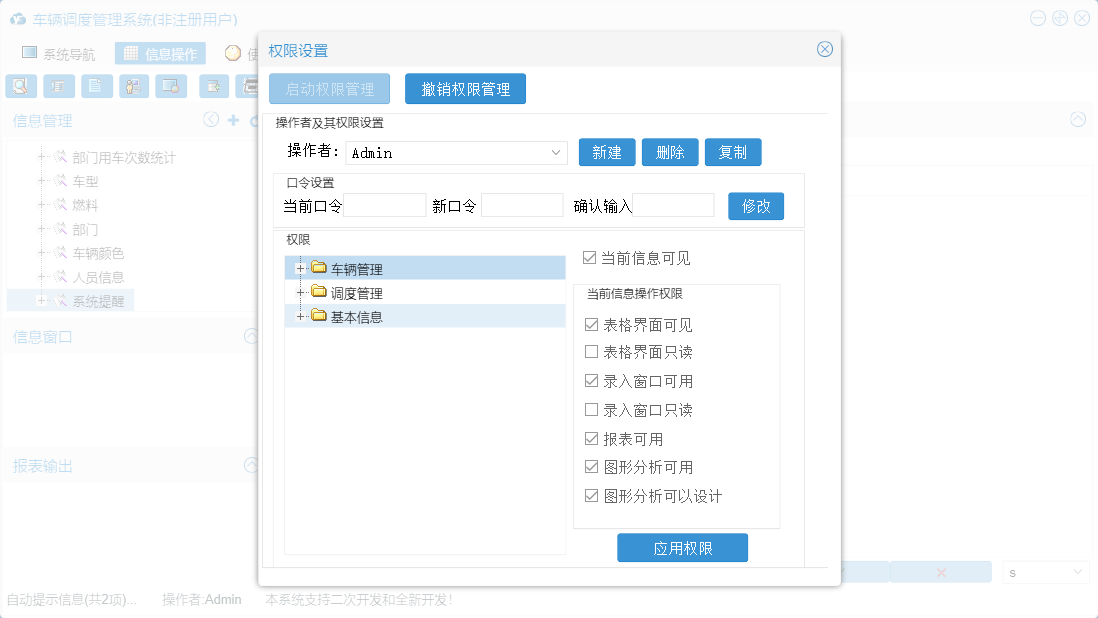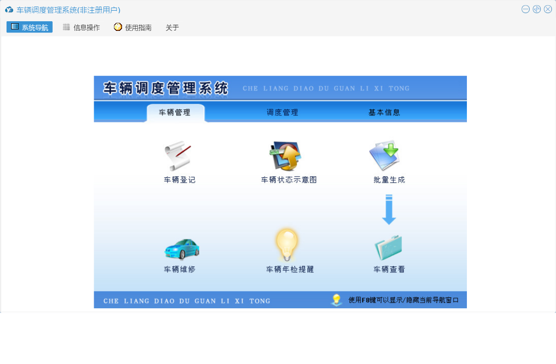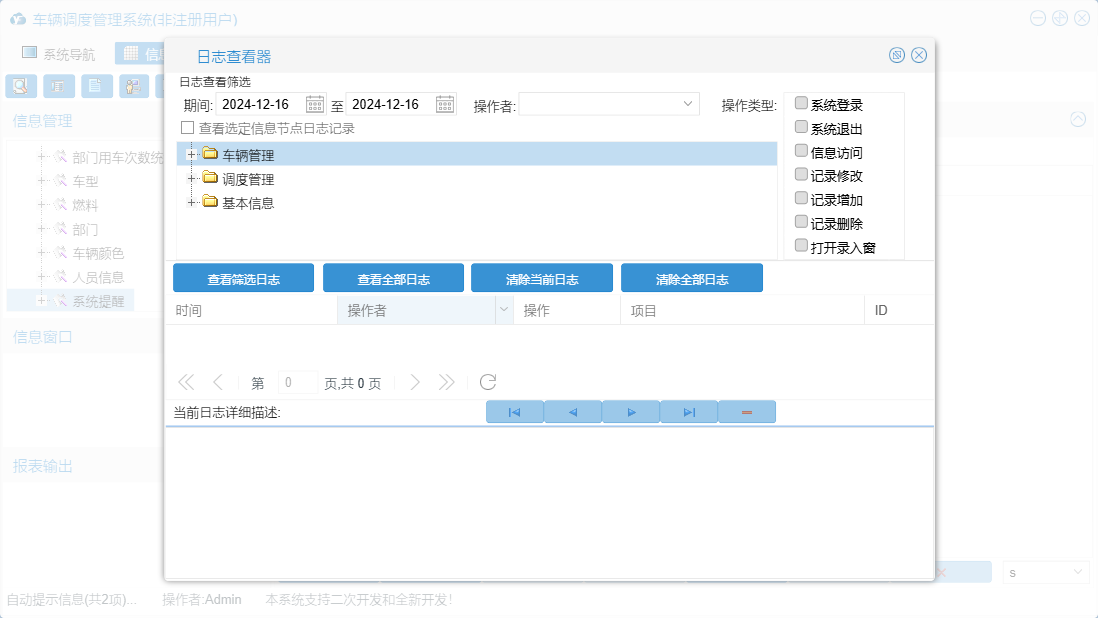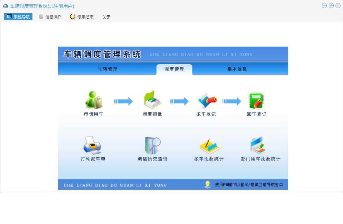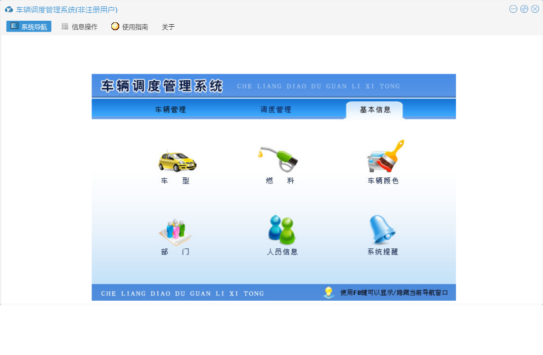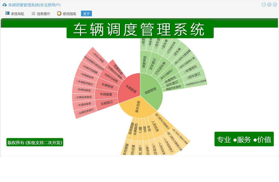 车辆调度管理系统包含以下功能:车辆颜色、车辆年检提醒、系统提醒、车型、部门、调度审批、车辆管理、打印派车单、燃料、权限设置、派车次数统计、调度管理、车辆查看、回车登记、派车登记、申请用车、调度历史查询、部门用车次数统计、车辆登记、车辆状态示意图、关于、基本信息、日志、车辆维修、人员信息等