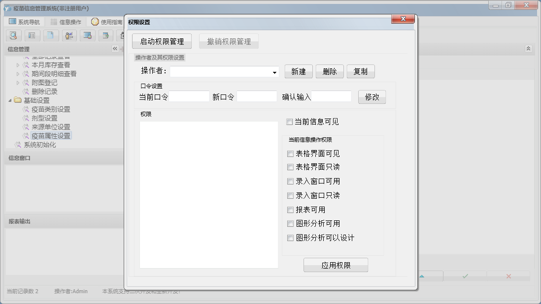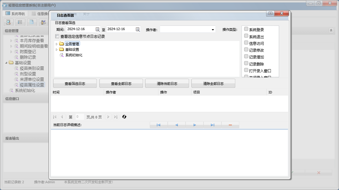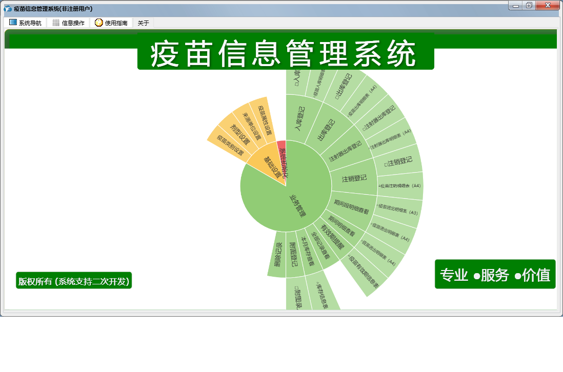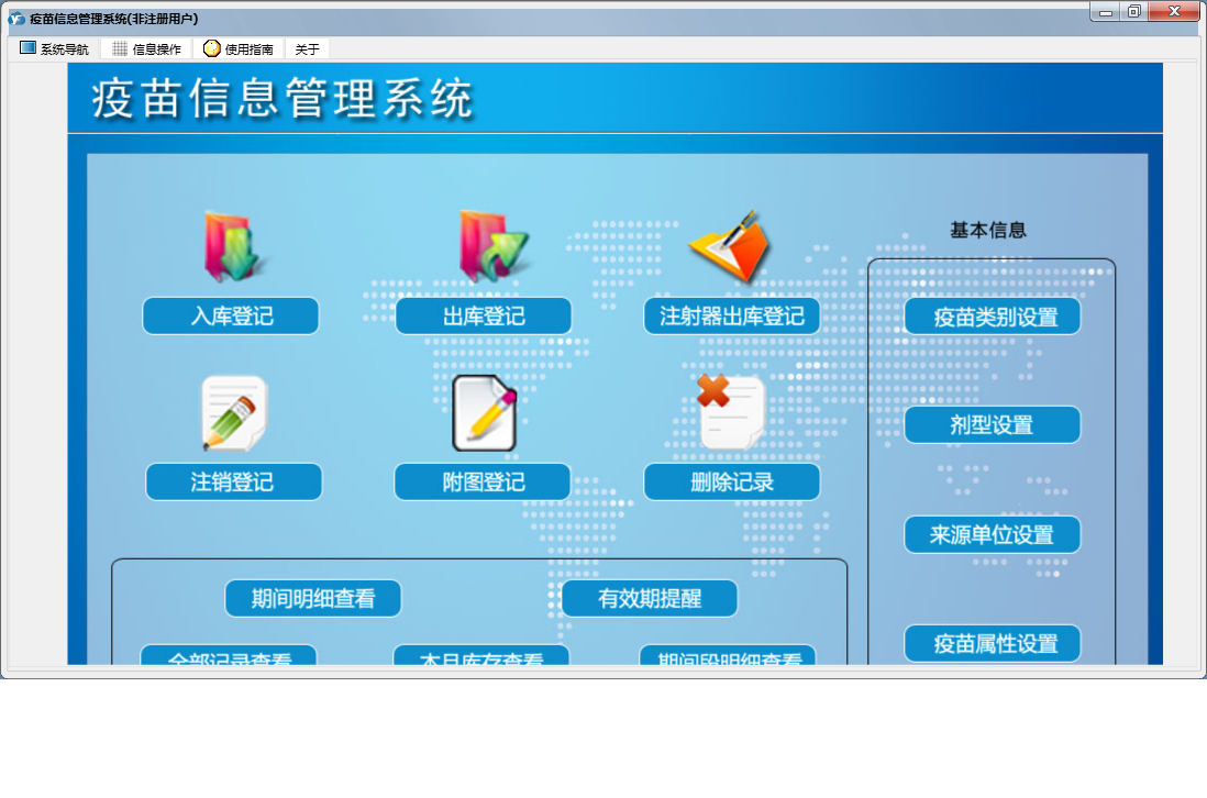 疫苗信息管理系统包含以下功能:注射器出库登记、面板、入库登记、出库登记、日志、注销登记、附图登记、关于、权限设置等