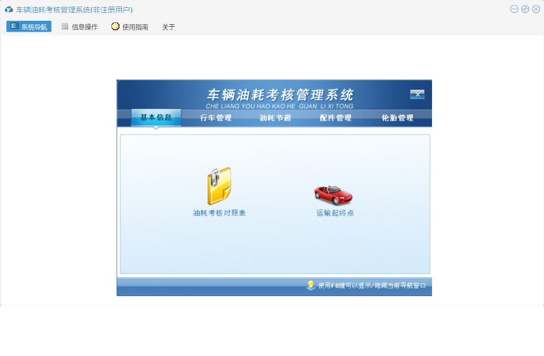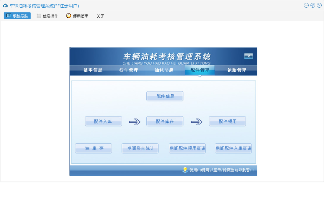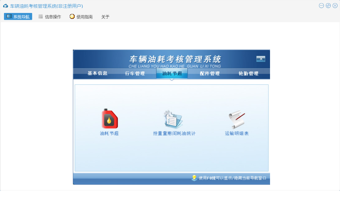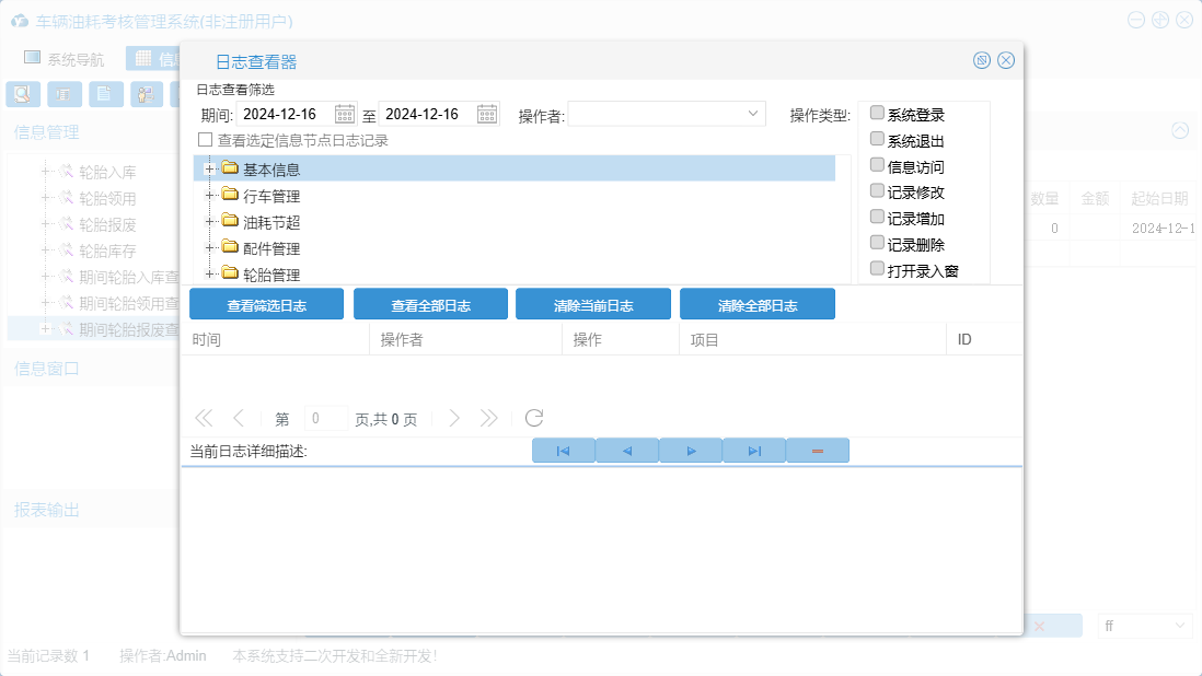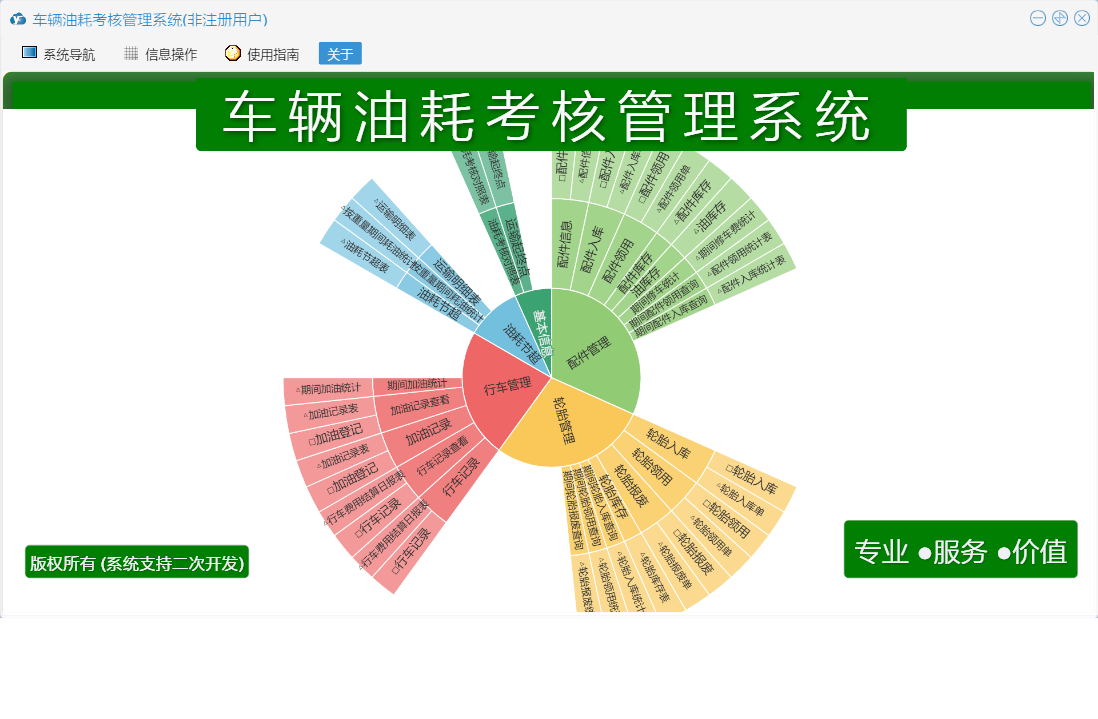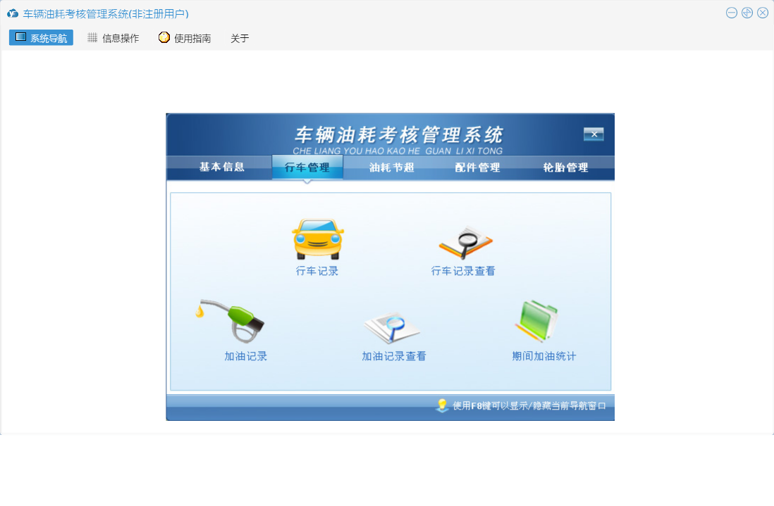 车辆油耗考核管理系统包含以下功能:行车记录、配件入库、轮胎入库、权限设置、运输起终点、轮胎管理、配件信息、轮胎报废、配件管理、配件领用、加油记录、关于、基本信息、轮胎领用、行车管理、行车记录查看、油耗考核对照表、日志、油耗节超、加油记录查看等