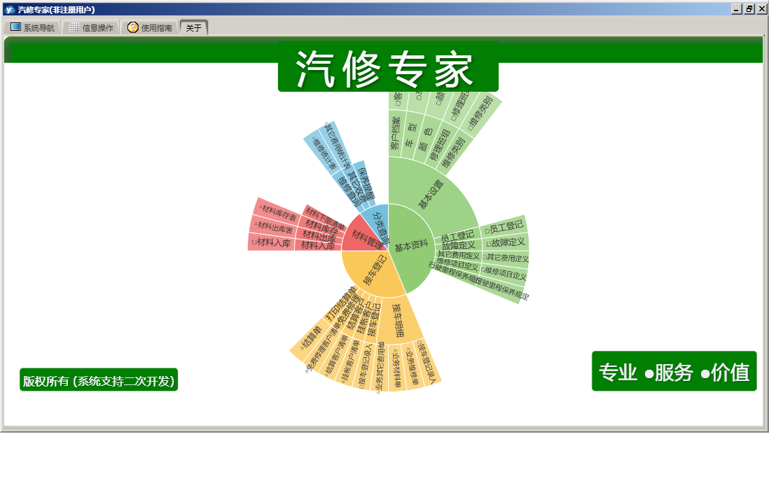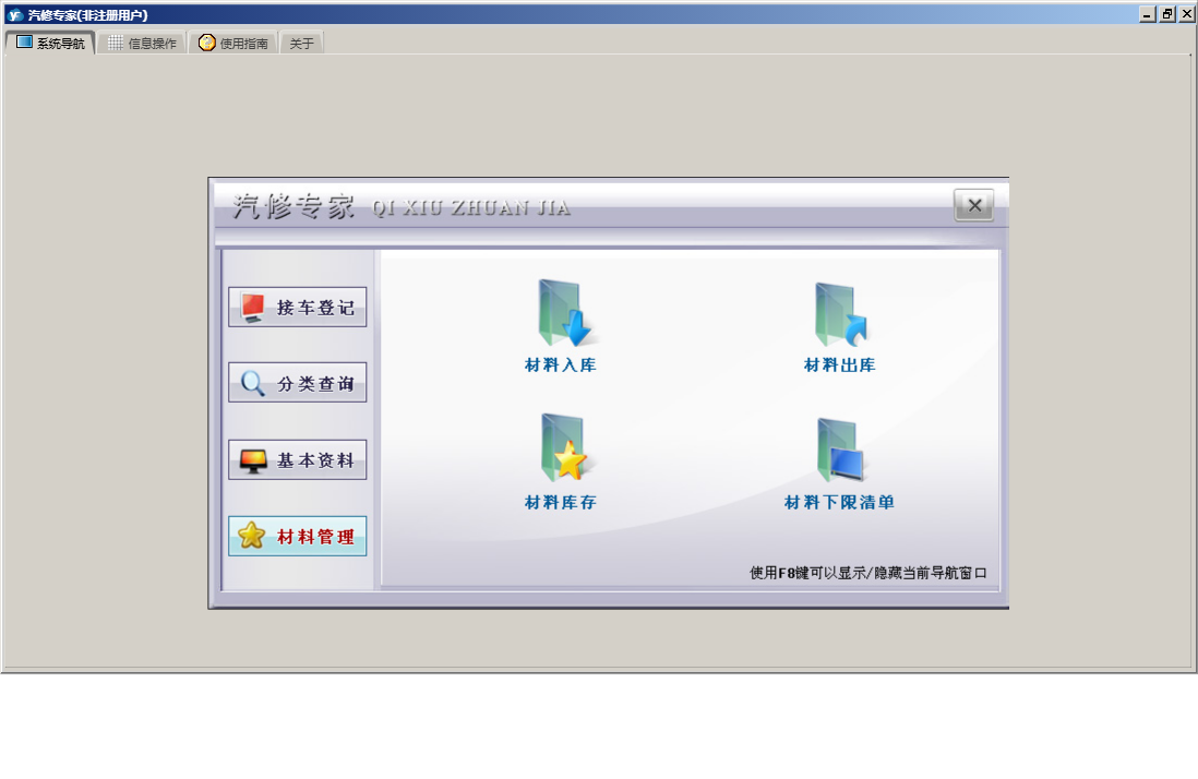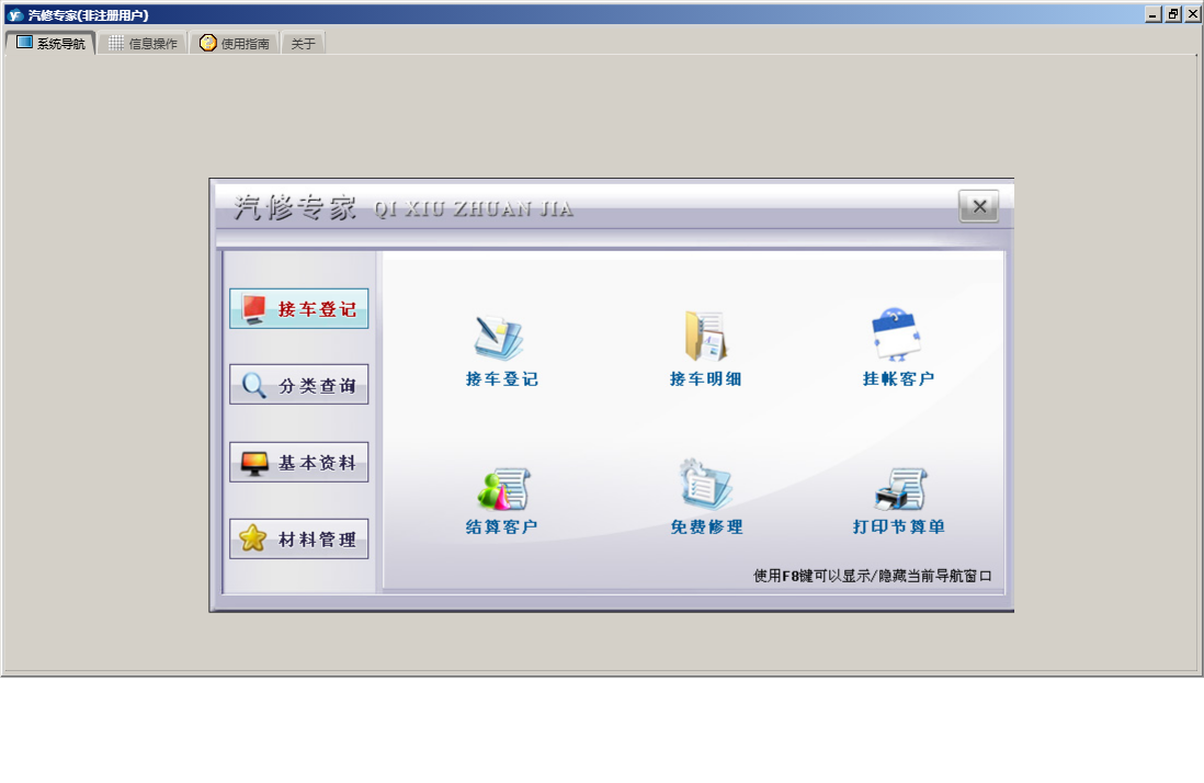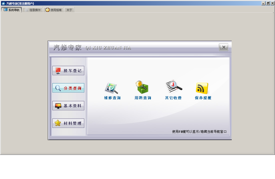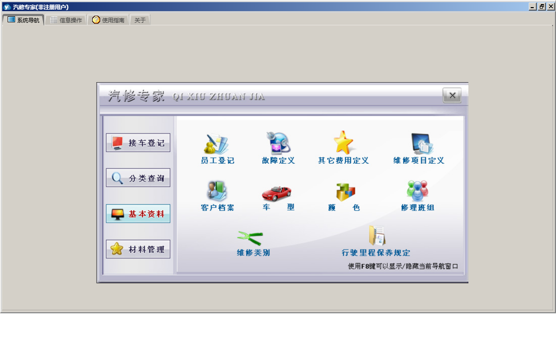 汽修专家包含以下功能:基本资料、分类查询、关于、材料管理、接车登记、接车明细等