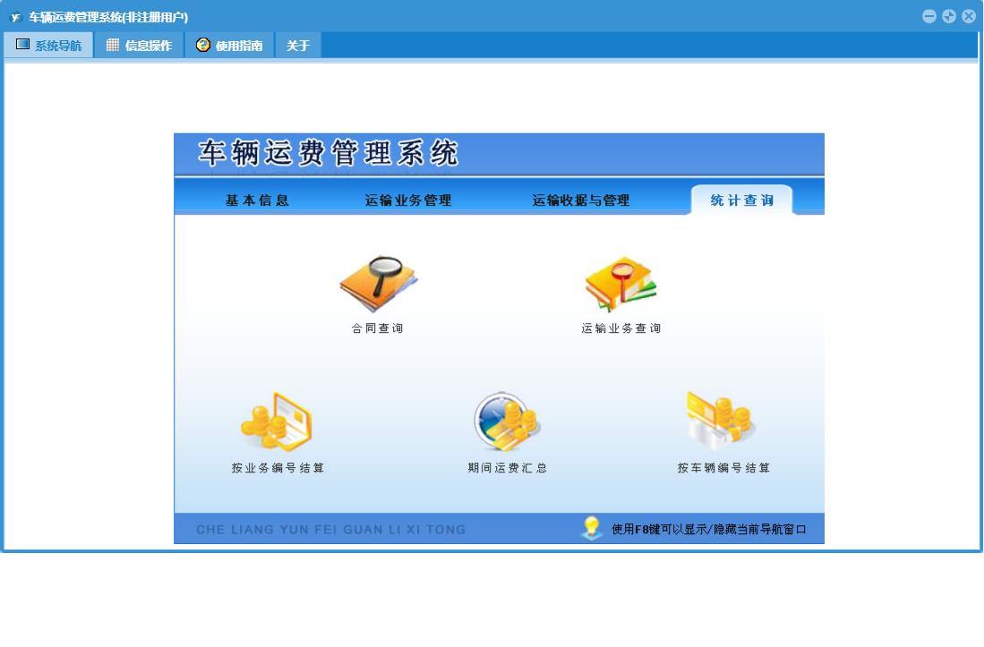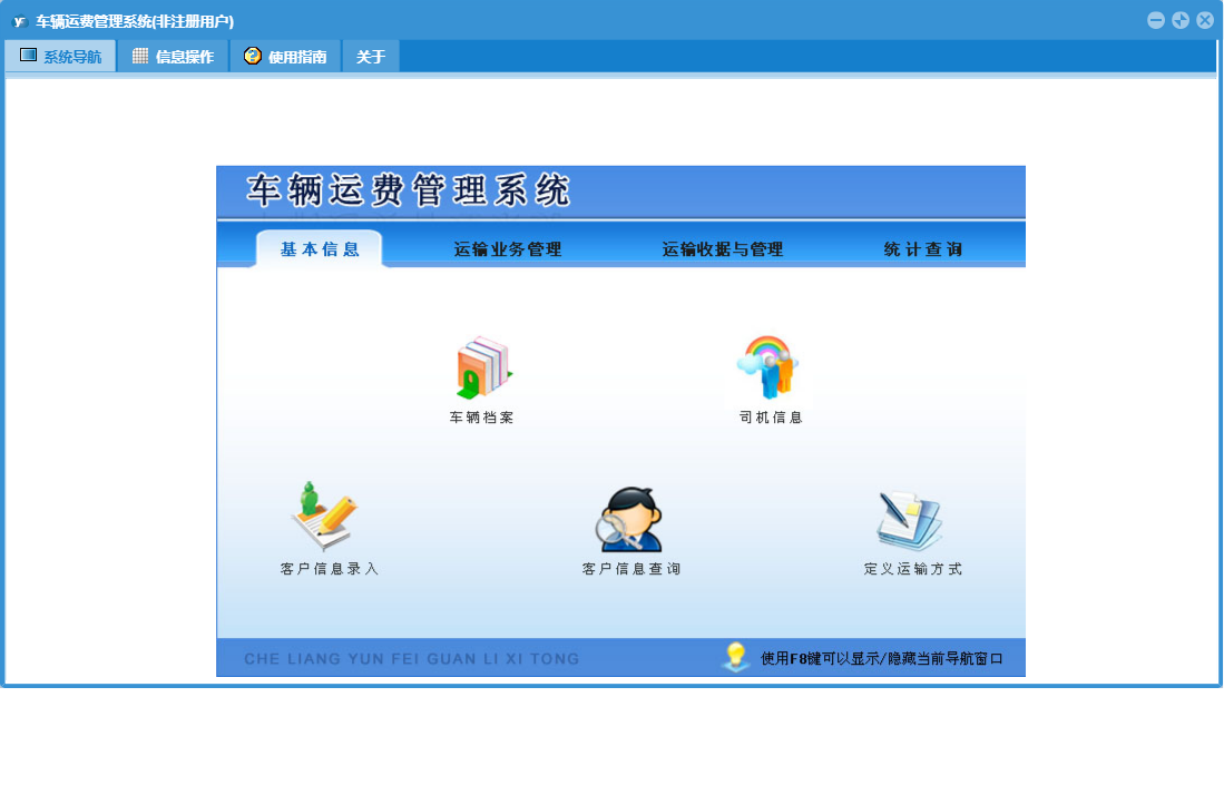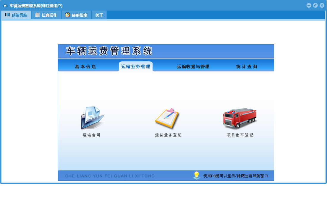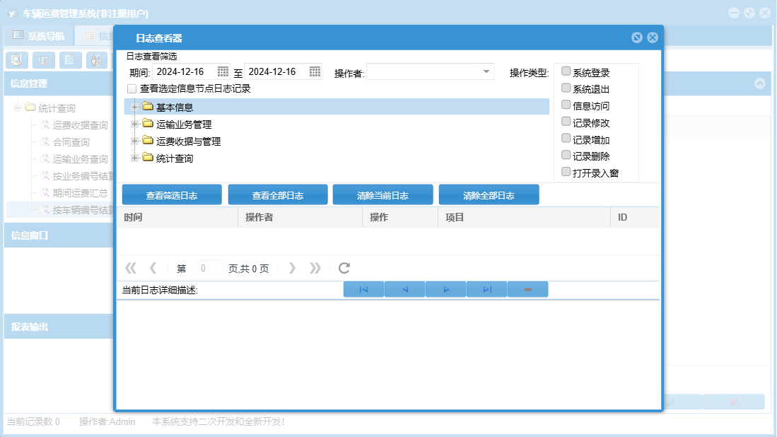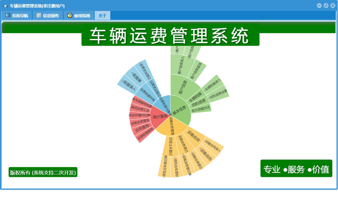车辆运费管理系统包含以下功能:运费支出登记、客户信息录入、车辆运输业务登记管理、司机信息、运输合同、日志、运输业务登记、关于、基本信息、权限设置、统计查询、运费收据开具、项目出车登记、运费收据与管理、车辆档案等