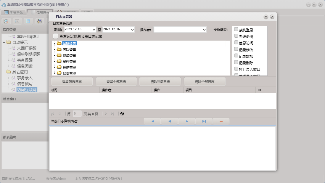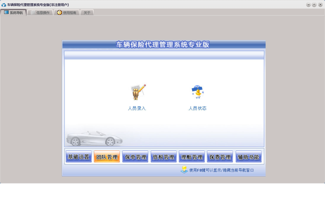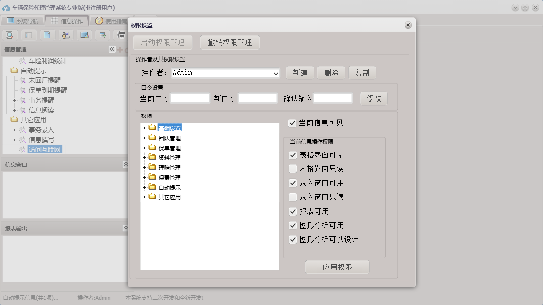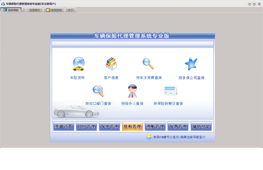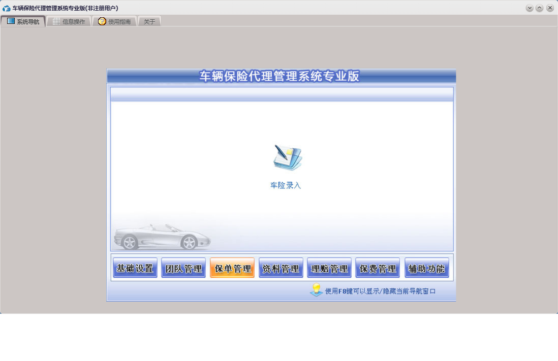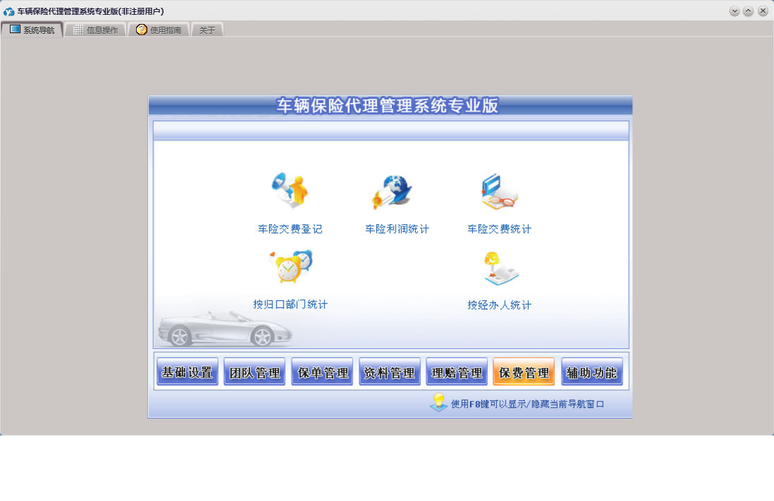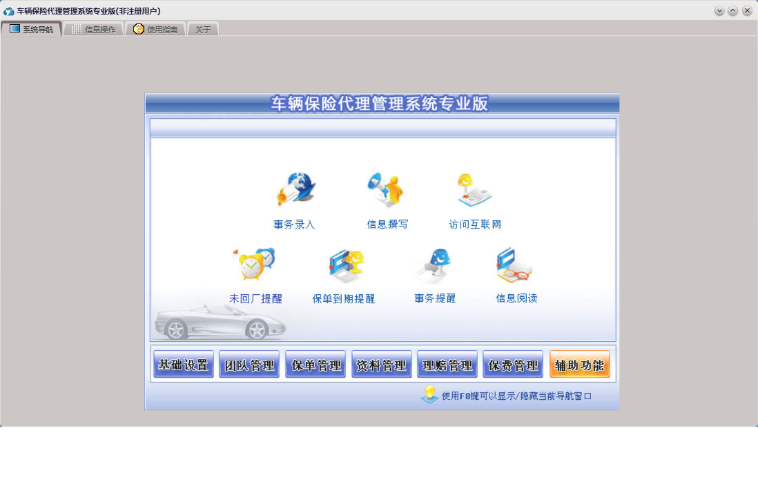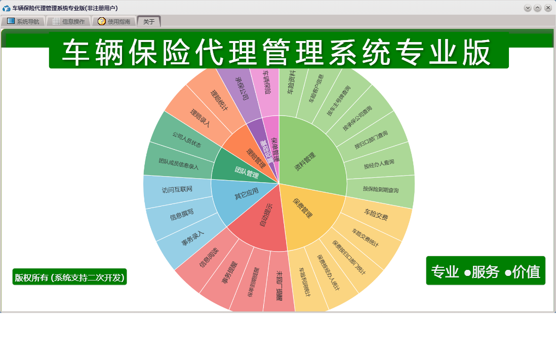 车辆保险代理管理系统专业版包含以下功能:车险交费、基础设置、团队设置、团队成员信息录入、理赔录入、资料管理、保单管理、保费管理、其他应用、事务录入、权限设置、关于、理赔管理、事务提醒、信息阅读、承保公司、日志、车辆保险、信息撰写等
