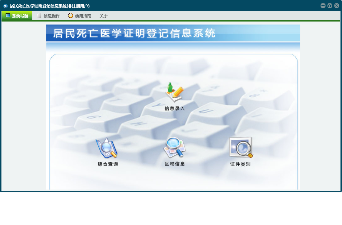 居民死亡医学证明登记信息系统包含以下功能:关于、面板等