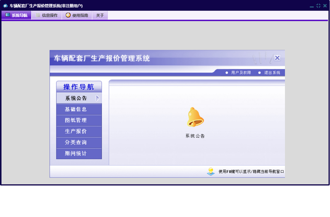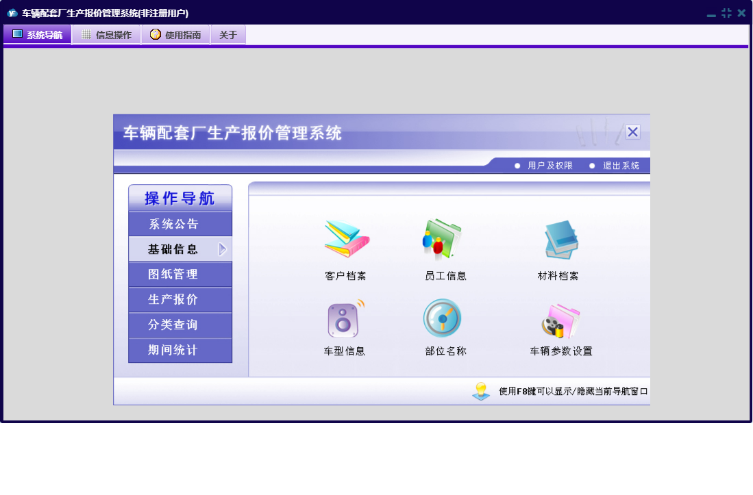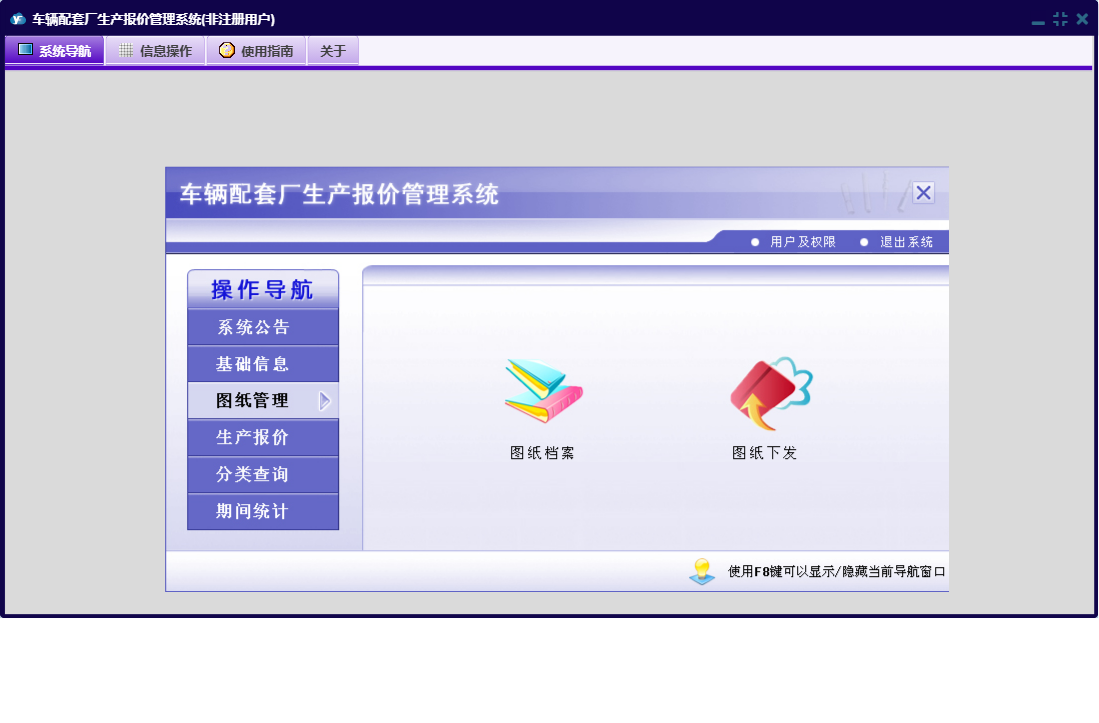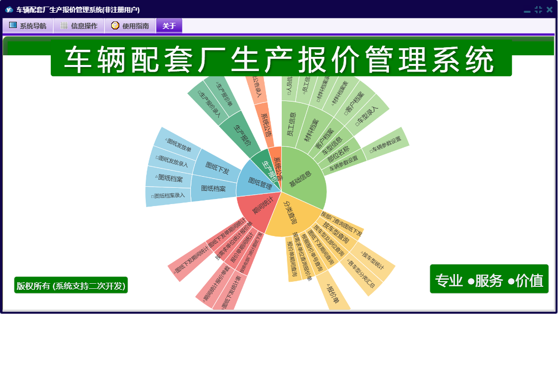 车辆配套厂生产报价管理系统包含以下功能:系统公告、客户档案、基础信息、期间统计、生产报价、材料档案、员工信息、车型信息、日志、分类查询、图纸档案、关于、权限设置、图纸下发、图纸管理等