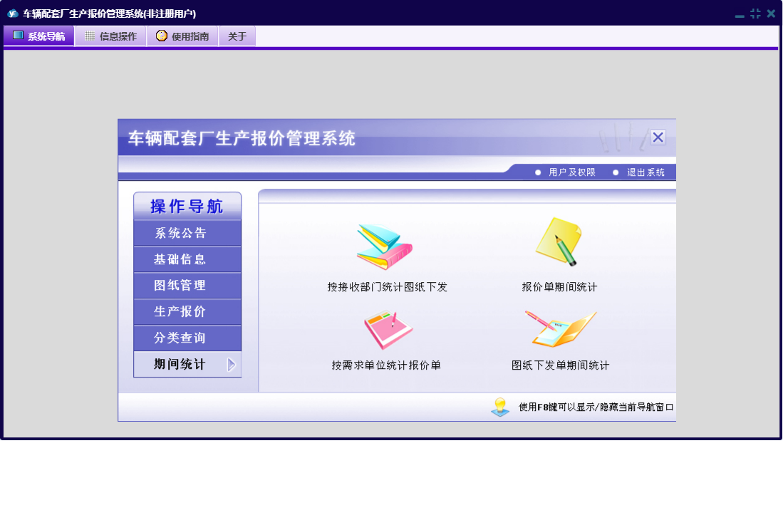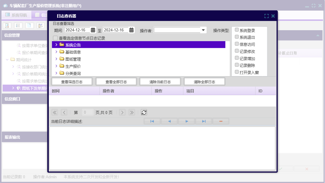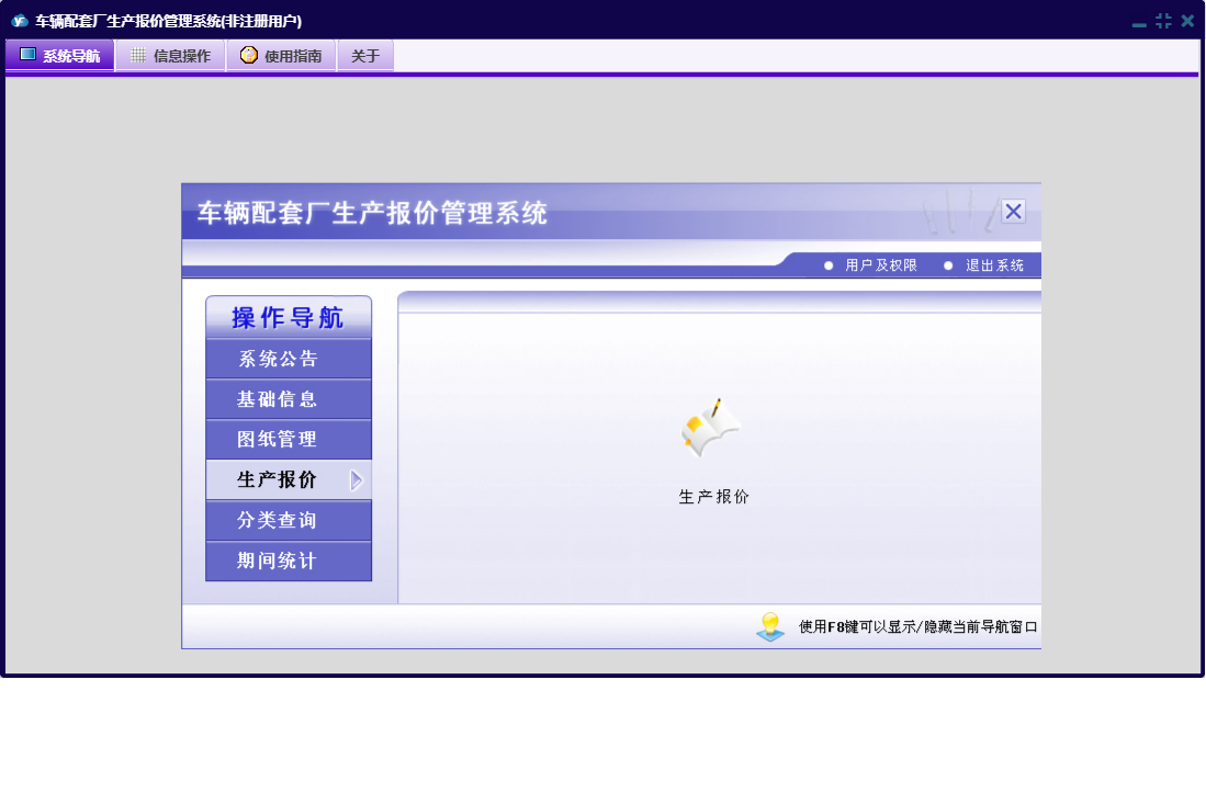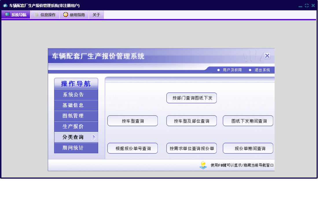 车辆配套厂生产报价管理系统包含以下功能:系统公告、客户档案、基础信息、期间统计、生产报价、材料档案、员工信息、车型信息、日志、分类查询、图纸档案、关于、权限设置、图纸下发、图纸管理等