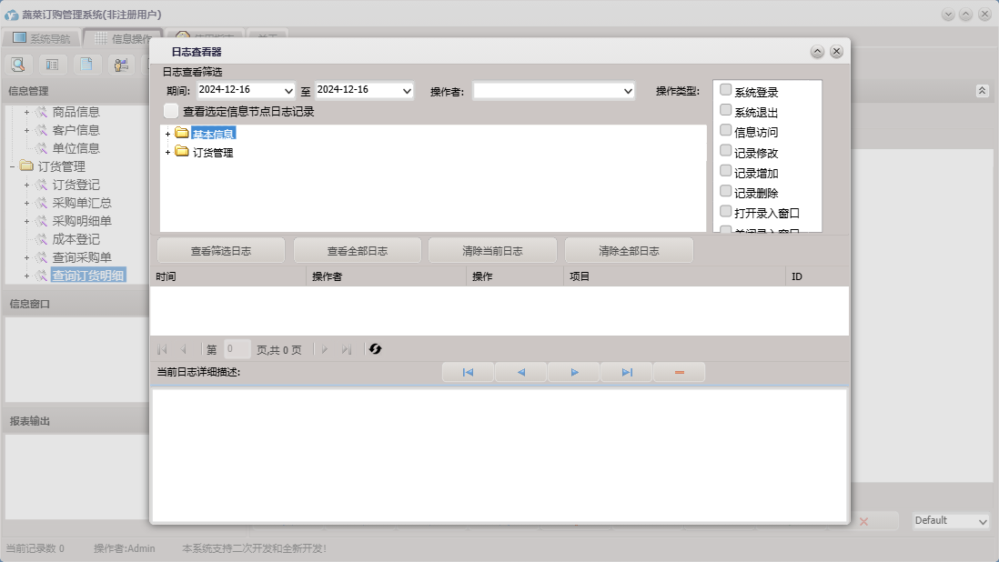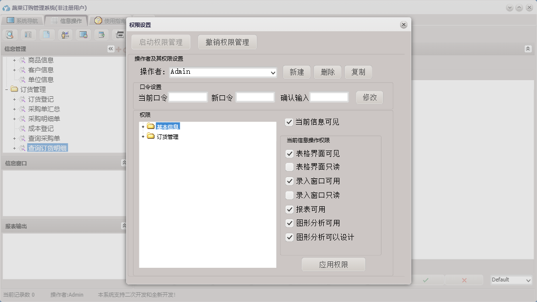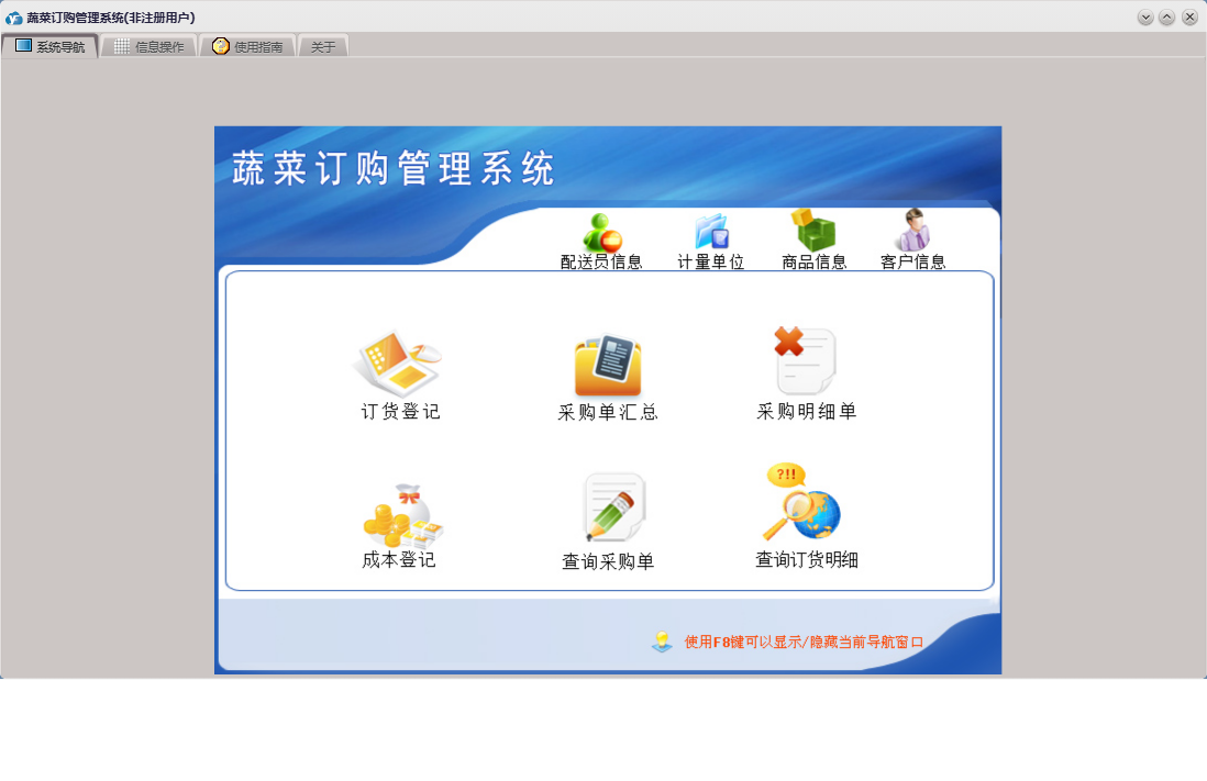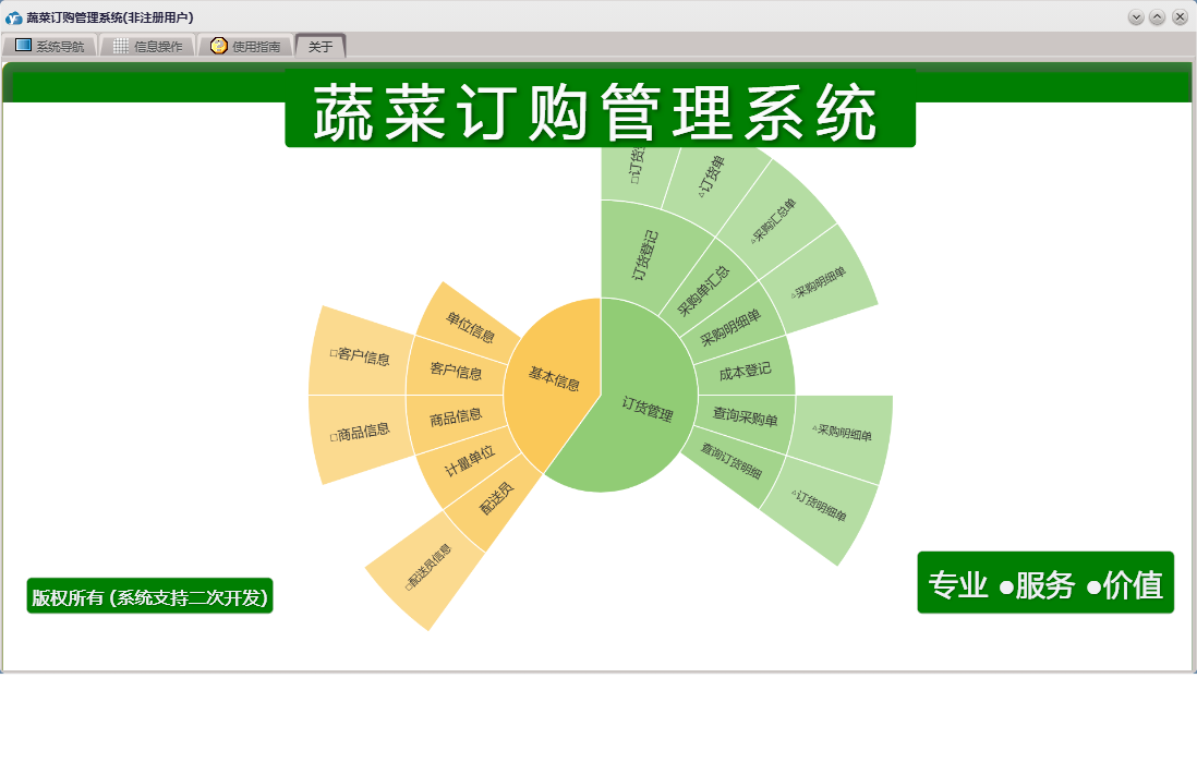 蔬菜订购管理系统包含以下功能:订货登记、面板、商品信息、日志、配送员、关于、权限设置、客户信息等