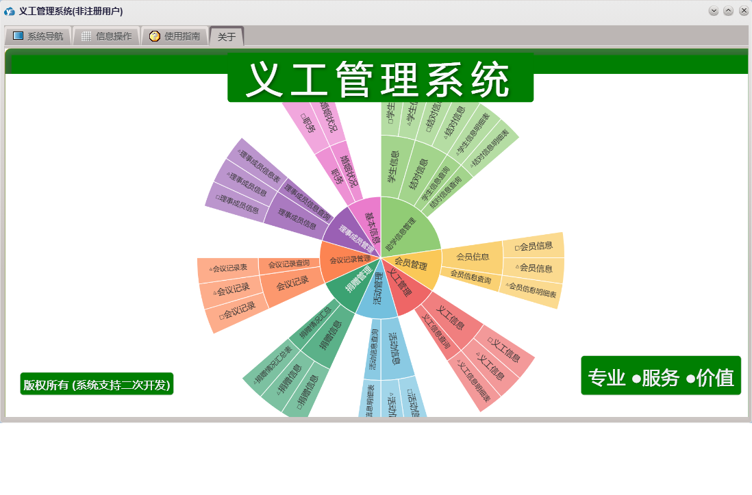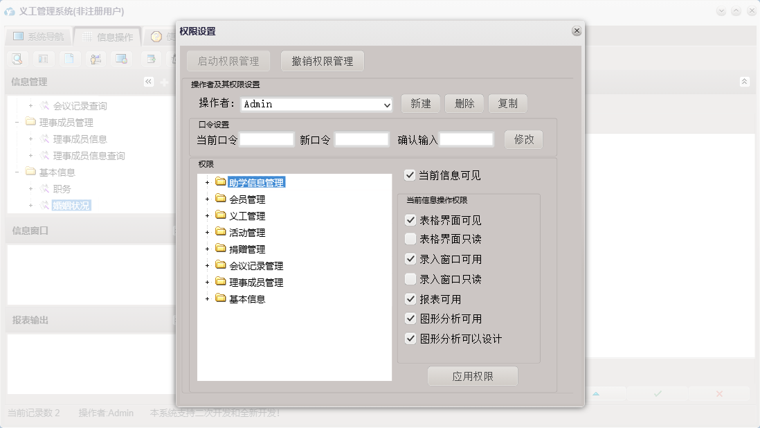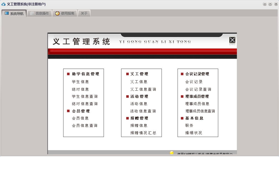 义工管理系统包含以下功能:捐赠信息、会员信息、面板、会议记录、学生信息、日志、职务、理事成员信息、结对信息、关于、活动信息、婚姻状况、义工信息、权限设置等