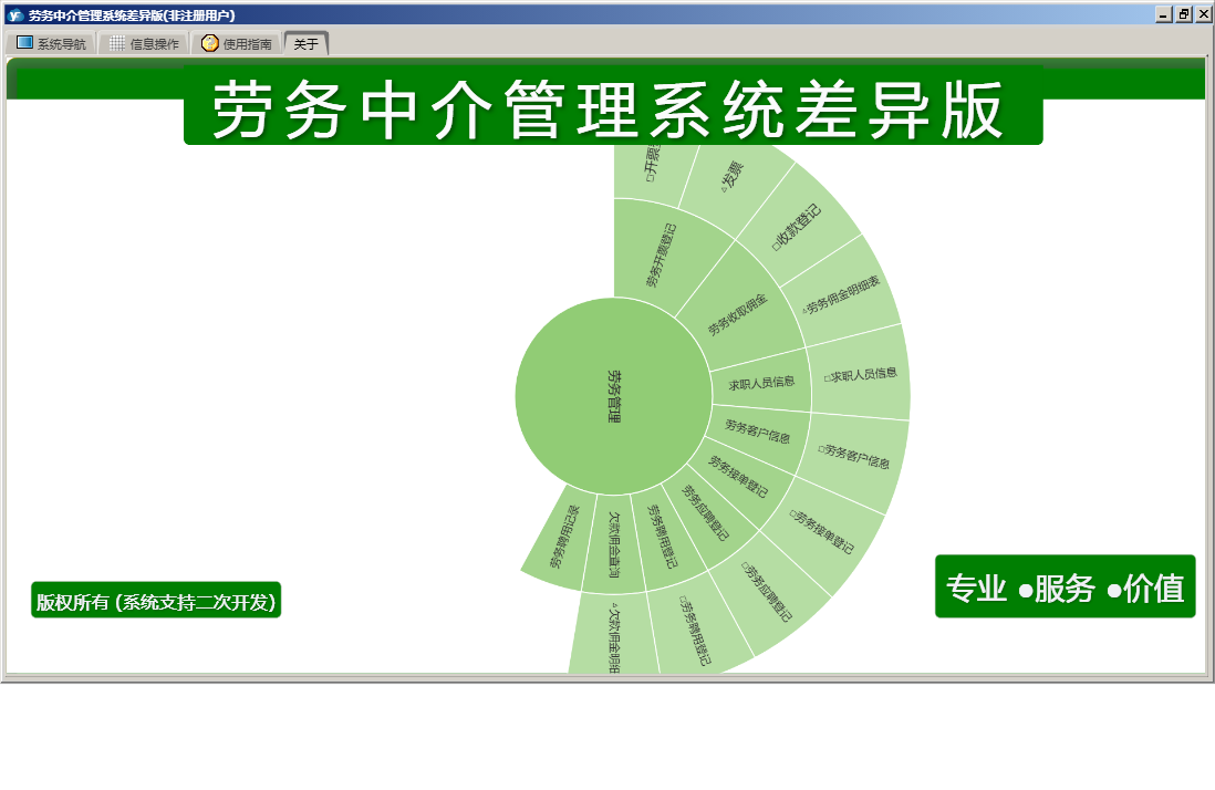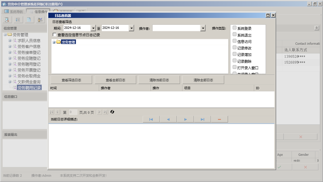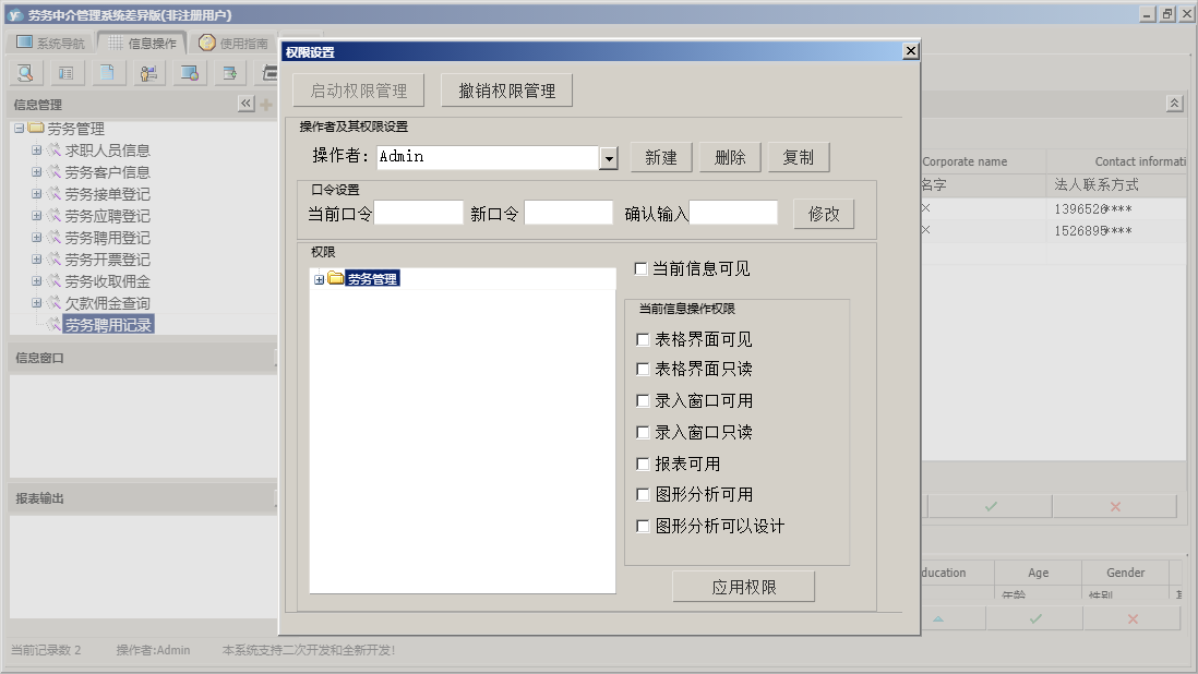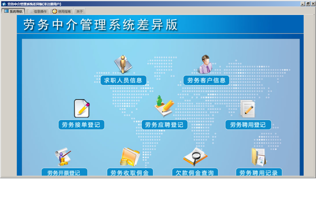 劳务中介管理系统差异版包含以下功能:面板、劳务开票登记、劳务接单登记、日志、劳务应聘登记、劳务客户信息、关于、权限设置、求职人员信息、劳务收取佣金、劳务聘用登记等
