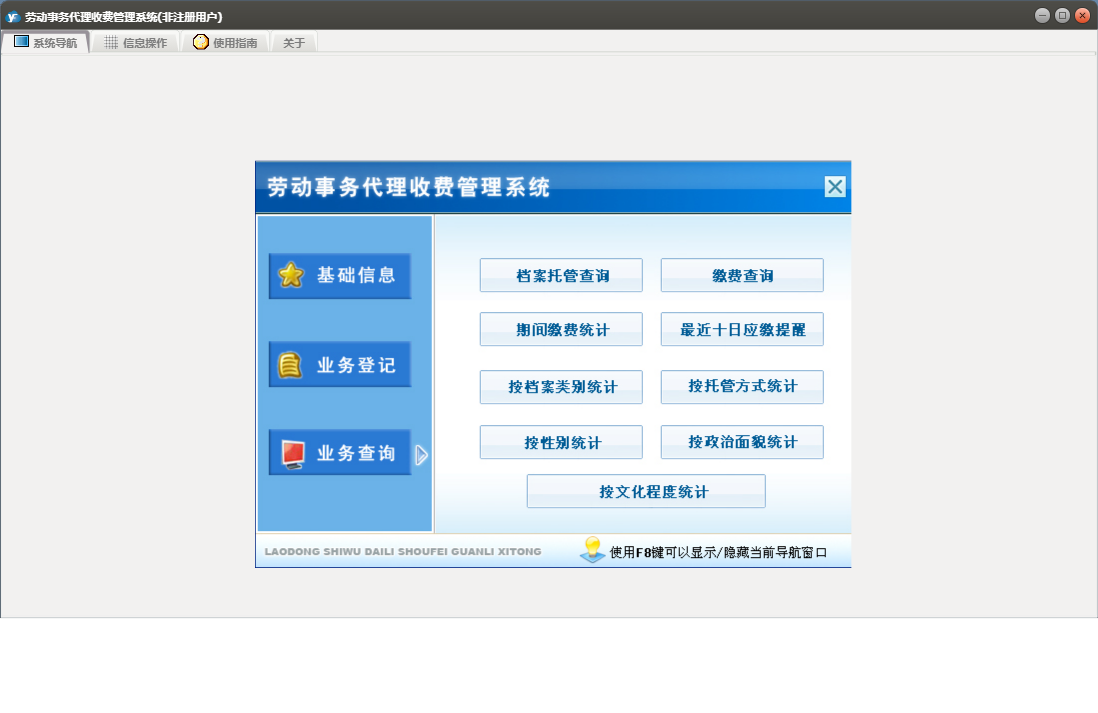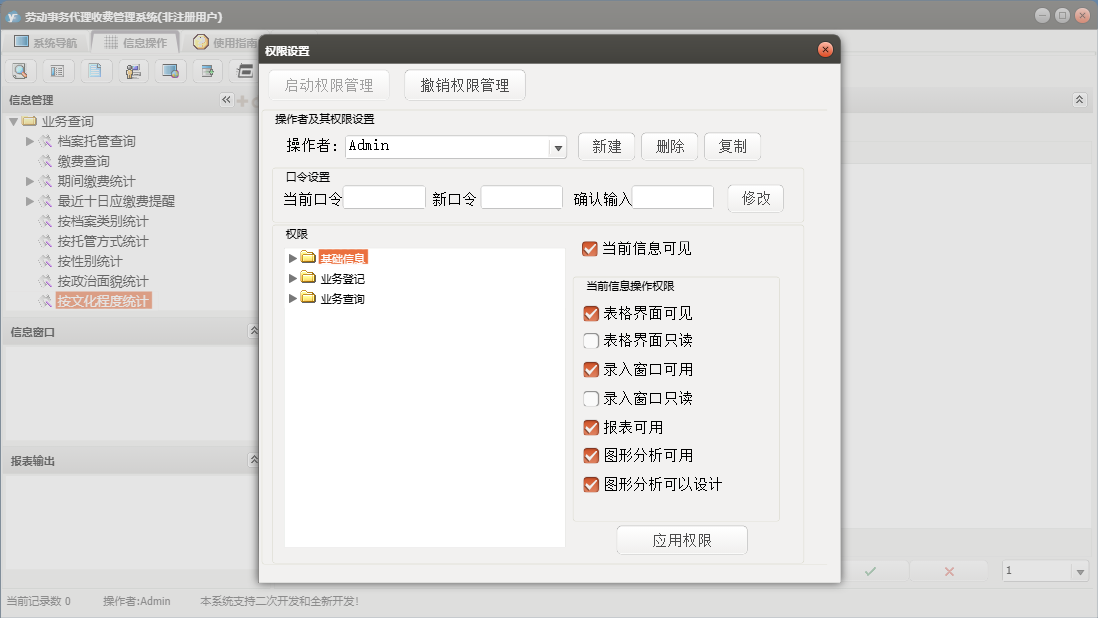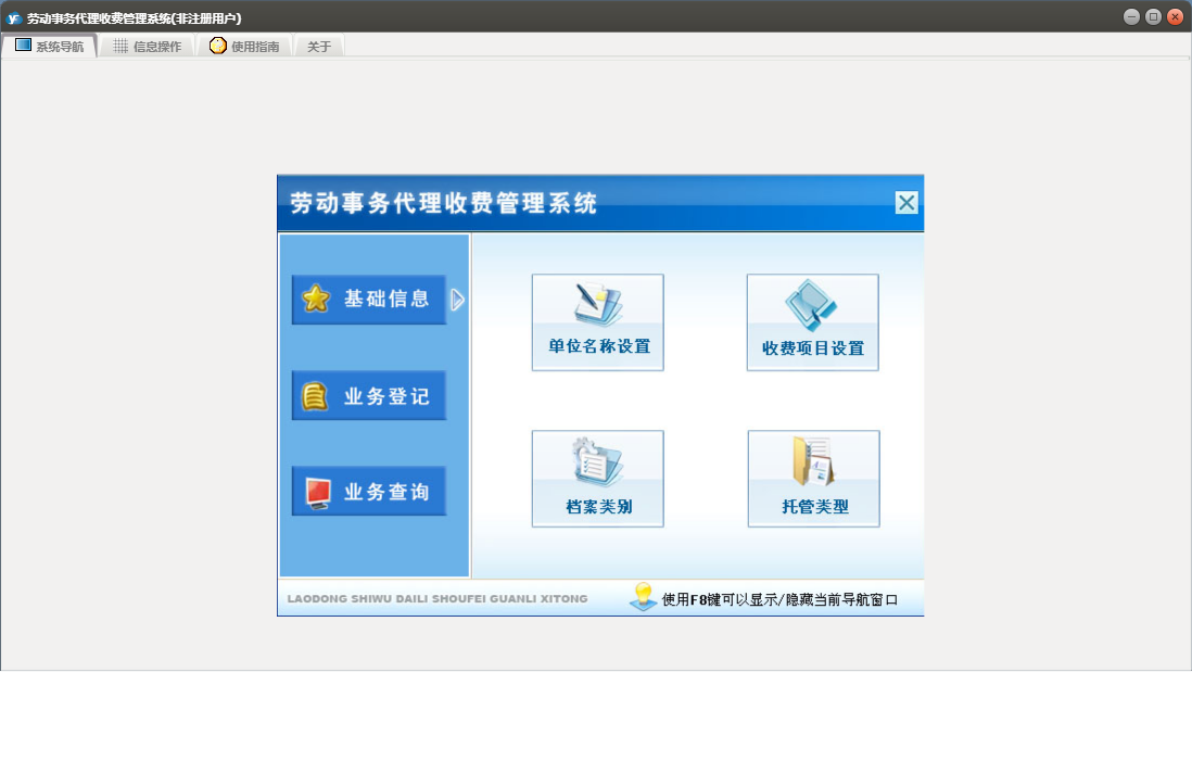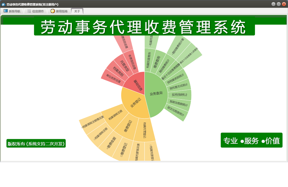 劳动事务代理收费管理系统包含以下功能:基础信息、收费项目设置、档案调转注销、业务登记、日志、档案托管登记、关于、权限设置、缴费登记、业务查询等