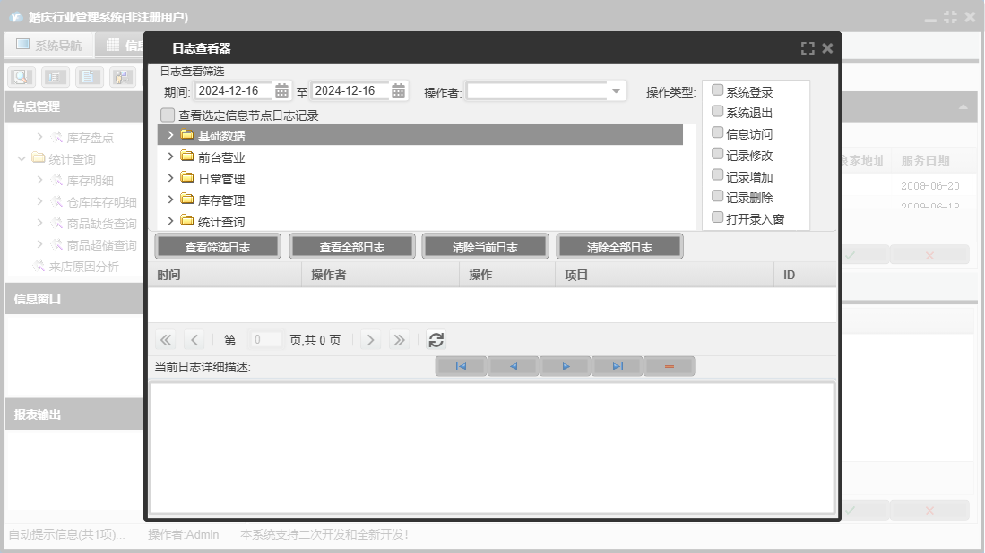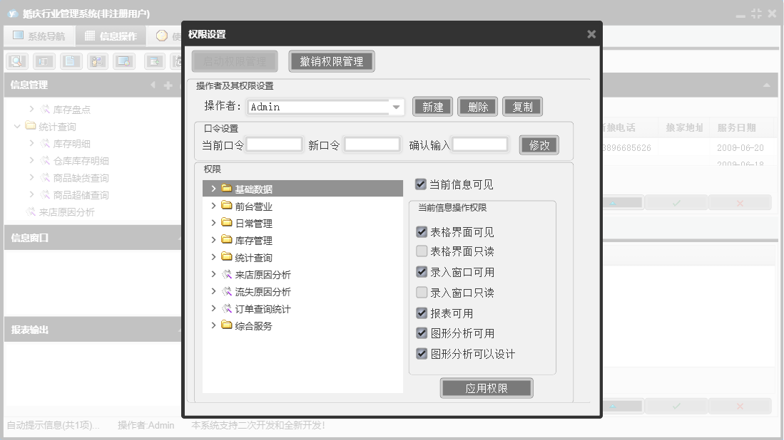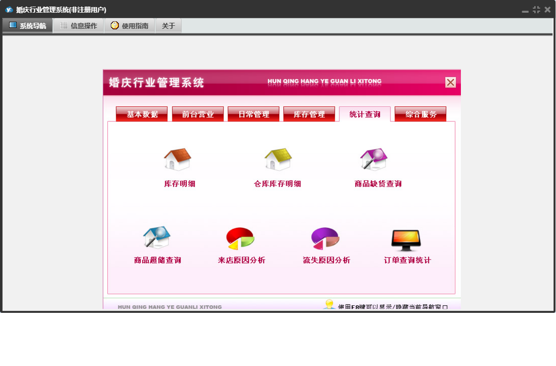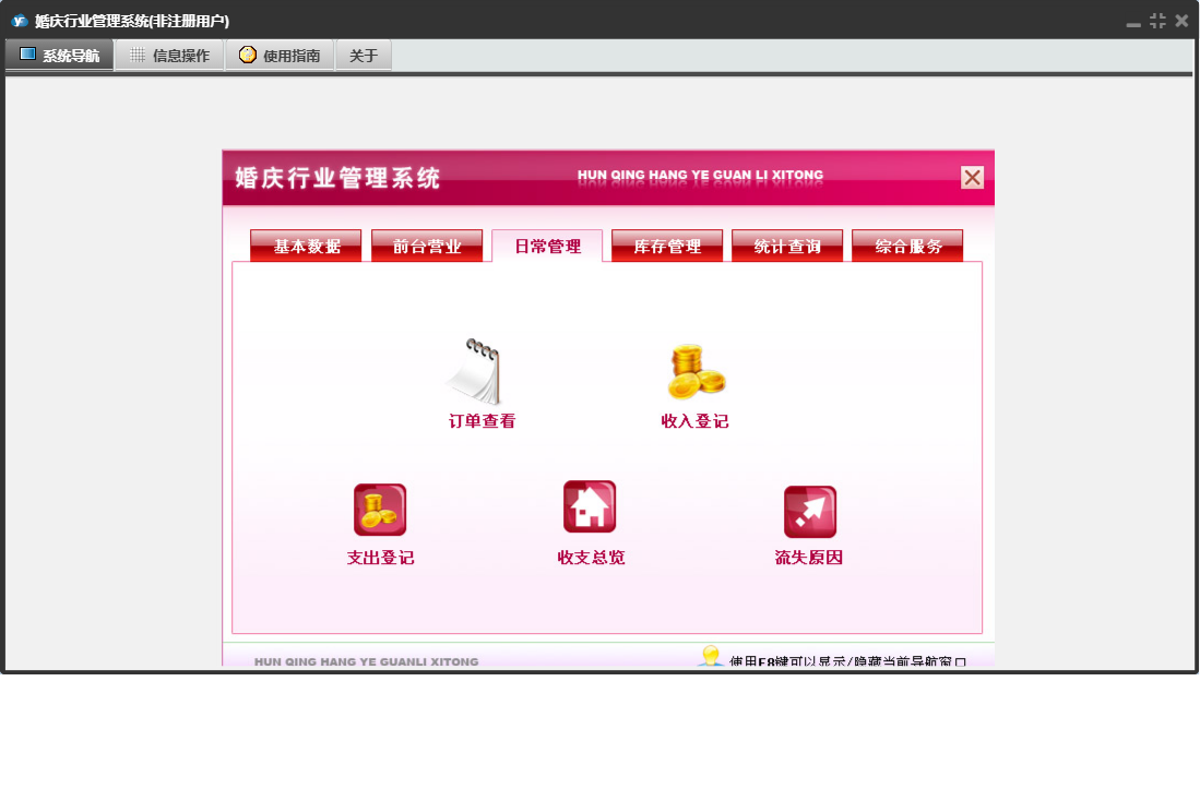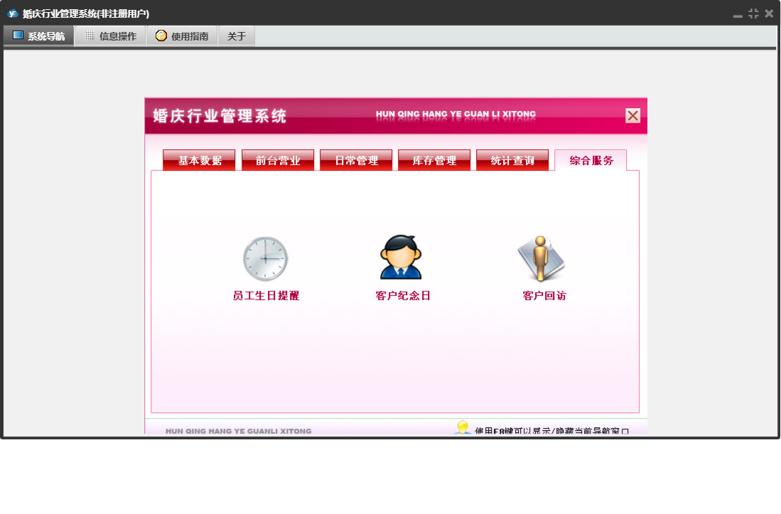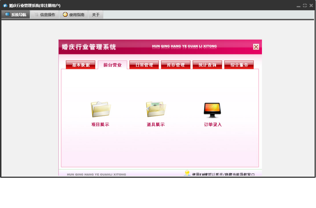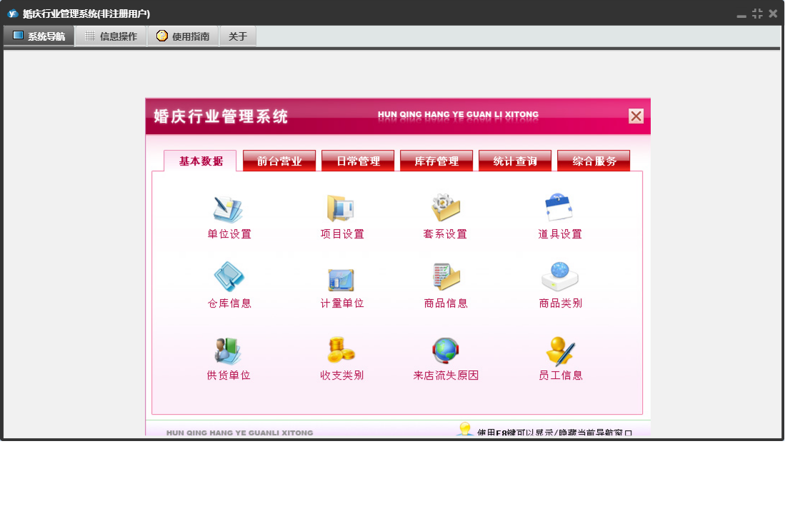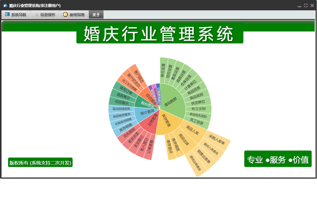婚庆行业管理系统包含以下功能:收入登记、库存调拨、道具展示、销售出库单、采购入库单、基础数据、单位设置、商品信息、统计查询、权限设置、项目设置、仓库信息、综合服务、项目展示、支出登记、库存管理、关于、前台营业、填写订单、日常管理、供货单位、道具设置、库存盘点、员工信息、收支类别、日志、套系设置、客户回访等