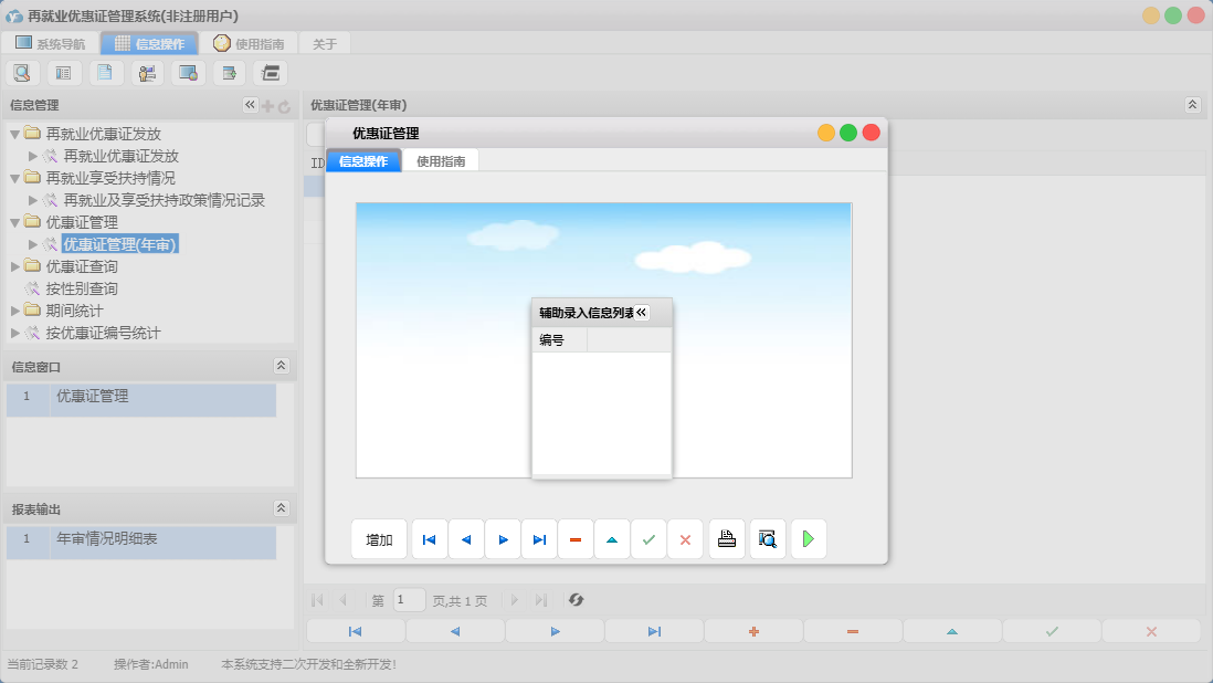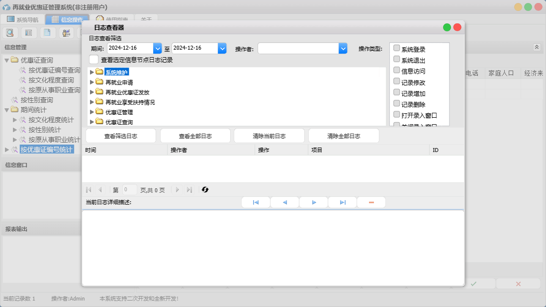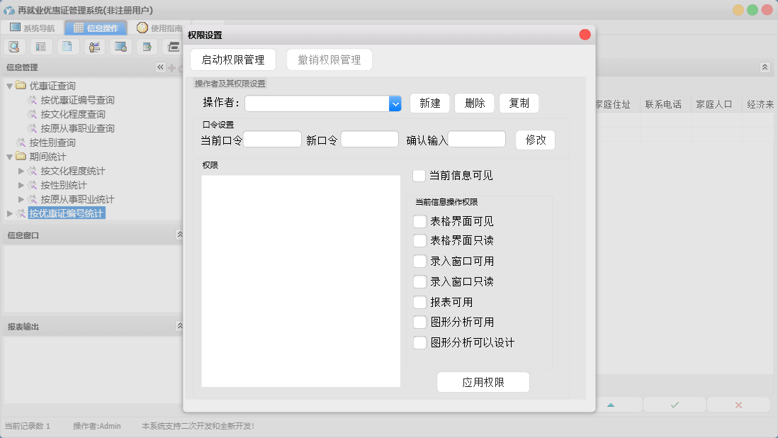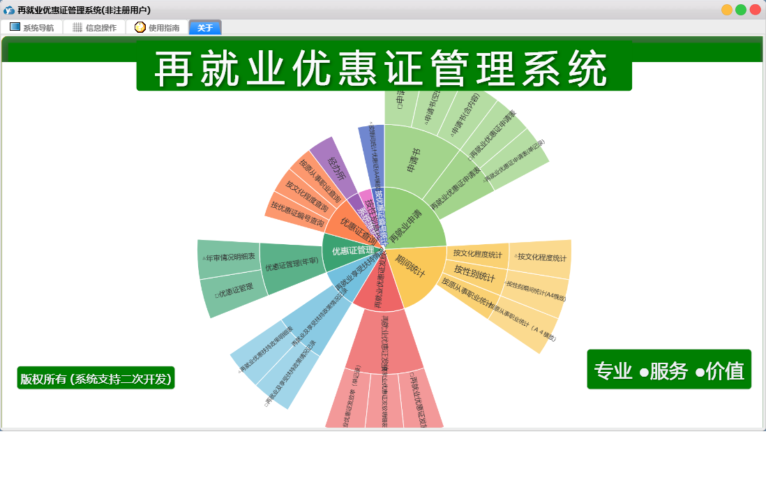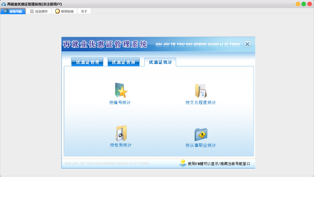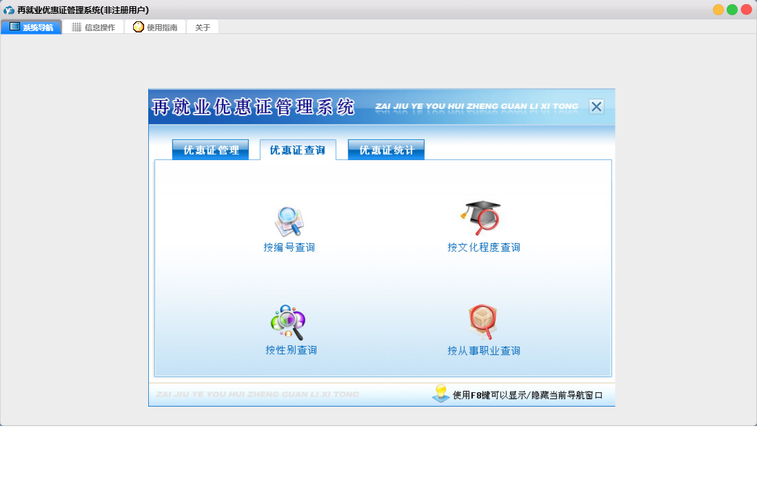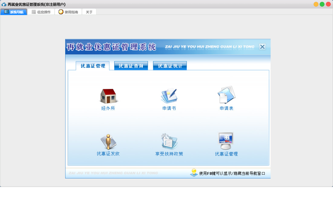 再就业优惠证管理系统包含以下功能:优惠证查询、优惠证管理(年审)、优惠证管理、日志、关于、权限设置、优惠证统计、再就业优惠证申请表、再就业及享受扶持政策情况记录、申请书、再就业优惠证发放等