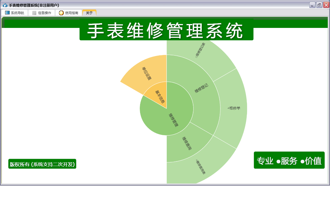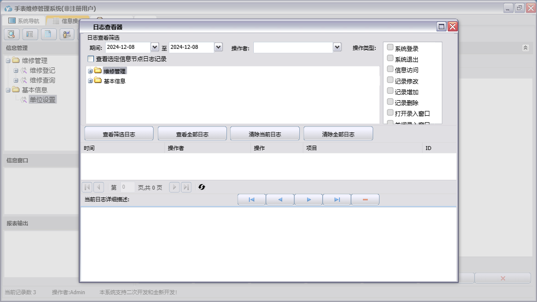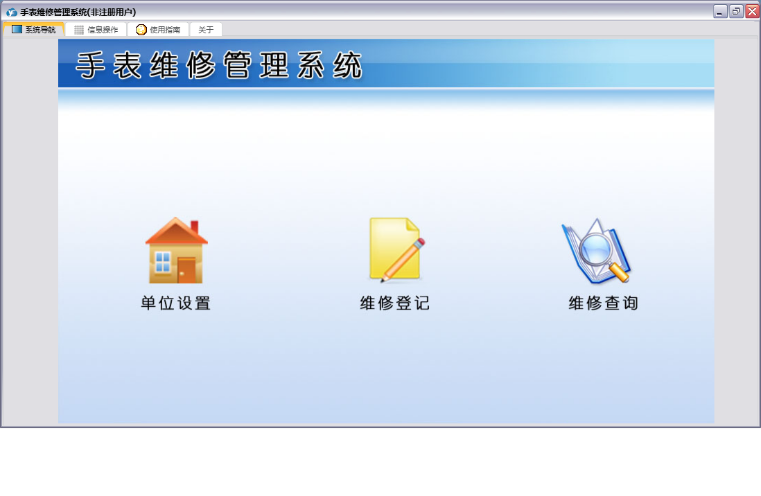 手表维修管理系统包含以下功能:维修管理、维修登记、日志、关于、权限设置等