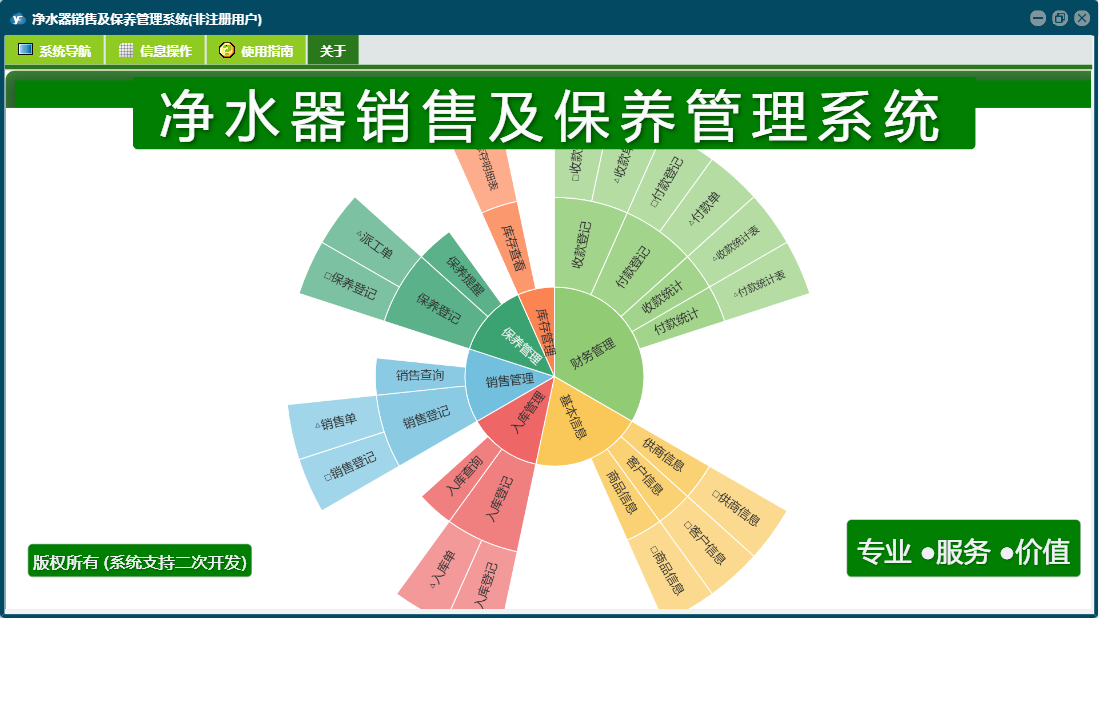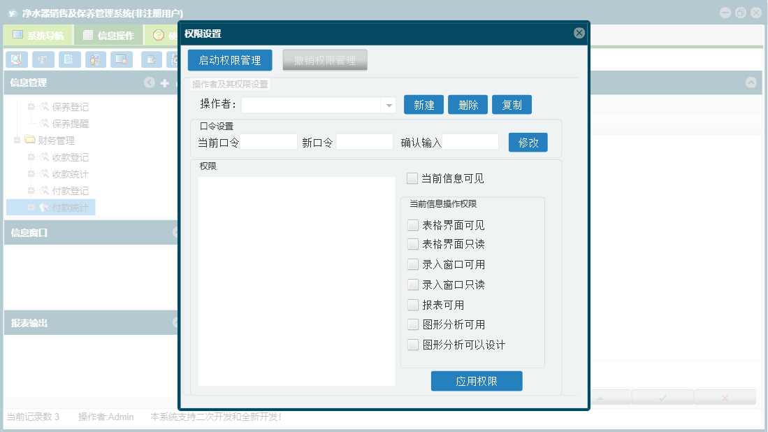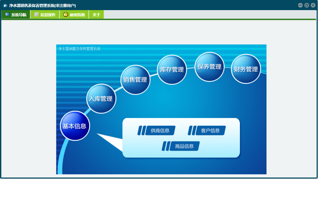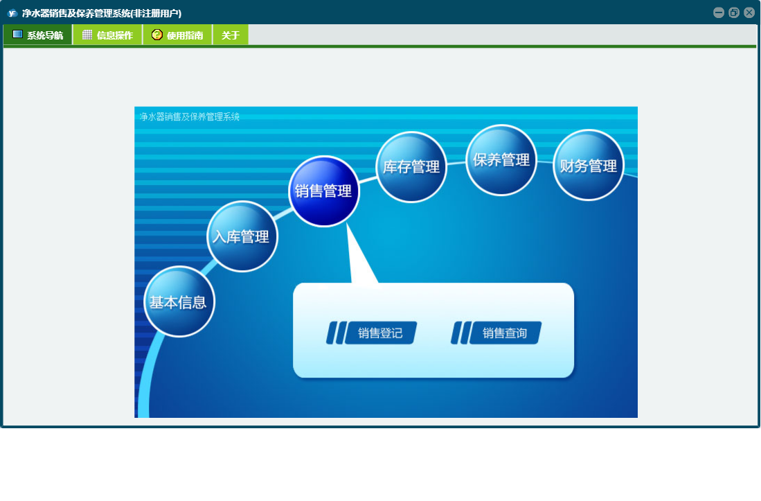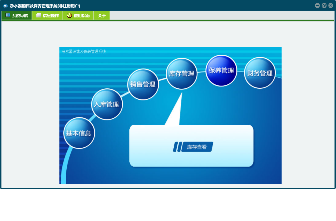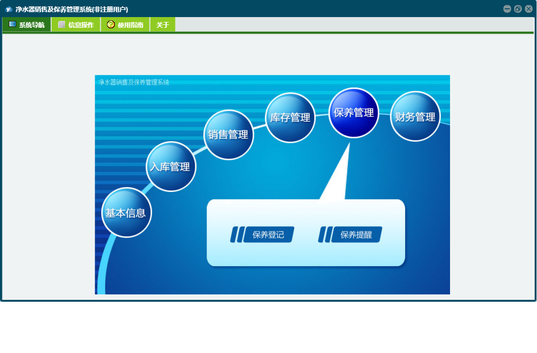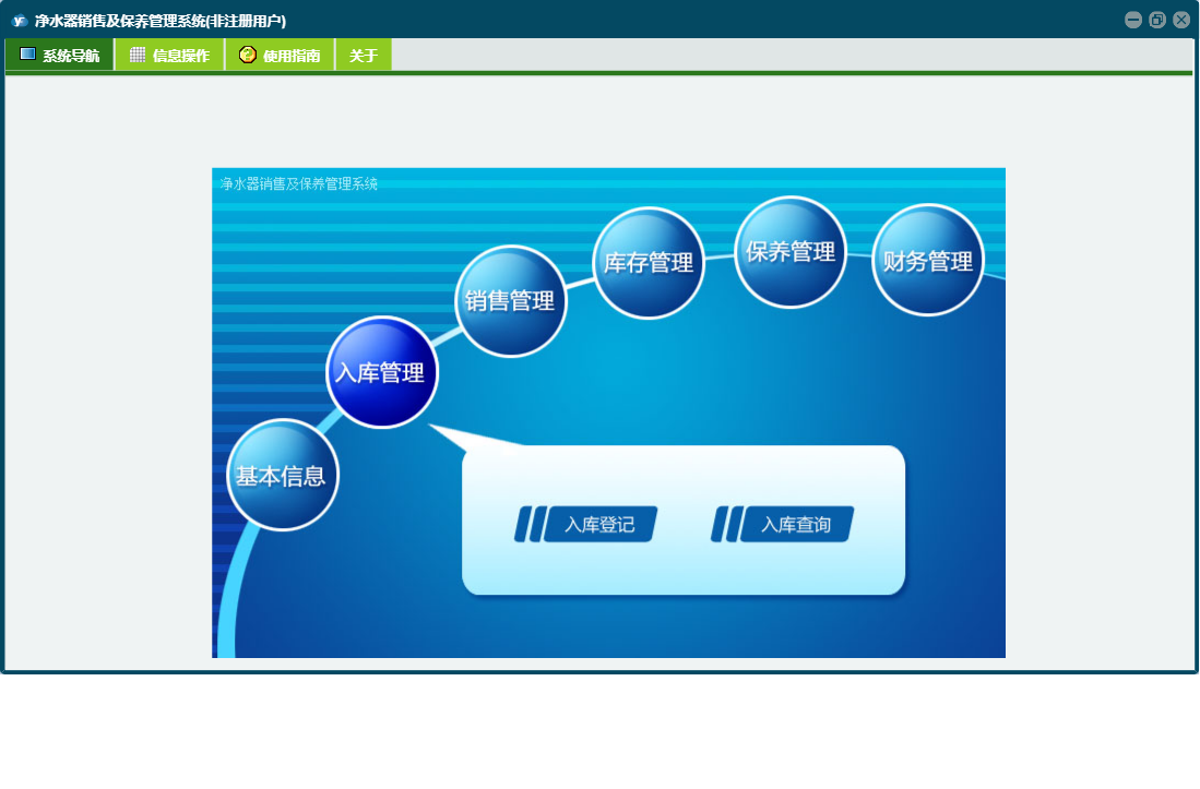 净水器销售及保养管理系统包含以下功能:入库管理、销售管理、保养登记、日志、库存管理、关于、权限设置、基本信息、保养管理、财务管理等
