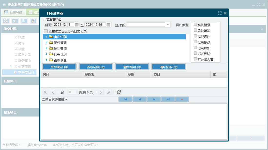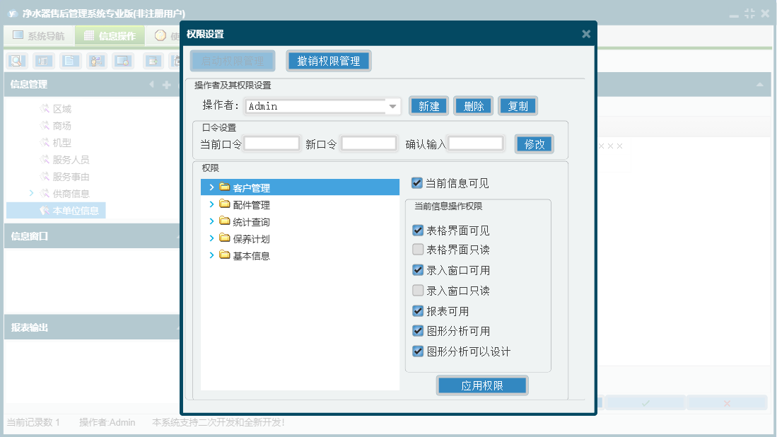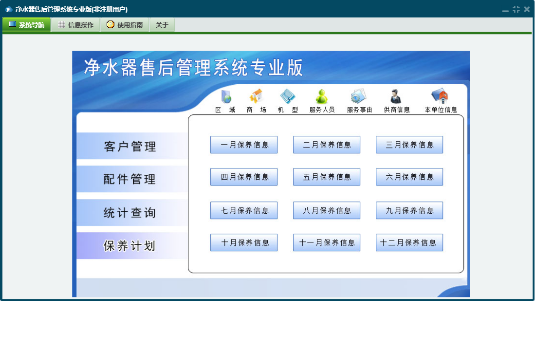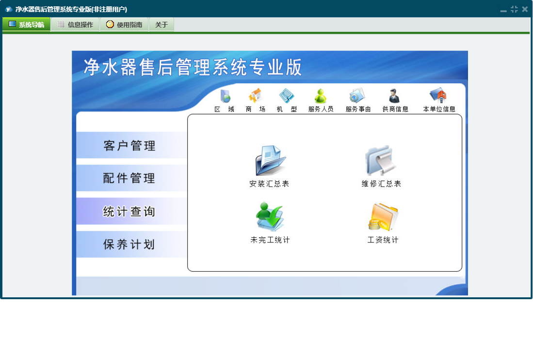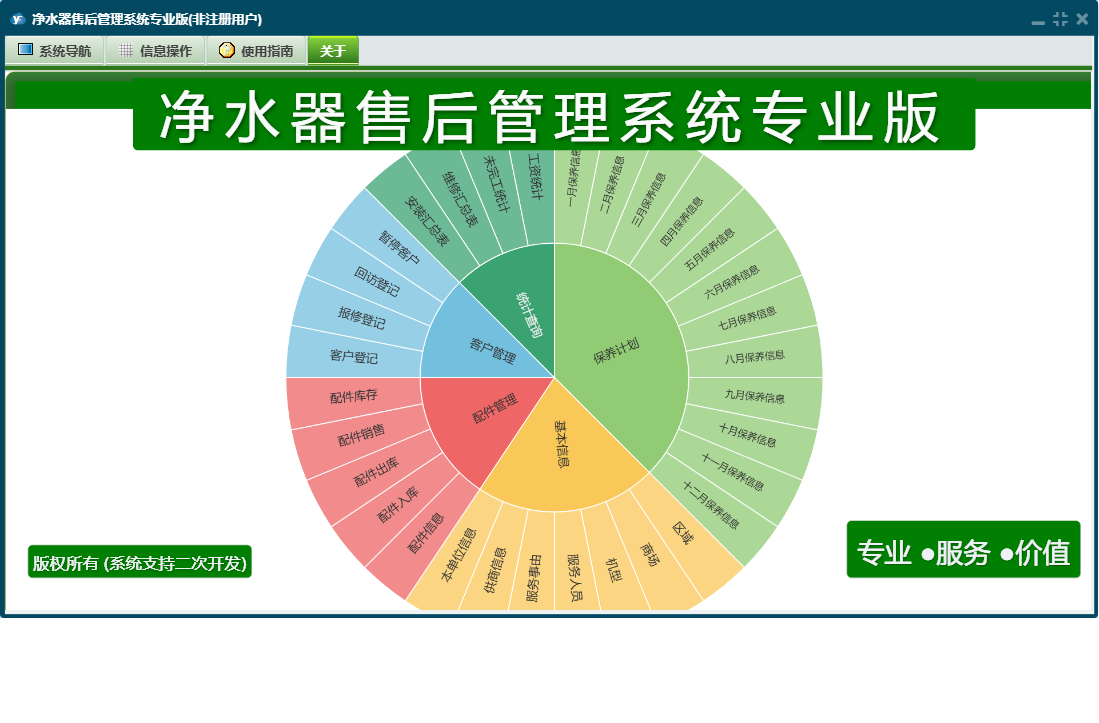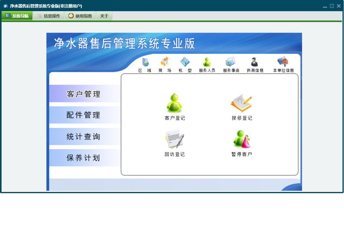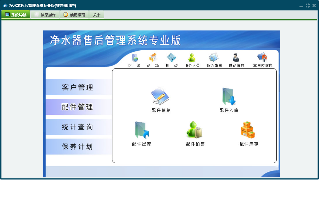净水器售后管理系统专业版包含以下功能:配件管理、日志、客户管理、关于、统计查询、权限设置、保养计划、报修登记、回访登记等