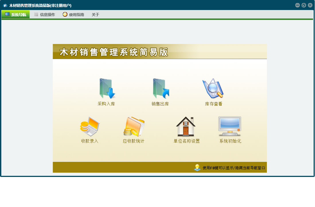 木材销售管理系统简易版包含以下功能:关于、主面板等