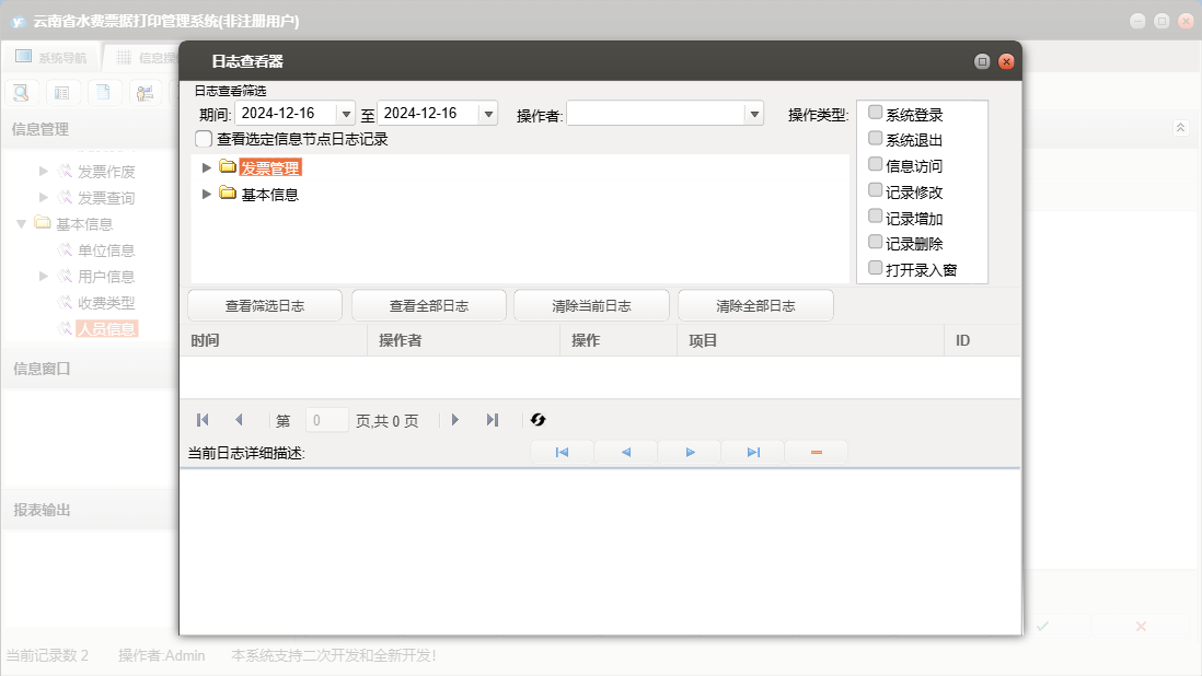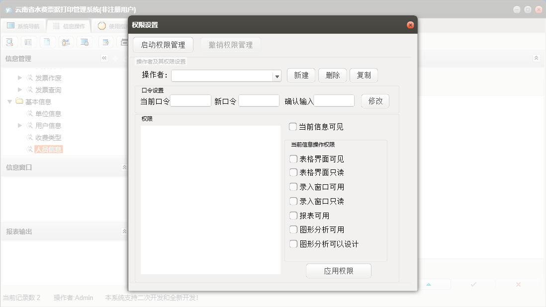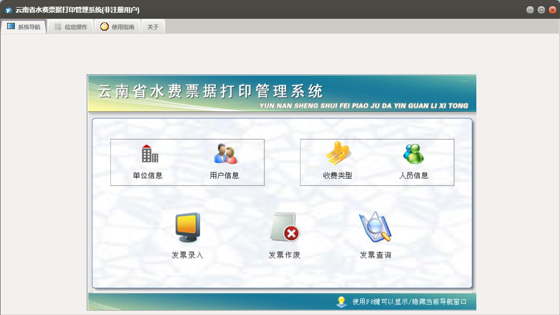 云南省水费票据打印管理系统包含以下功能:发票作废、用户信息、日志、发票查询、关于、权限设置、发票录入、主等
