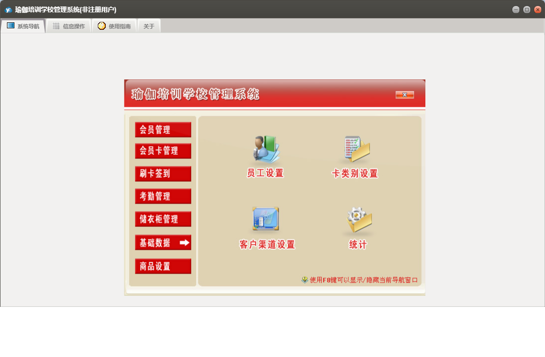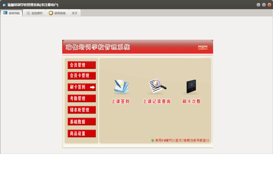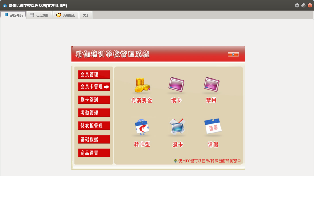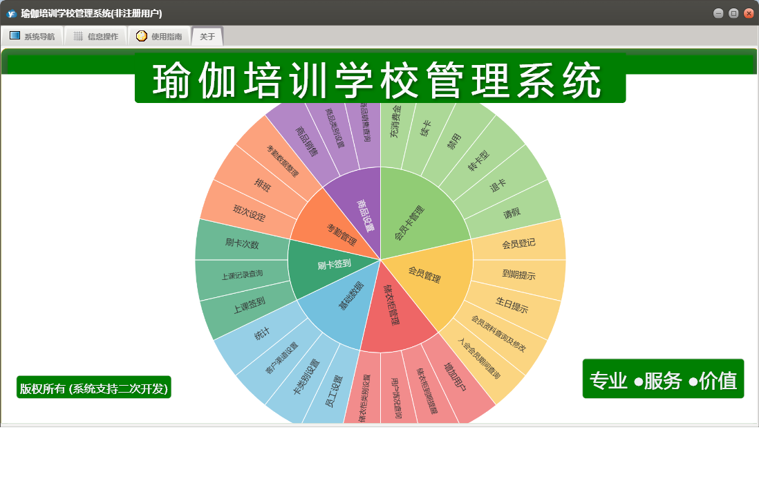 瑜伽培训学校管理系统包含以下功能:1、上课签到、退卡、续卡、请假、2、充消费金、员工设置、考勤数据整理、权限设置、储衣柜类别设置、转卡型、3、排班、客户渠道设置、商品类别设置、5、6、关于、班次设定、会员登记、会员资料查询及修改、商品销售、7、禁用、日志、增加用户、到期提示、4等
