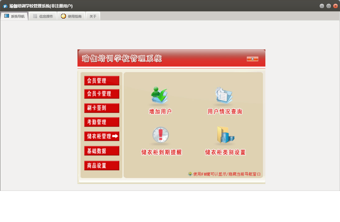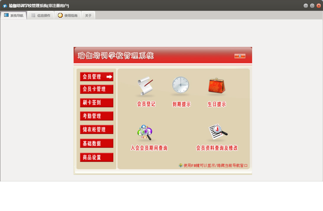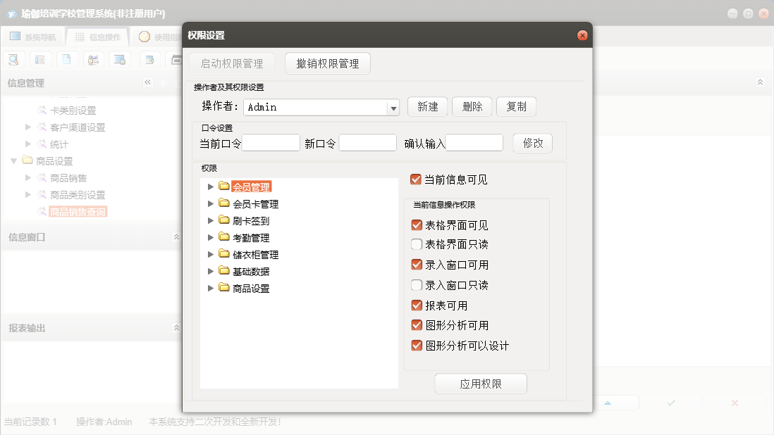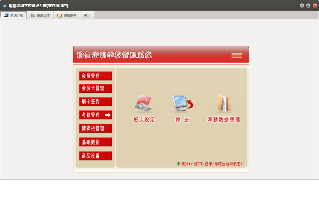 瑜伽培训学校管理系统包含以下功能:1、上课签到、退卡、续卡、请假、2、充消费金、员工设置、考勤数据整理、权限设置、储衣柜类别设置、转卡型、3、排班、客户渠道设置、商品类别设置、5、6、关于、班次设定、会员登记、会员资料查询及修改、商品销售、7、禁用、日志、增加用户、到期提示、4等