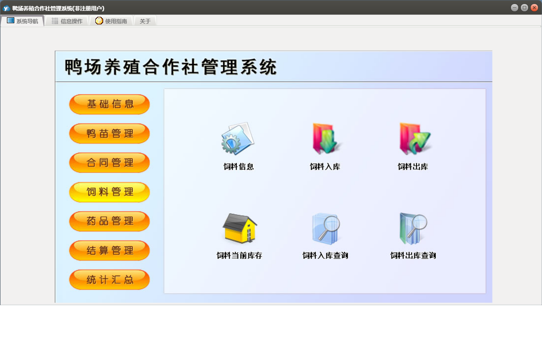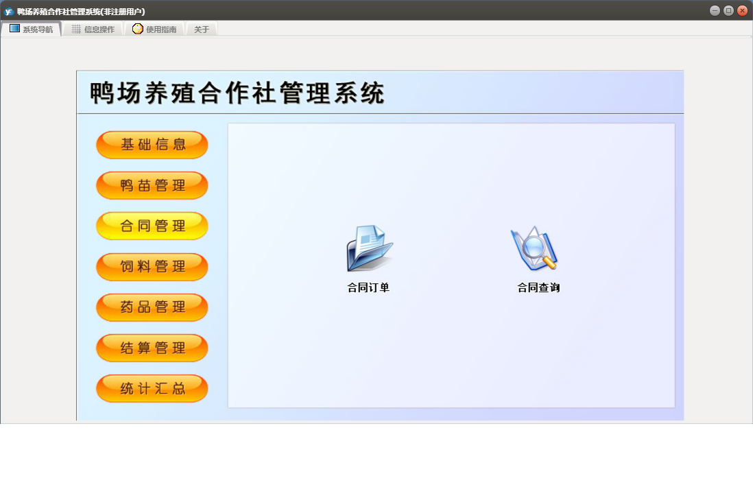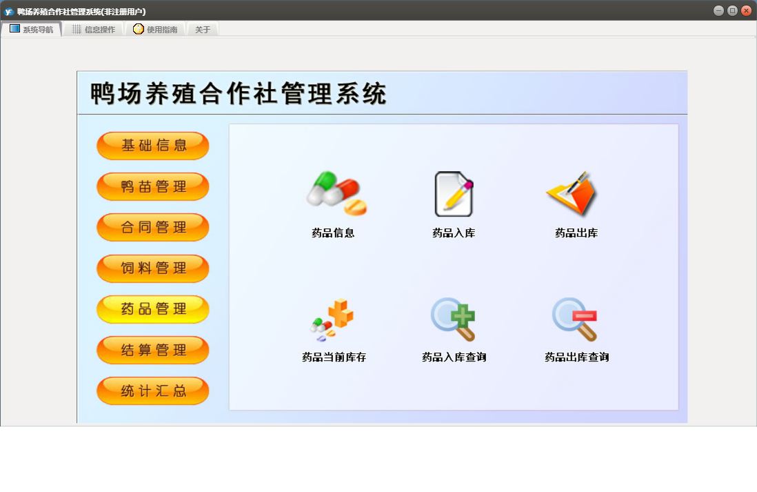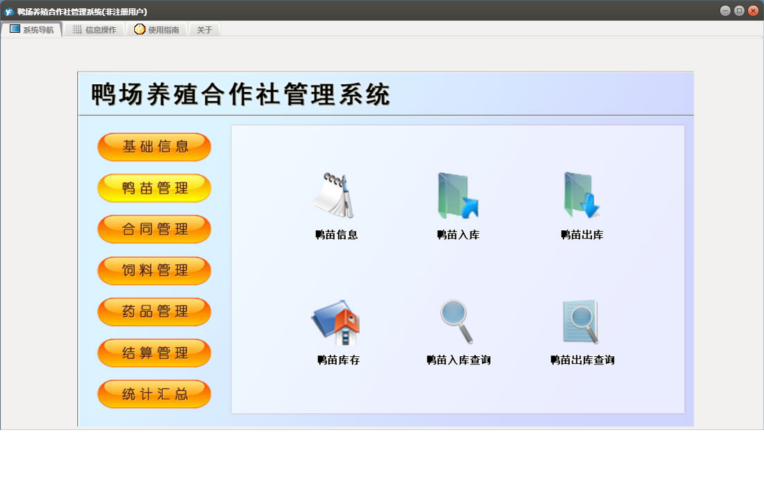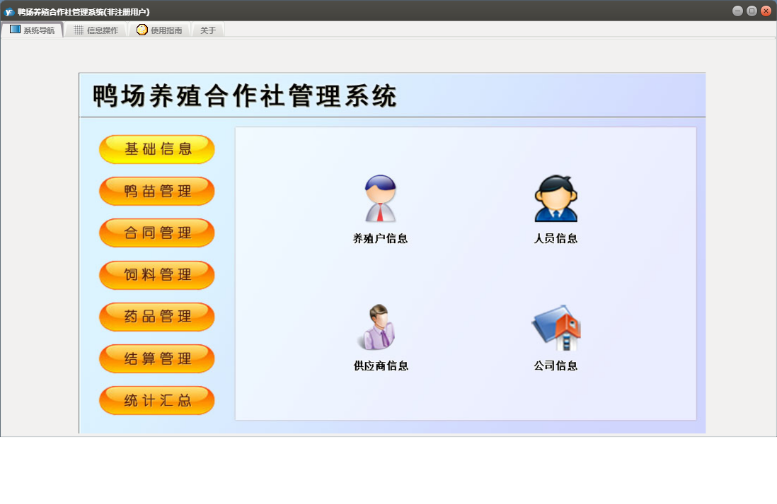 鸭场养殖合作社管理系统包含以下功能:合同订单、鸭苗入库、药品管理、统计汇总、调料登记、药品入库、结算单、养殖户信息、权限设置、饲料信息、供应商信息、药品信息、结算管理、鸭苗信息、关于、合同管理、药品出库、饲料管理、基础信息、鸭苗管理、鸭苗出库、日志、饲料出库、饲料入库、人员信息等